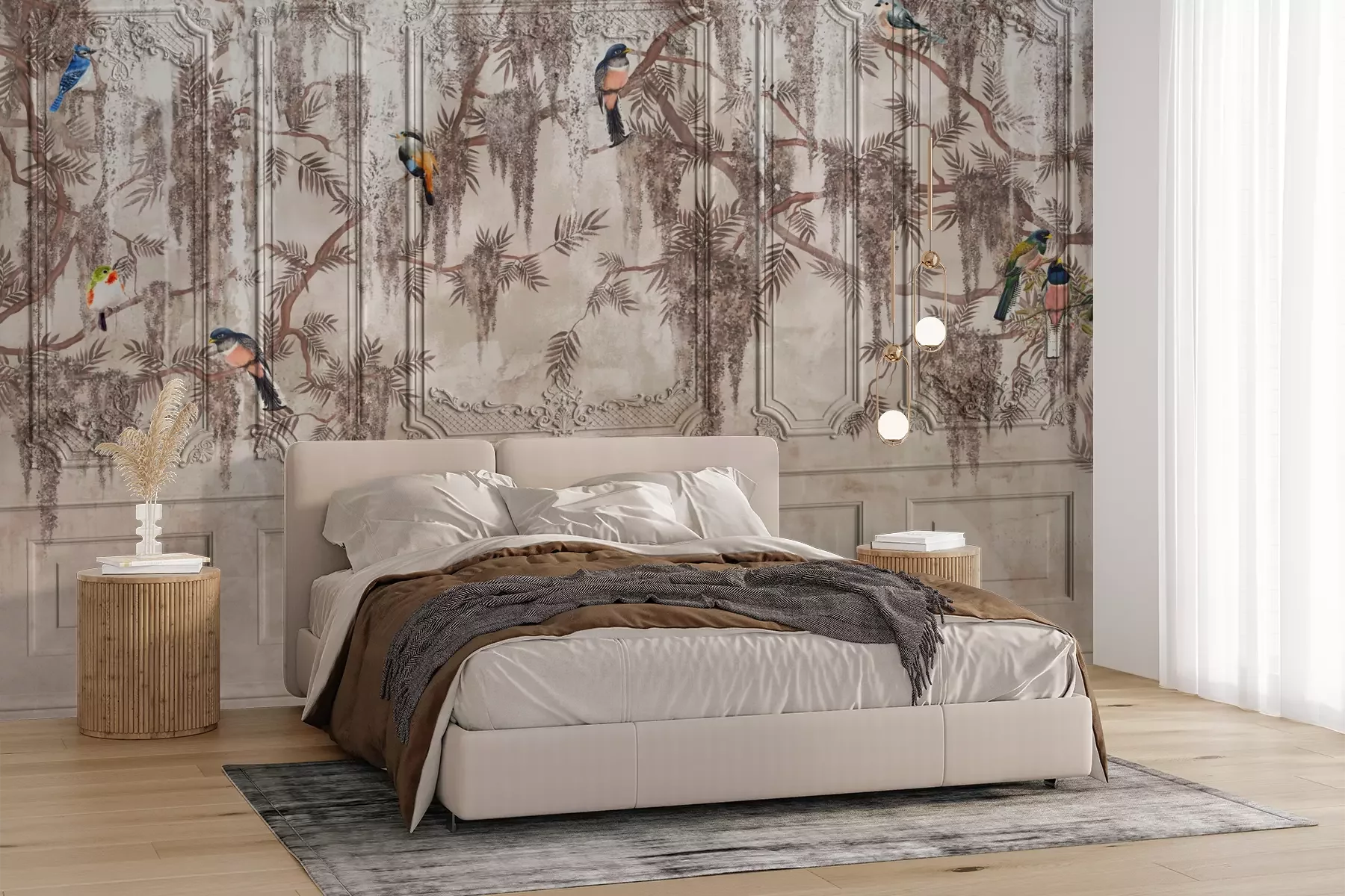Het materiaal Premium+ is een gestructureerd vinyl op vlies met een gewicht van 255 g/m², dat kleine oneffenheden in de muur effectief camoufleert. De subtiele structuur van fijn zand geeft het oppervlak een exclusieve uitstraling, terwijl de halfmatte afwerking de diepte van de kleuren benadrukt. Het materiaal is dampdoorlatend, waardoor het ook in de keuken en badkamer kan worden gebruikt. De maximale breedte van één baan bedraagt 100 cm – bij grotere afmetingen wordt het fotobehang in meerdere gelijke banen verdeeld. De lijm wordt direct op de muur aangebracht en het behang wordt rand-aan-rand geplakt, wat zorgt voor een esthetisch resultaat zonder zichtbare naden. Het oppervlak kan gemakkelijk worden schoongemaakt door het voorzichtig af te nemen met een vochtige doek.