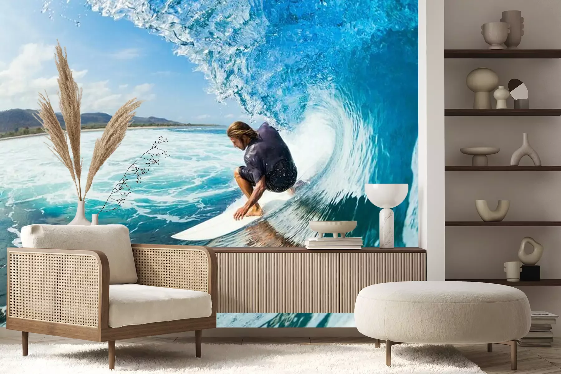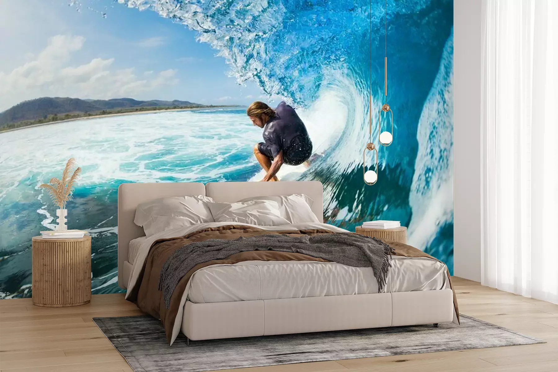Het materiaal Premium+ is een gestructureerd vinyl op vlies met een gewicht van 255 g/m², dat kleine oneffenheden in de muur effectief camoufleert. De subtiele structuur van fijn zand geeft het oppervlak een exclusieve uitstraling, terwijl de halfmatte afwerking de diepte van de kleuren benadrukt. Het materiaal is dampdoorlatend, waardoor het ook in de keuken en badkamer kan worden gebruikt. De maximale breedte van één baan bedraagt 100 cm – bij grotere afmetingen wordt het fotobehang in meerdere gelijke banen verdeeld. De lijm wordt direct op de muur aangebracht en het behang wordt rand-aan-rand geplakt, wat zorgt voor een esthetisch resultaat zonder zichtbare naden. Het oppervlak kan gemakkelijk worden schoongemaakt door het voorzichtig af te nemen met een vochtige doek.