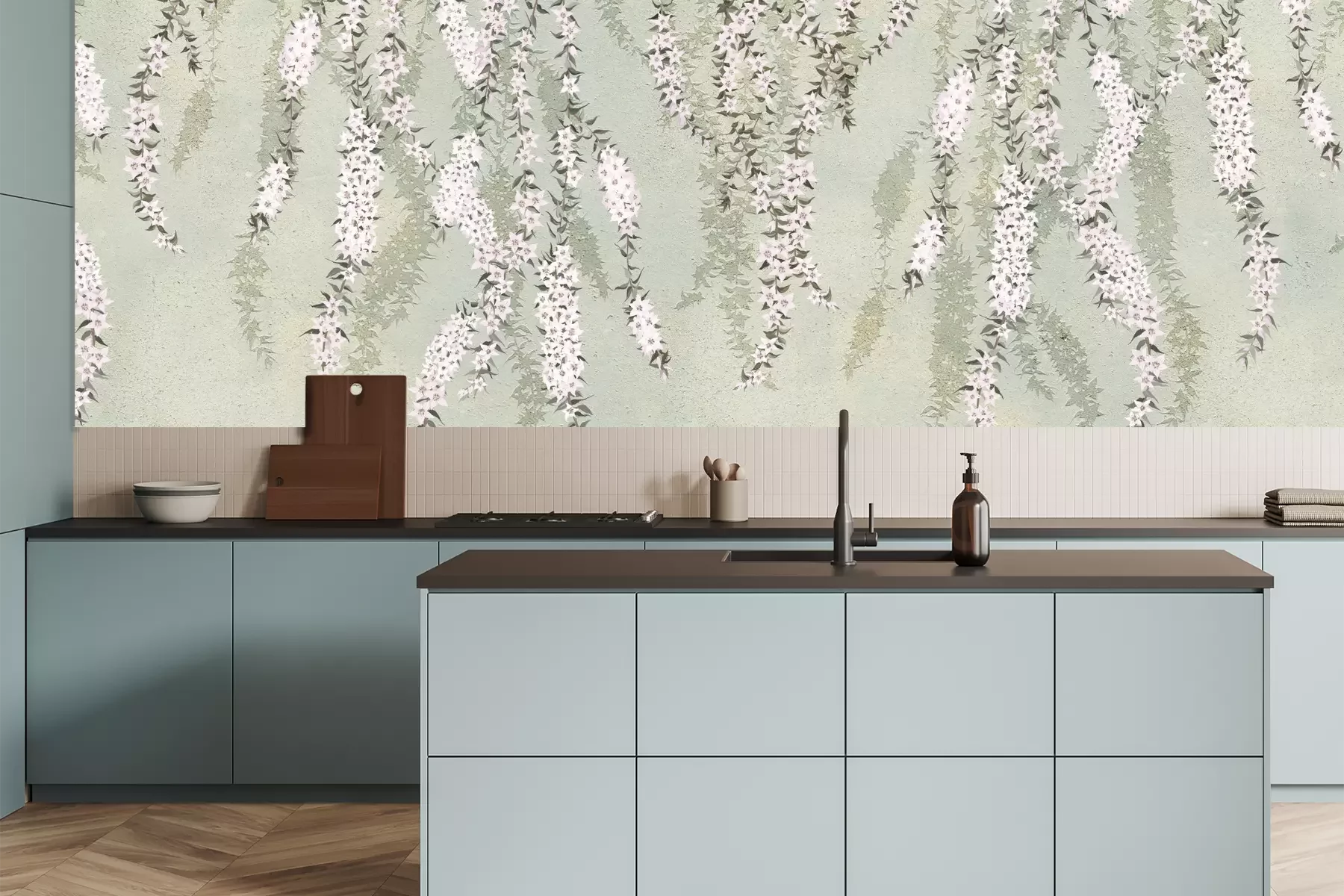 Het materiaal Premium is een glad vinyl op vlies, dat bestand is tegen uitrekken en vervorming. Het is dampdoorlatend – de muren kunnen vrij ademen – waardoor het geschikt is voor gebruik in de keuken en badkamer. Bij vervuiling kan het materiaal worden afgenomen met een vochtige doek. De maximale breedte van één baan bedraagt 95 of 105 cm, afhankelijk van de beschikbaarheid. Montage vindt plaats met de rand-aan-rand methode, wat een esthetisch resultaat zonder zichtbare naden oplevert. Omdat de lijm rechtstreeks op de muur wordt aangebracht, verloopt de installatie van het fotobehang snel en eenvoudig.