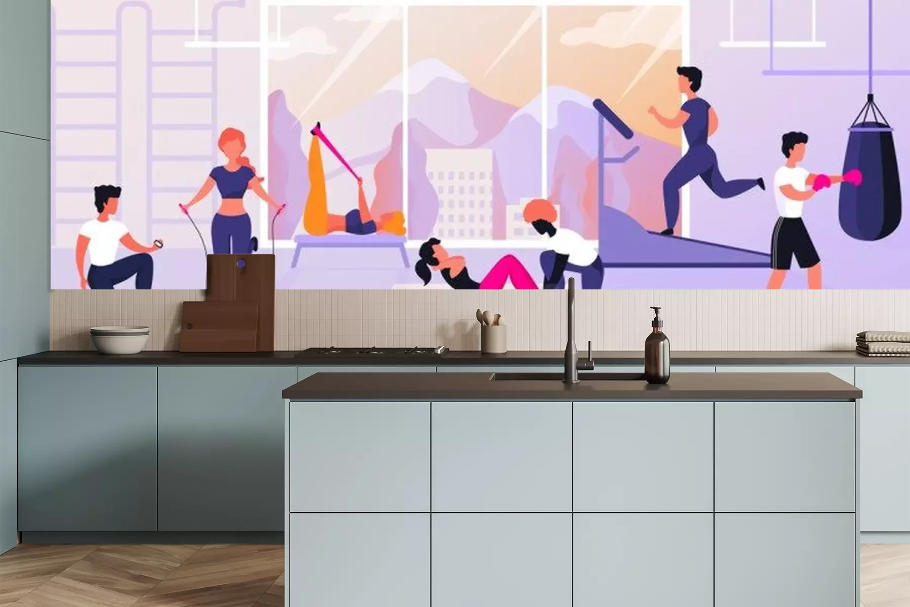 Fotobehang Tekenfiguren tijdens oefeningen in fitnessclub