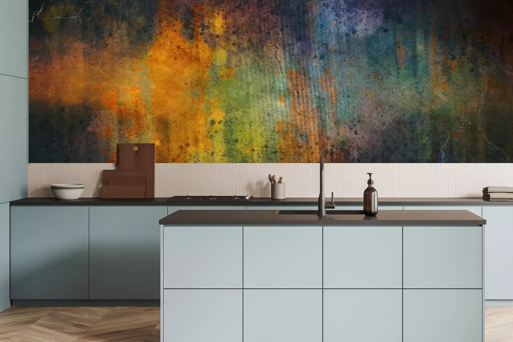 Het materiaal Premium is een glad vinyl op vlies, dat bestand is tegen uitrekken en vervorming. Het is dampdoorlatend – de muren kunnen vrij ademen – waardoor het geschikt is voor gebruik in de keuken en badkamer. Bij vervuiling kan het materiaal worden afgenomen met een vochtige doek. De maximale breedte van één baan bedraagt 95 of 105 cm, afhankelijk van de beschikbaarheid. Montage vindt plaats met de rand-aan-rand methode, wat een esthetisch resultaat zonder zichtbare naden oplevert. Omdat de lijm rechtstreeks op de muur wordt aangebracht, verloopt de installatie van het fotobehang snel en eenvoudig.
