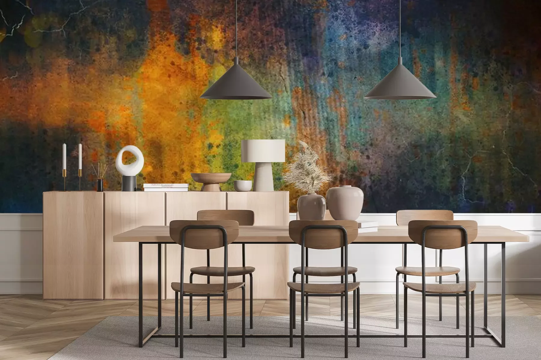 Het materiaal Premium+ is een gestructureerd vinyl op vlies met een gewicht van 255 g/m², dat kleine oneffenheden in de muur effectief camoufleert. De subtiele structuur van fijn zand geeft het oppervlak een exclusieve uitstraling, terwijl de halfmatte afwerking de diepte van de kleuren benadrukt. Het materiaal is dampdoorlatend, waardoor het ook in de keuken en badkamer kan worden gebruikt. De maximale breedte van één baan bedraagt 100 cm – bij grotere afmetingen wordt het fotobehang in meerdere gelijke banen verdeeld. De lijm wordt direct op de muur aangebracht en het behang wordt rand-aan-rand geplakt, wat zorgt voor een esthetisch resultaat zonder zichtbare naden. Het oppervlak kan gemakkelijk worden schoongemaakt door het voorzichtig af te nemen met een vochtige doek.