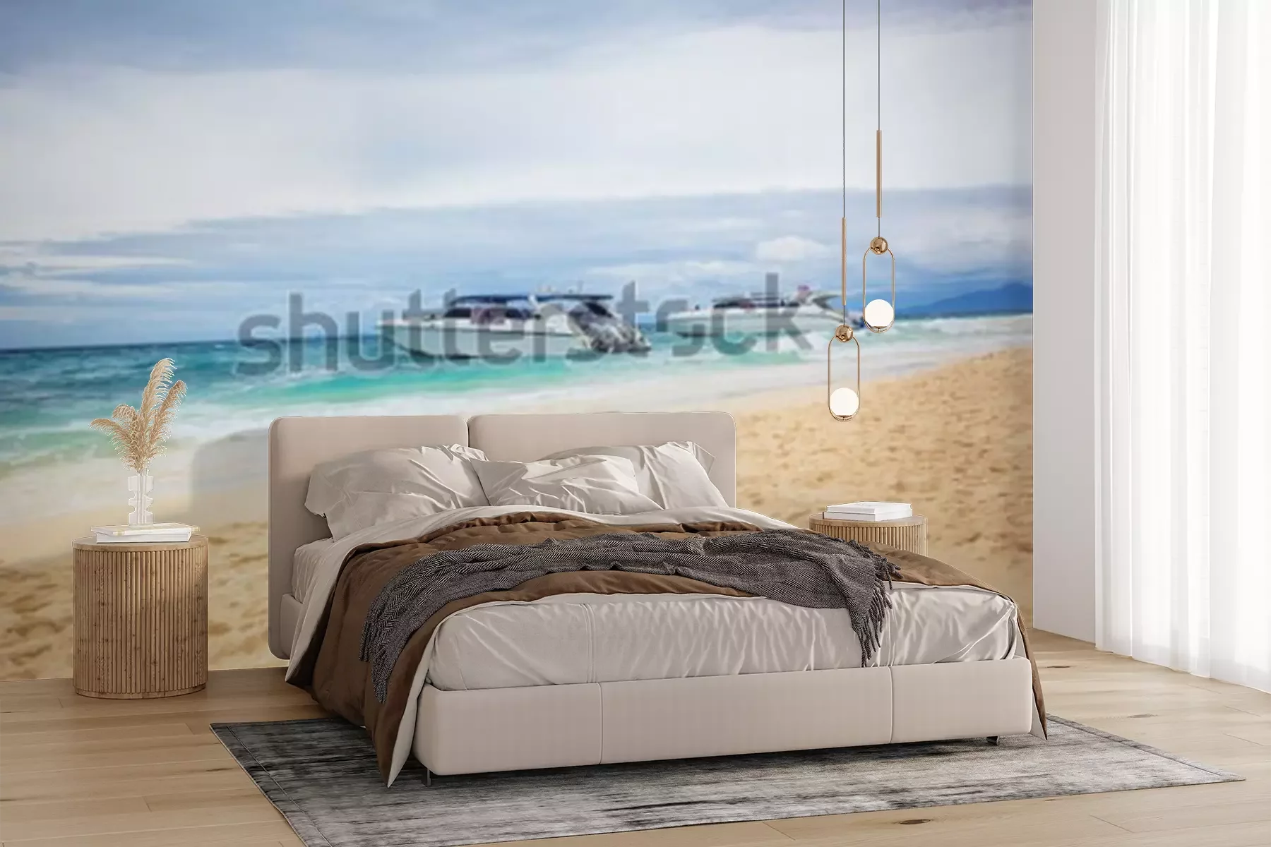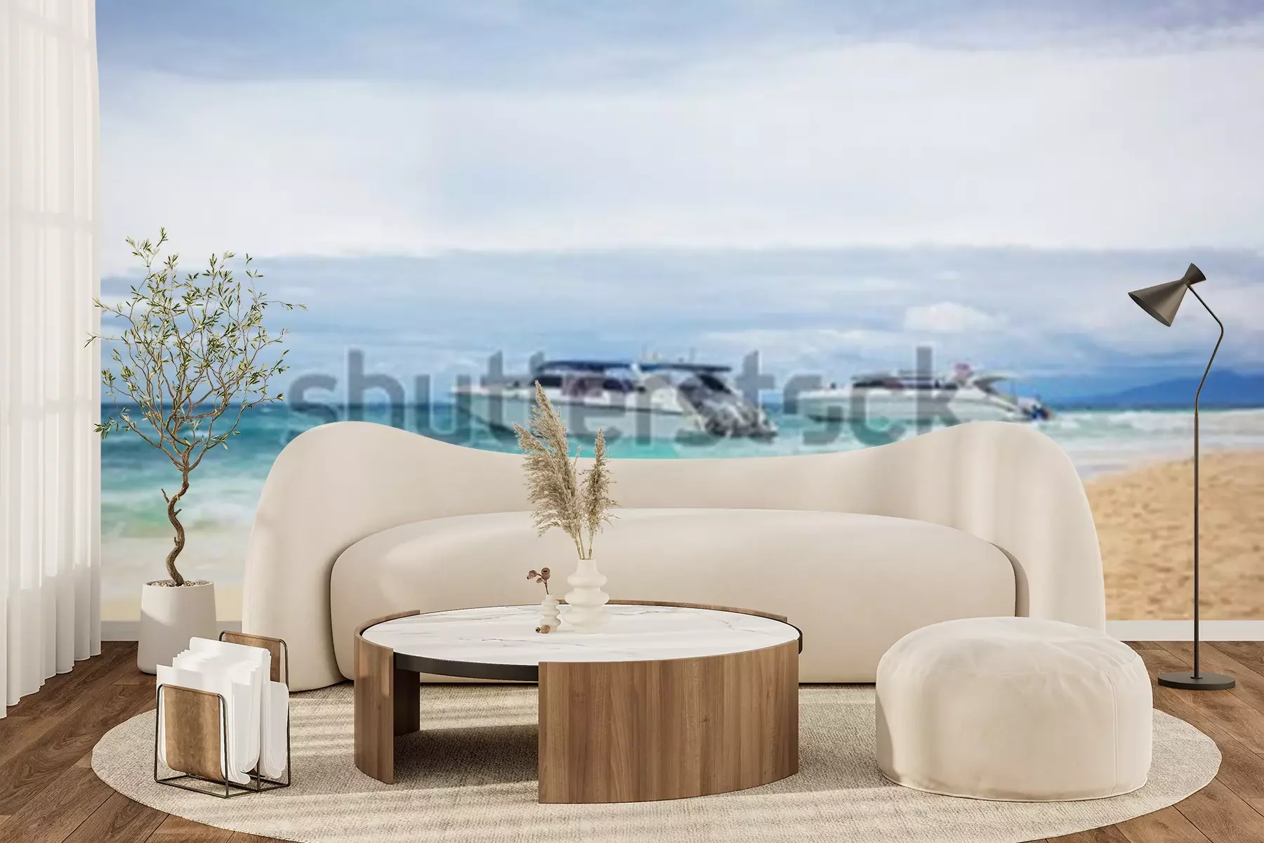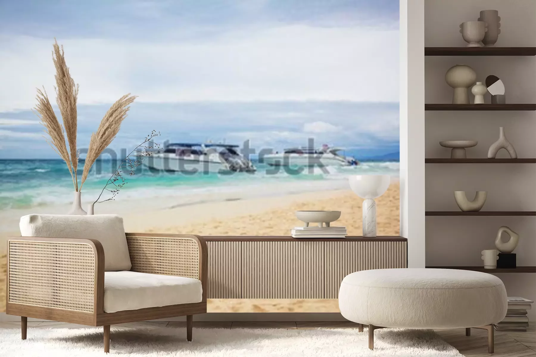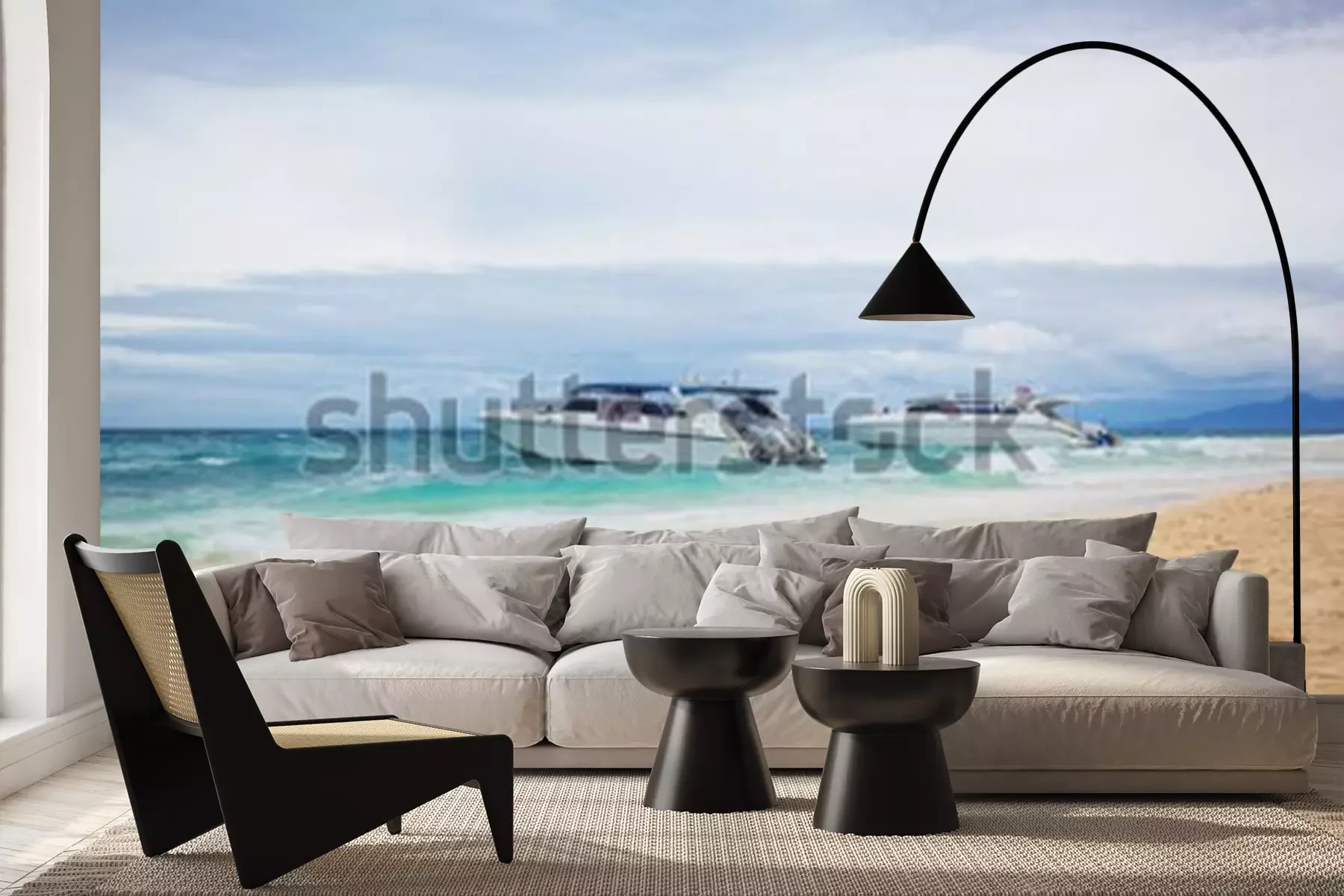 Fotobehang The cruise boats on the beach. The cruise boats parked near the sandy shore. Horizontal outdoors shot.