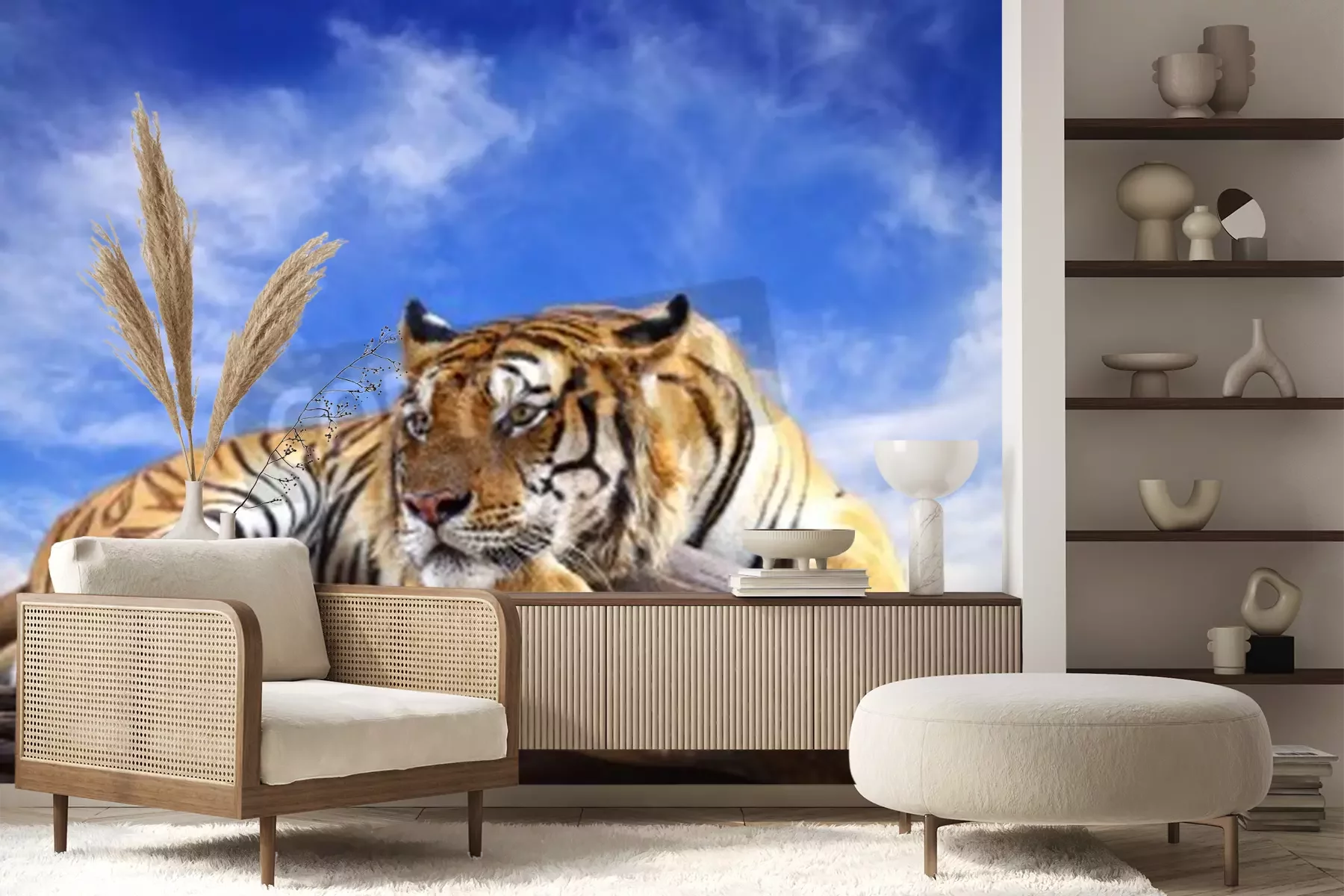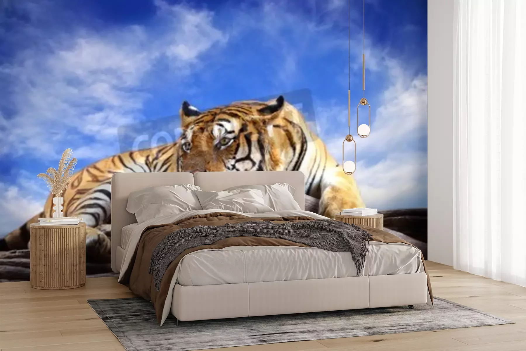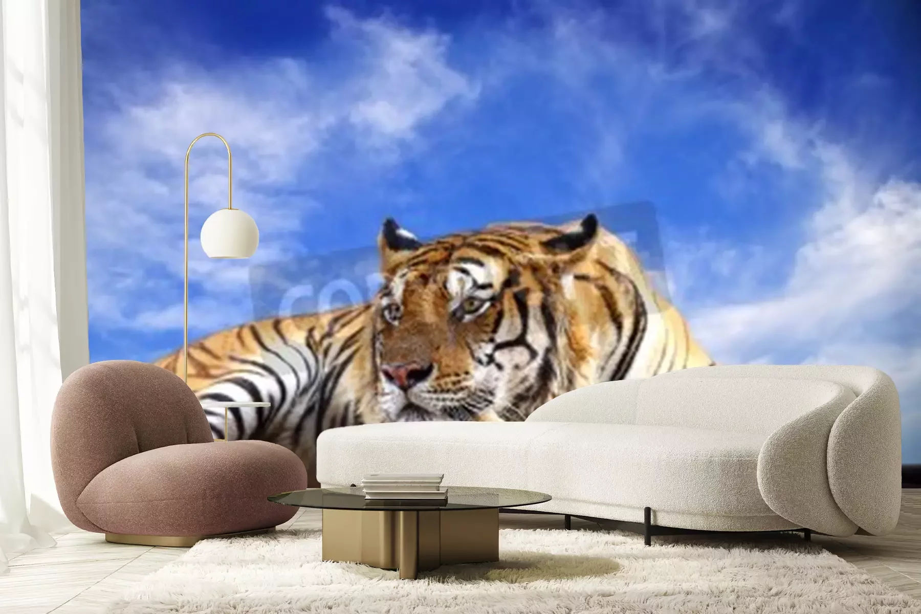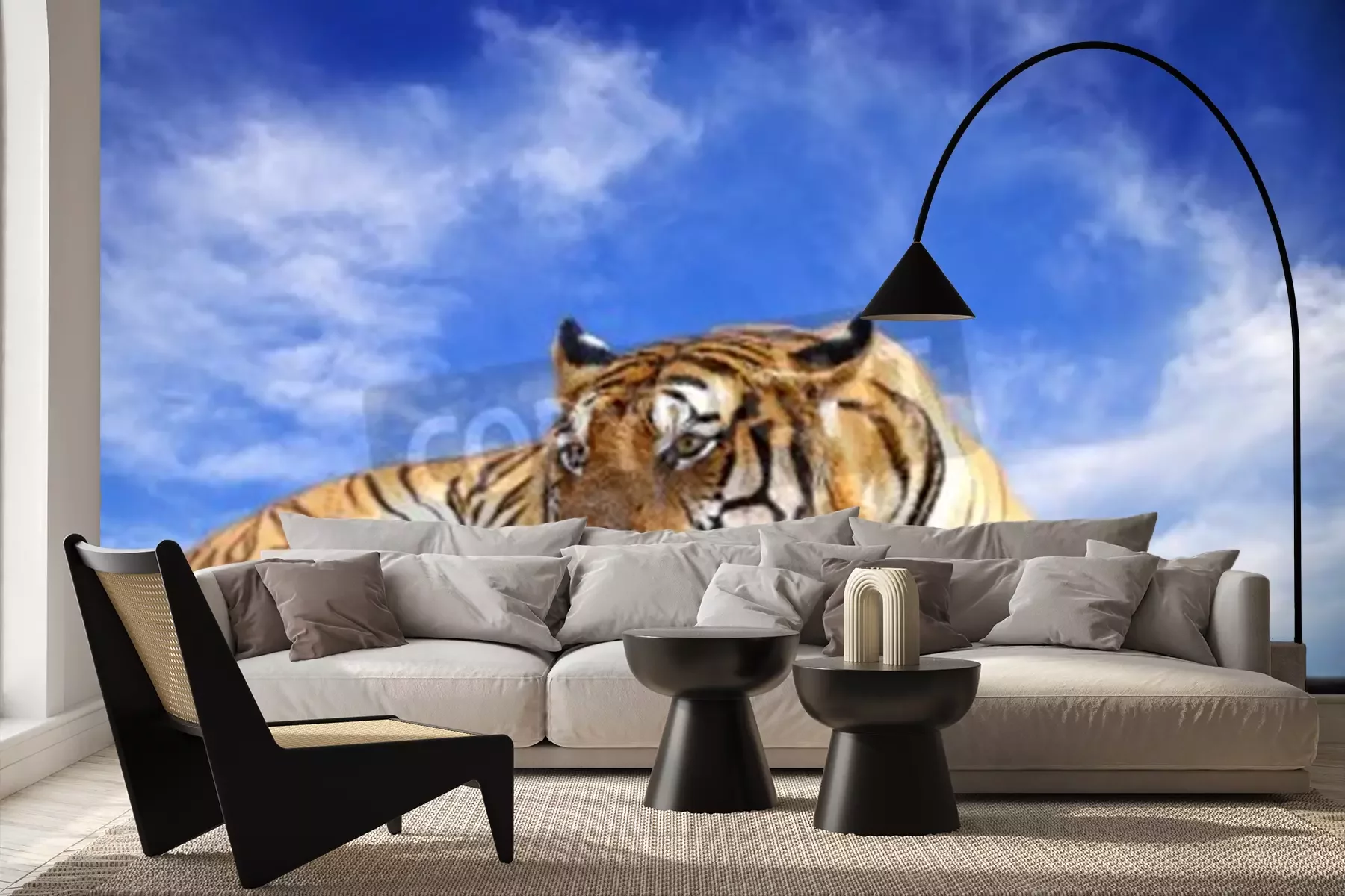 Fotobehang Tijger op achtergrond van de blauwe hemel