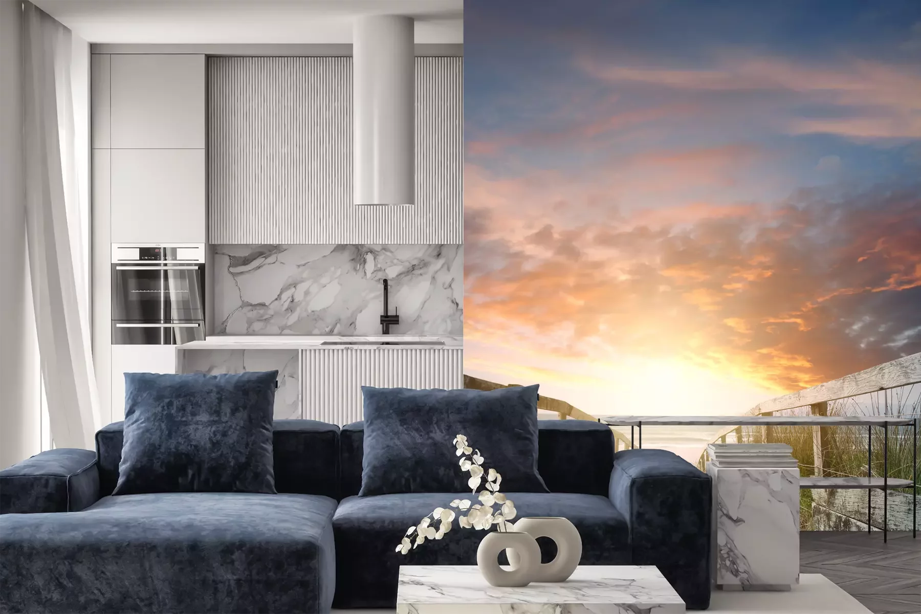 Het materiaal Premium+ is een gestructureerd vinyl op vlies met een gewicht van 255 g/m², dat kleine oneffenheden in de muur effectief camoufleert. De subtiele structuur van fijn zand geeft het oppervlak een exclusieve uitstraling, terwijl de halfmatte afwerking de diepte van de kleuren benadrukt. Het materiaal is dampdoorlatend, waardoor het ook in de keuken en badkamer kan worden gebruikt. De maximale breedte van één baan bedraagt 100 cm – bij grotere afmetingen wordt het fotobehang in meerdere gelijke banen verdeeld. De lijm wordt direct op de muur aangebracht en het behang wordt rand-aan-rand geplakt, wat zorgt voor een esthetisch resultaat zonder zichtbare naden. Het oppervlak kan gemakkelijk worden schoongemaakt door het voorzichtig af te nemen met een vochtige doek.
