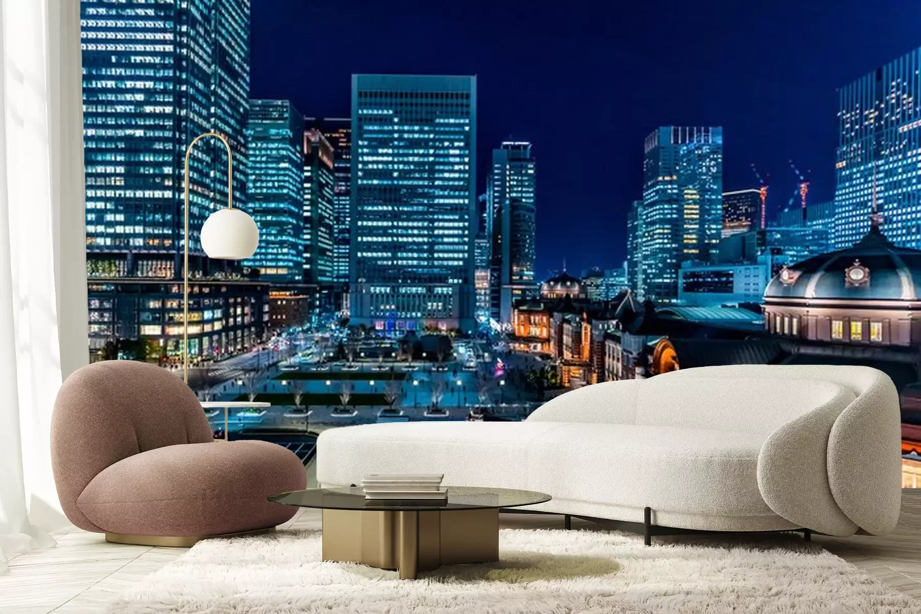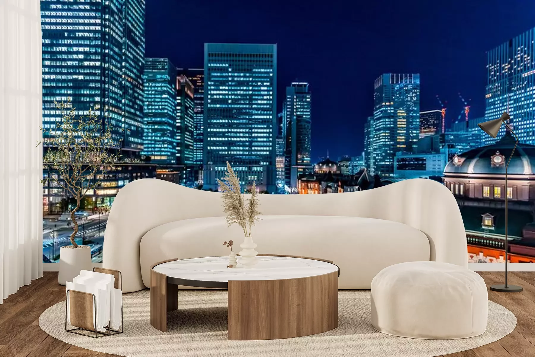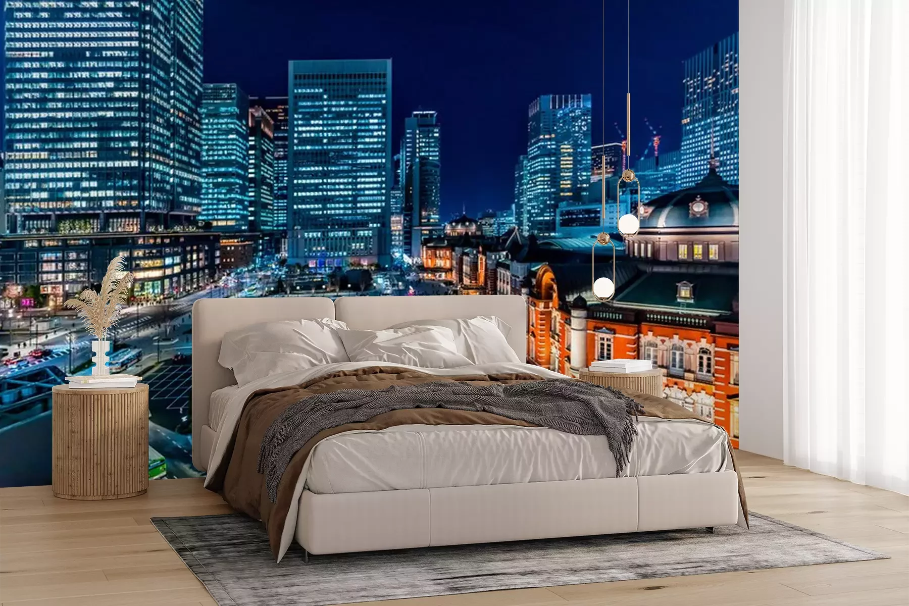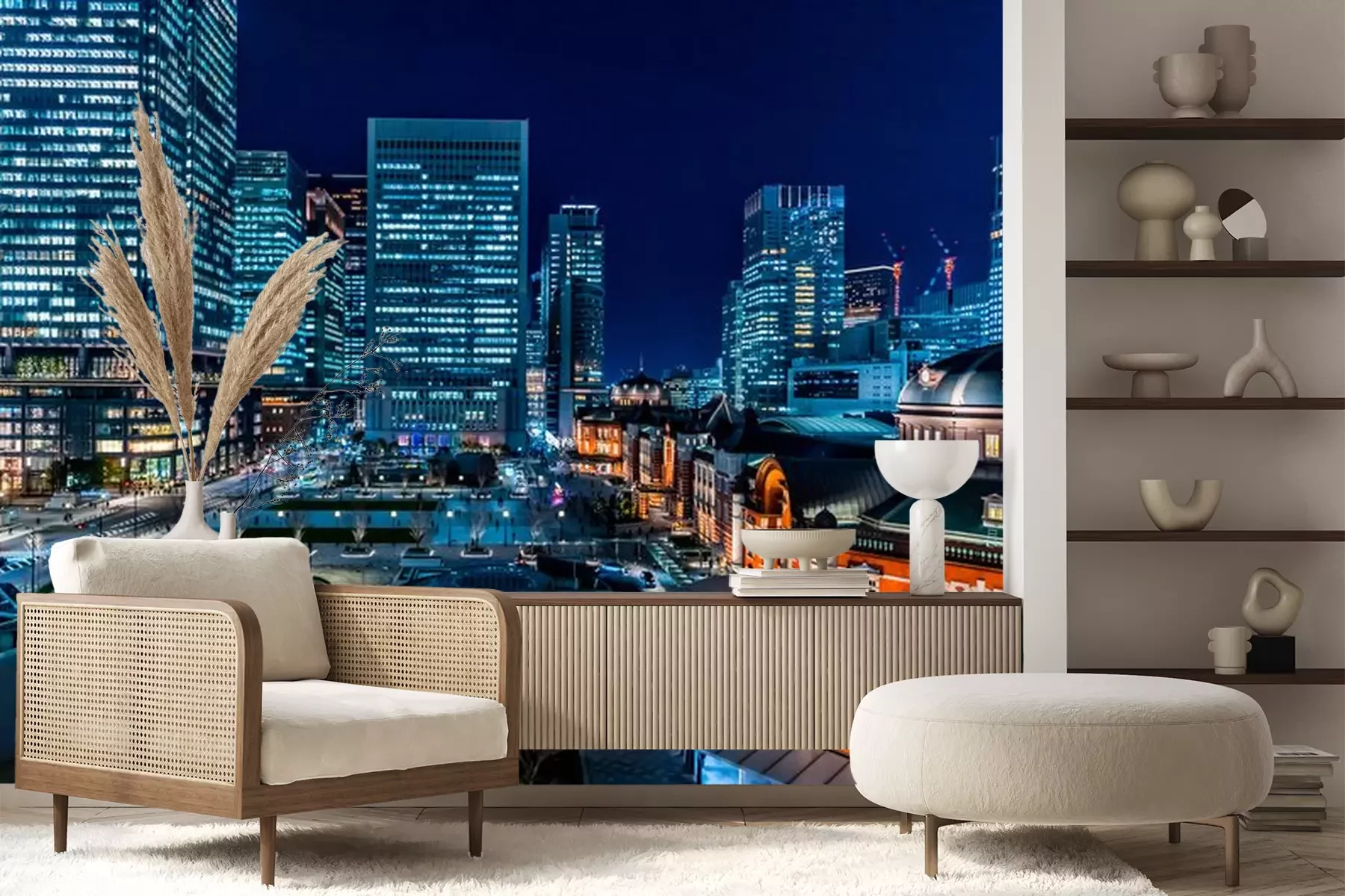 Fotobehang Tokio 's nachts en verlichte gebouwen