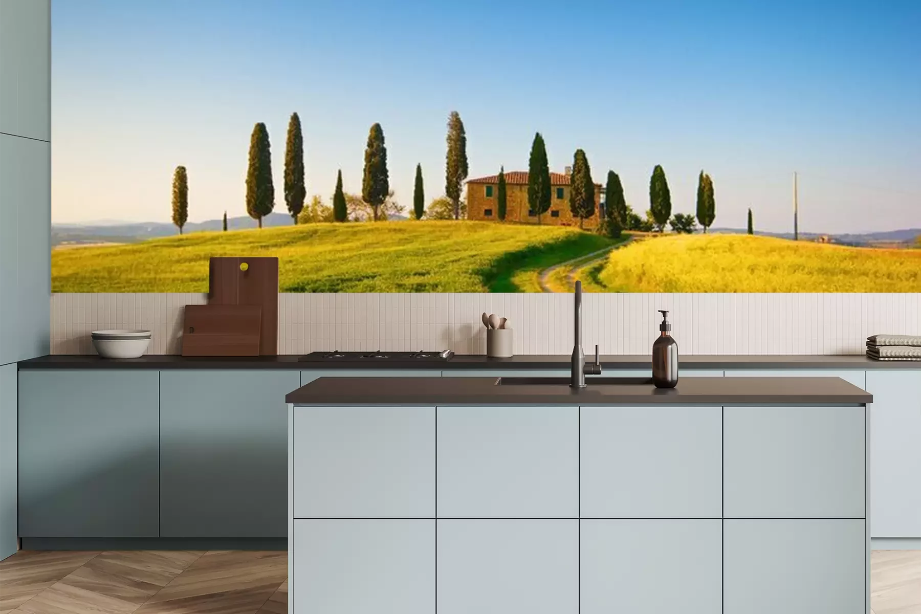 Het materiaal Premium is een glad vinyl op vlies, dat bestand is tegen uitrekken en vervorming. Het is dampdoorlatend – de muren kunnen vrij ademen – waardoor het geschikt is voor gebruik in de keuken en badkamer. Bij vervuiling kan het materiaal worden afgenomen met een vochtige doek. De maximale breedte van één baan bedraagt 95 of 105 cm, afhankelijk van de beschikbaarheid. Montage vindt plaats met de rand-aan-rand methode, wat een esthetisch resultaat zonder zichtbare naden oplevert. Omdat de lijm rechtstreeks op de muur wordt aangebracht, verloopt de installatie van het fotobehang snel en eenvoudig.