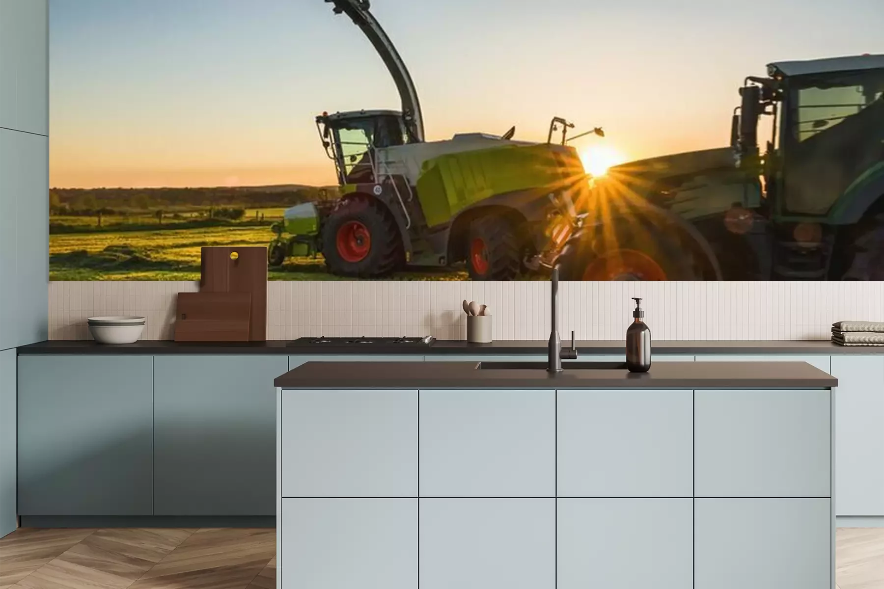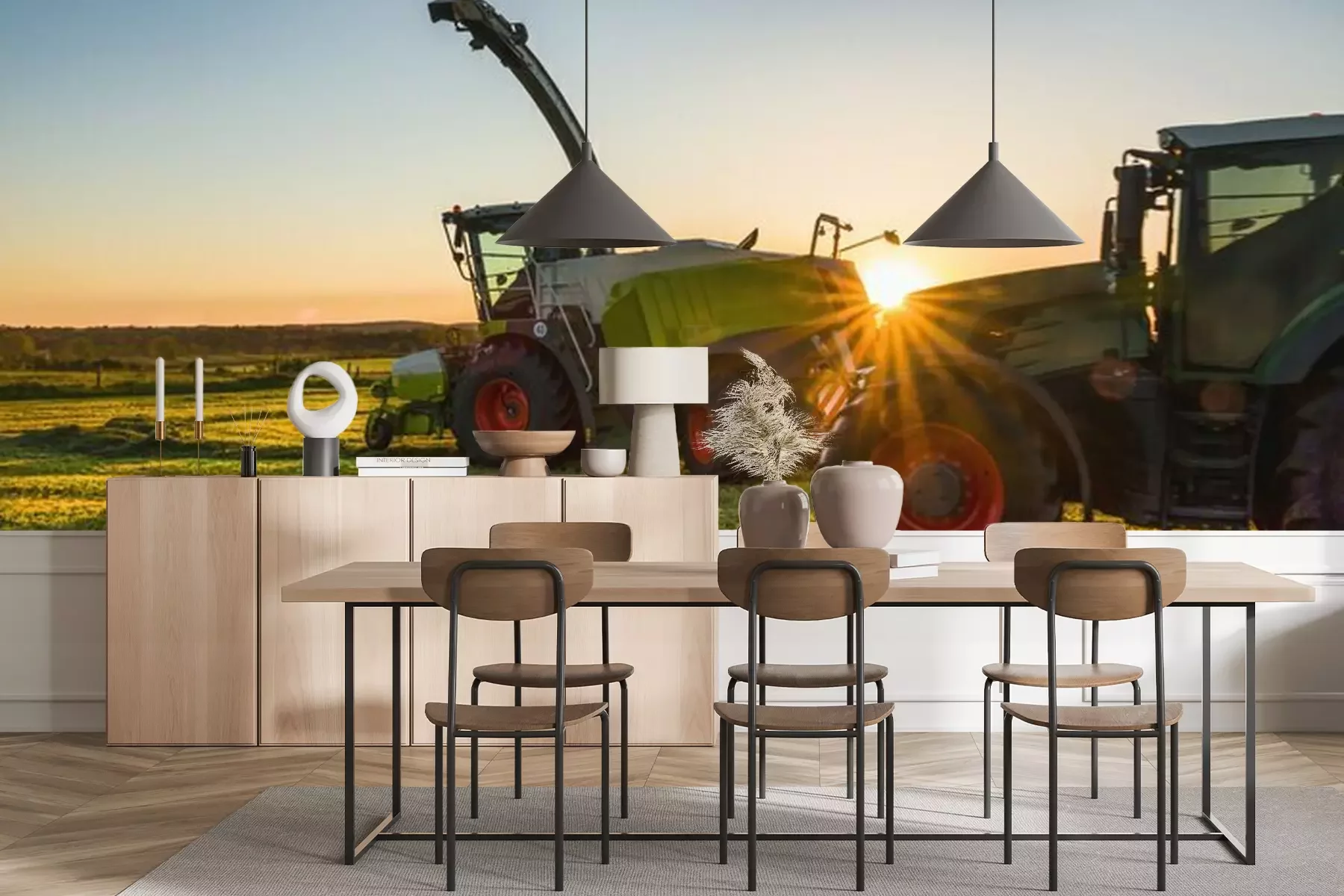 Fotobehang Tractor die landbouwkundige machines in zonnige dag werken