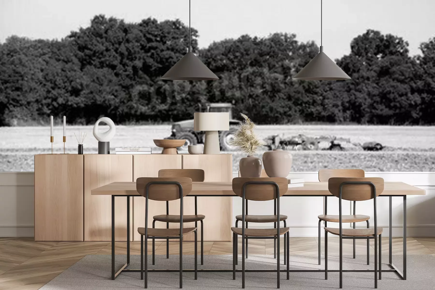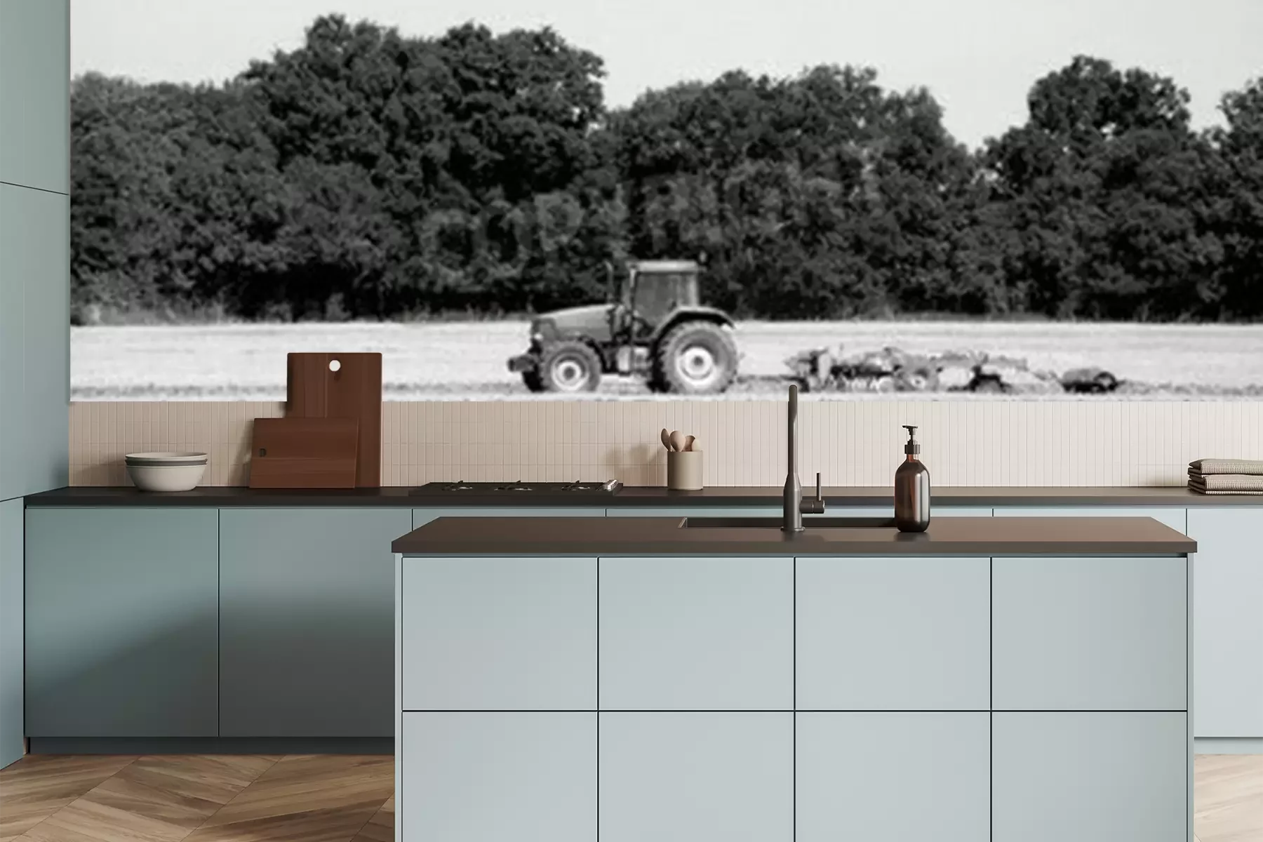 Fotobehang Tractor en schijveneg opbreken van de bodem na de oogst in een boerderij veld - Kent, Engeland - monochroom verwerking