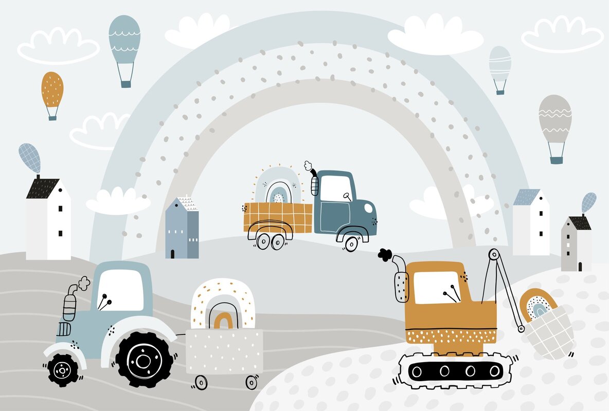 Fotobehang: Tractor op de heuvels met een graafmachine en wolken