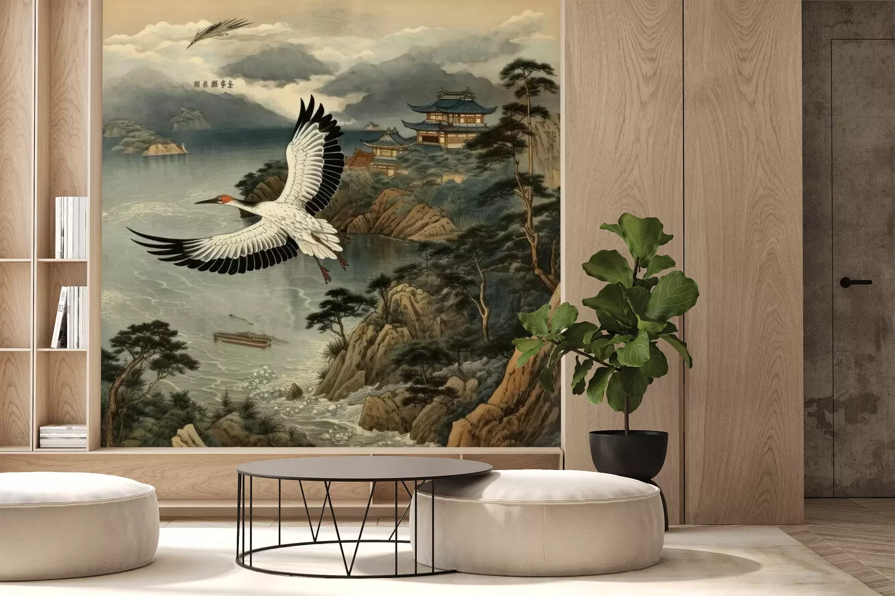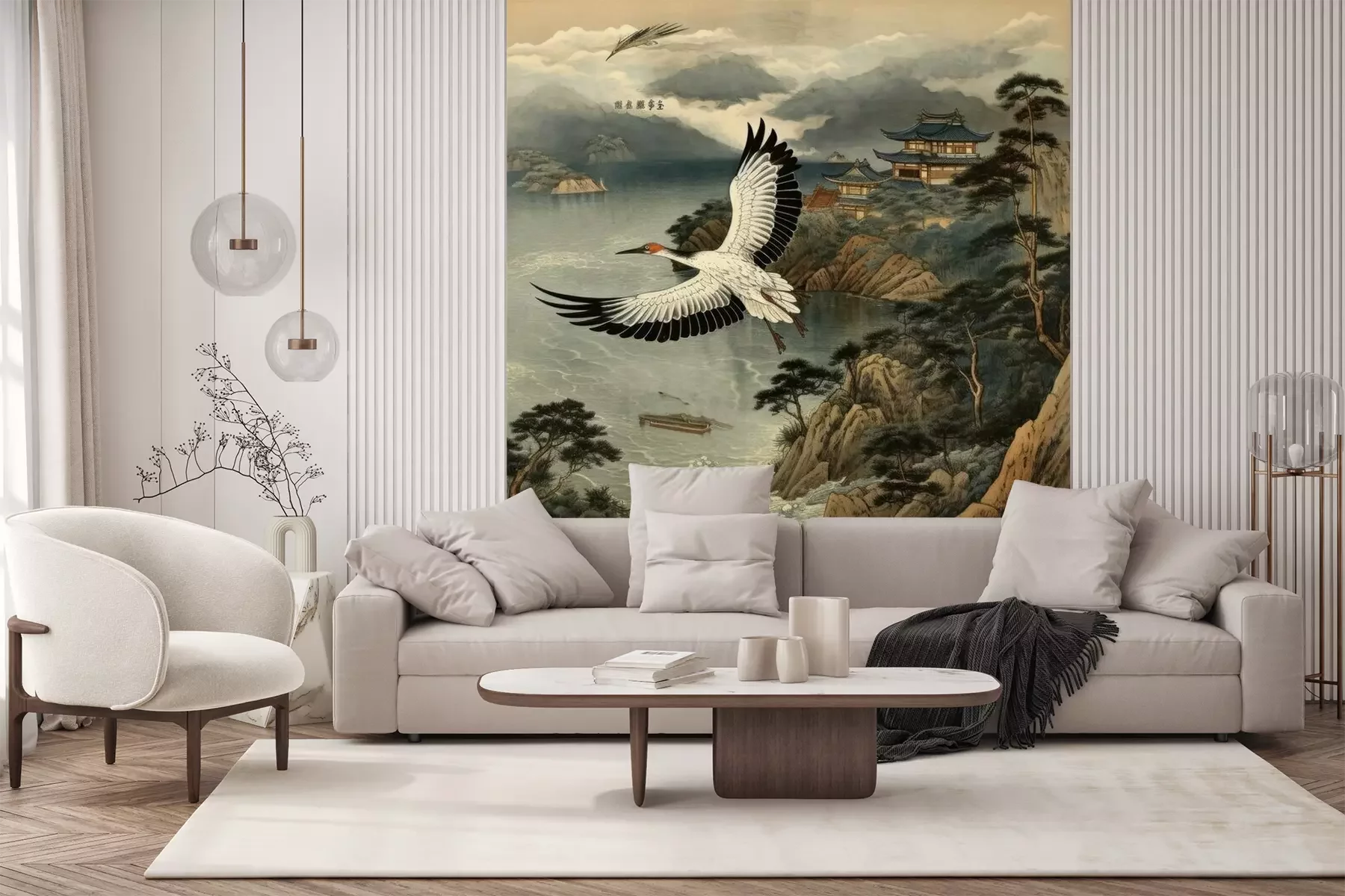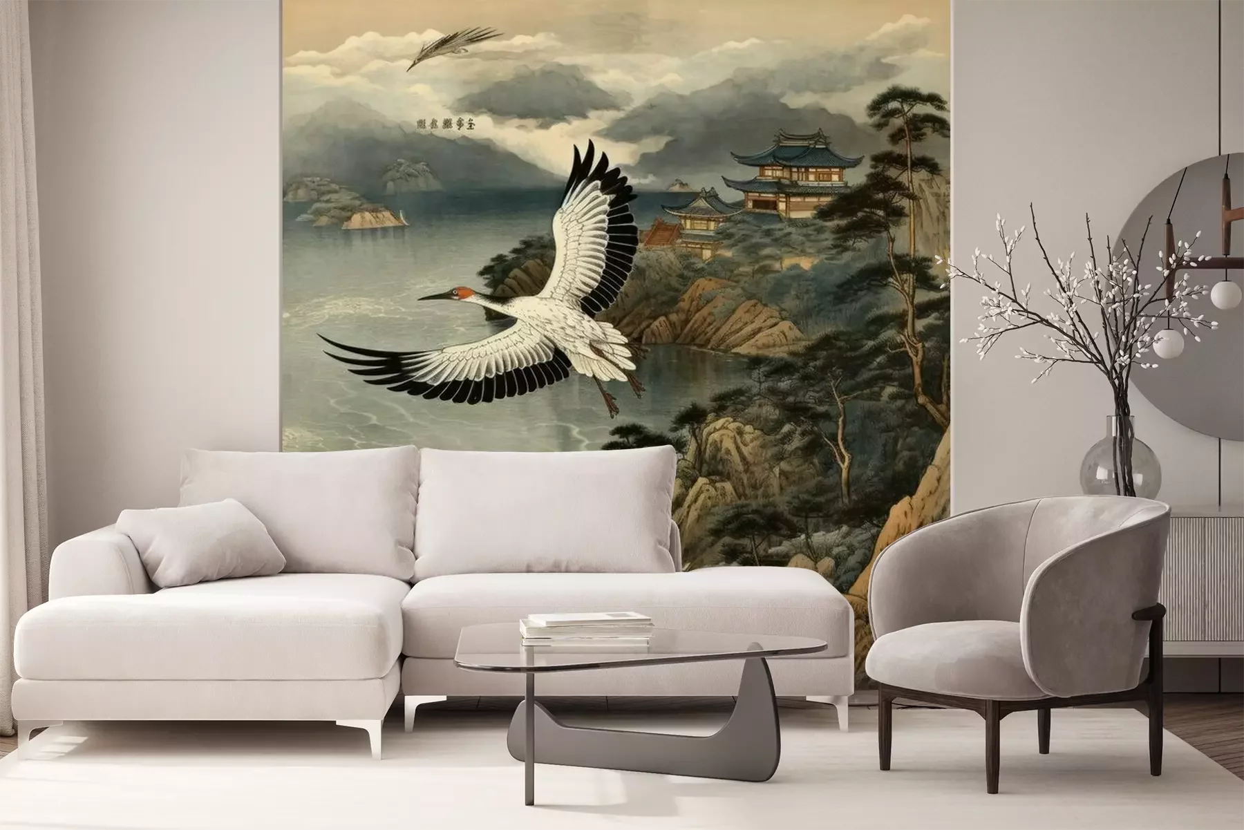 Fotobehang Traditionele Japanse illustratie met een kraan