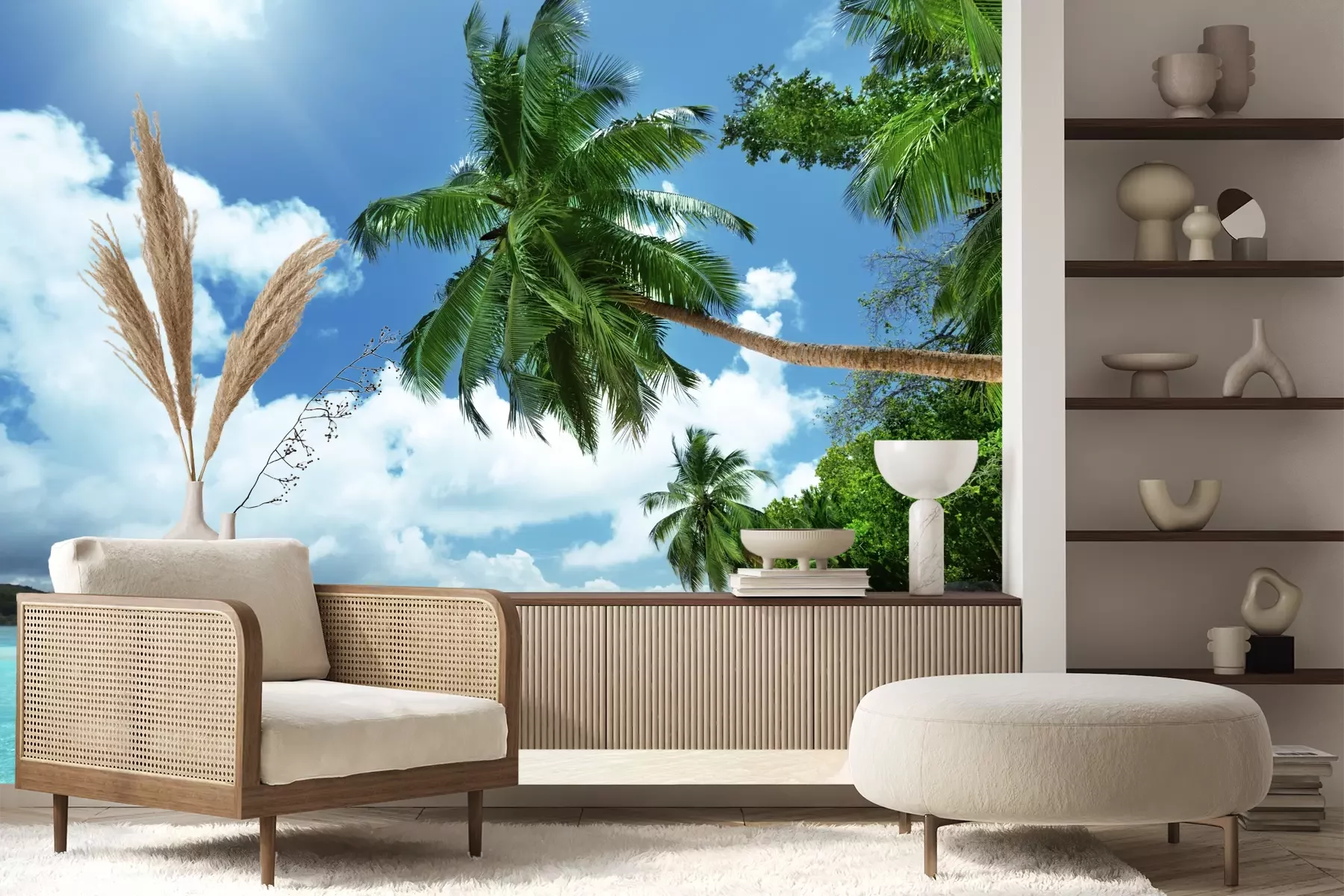 Het materiaal Premium+ is een gestructureerd vinyl op vlies met een gewicht van 255 g/m², dat kleine oneffenheden in de muur effectief camoufleert. De subtiele structuur van fijn zand geeft het oppervlak een exclusieve uitstraling, terwijl de halfmatte afwerking de diepte van de kleuren benadrukt. Het materiaal is dampdoorlatend, waardoor het ook in de keuken en badkamer kan worden gebruikt. De maximale breedte van één baan bedraagt 100 cm – bij grotere afmetingen wordt het fotobehang in meerdere gelijke banen verdeeld. De lijm wordt direct op de muur aangebracht en het behang wordt rand-aan-rand geplakt, wat zorgt voor een esthetisch resultaat zonder zichtbare naden. Het oppervlak kan gemakkelijk worden schoongemaakt door het voorzichtig af te nemen met een vochtige doek.