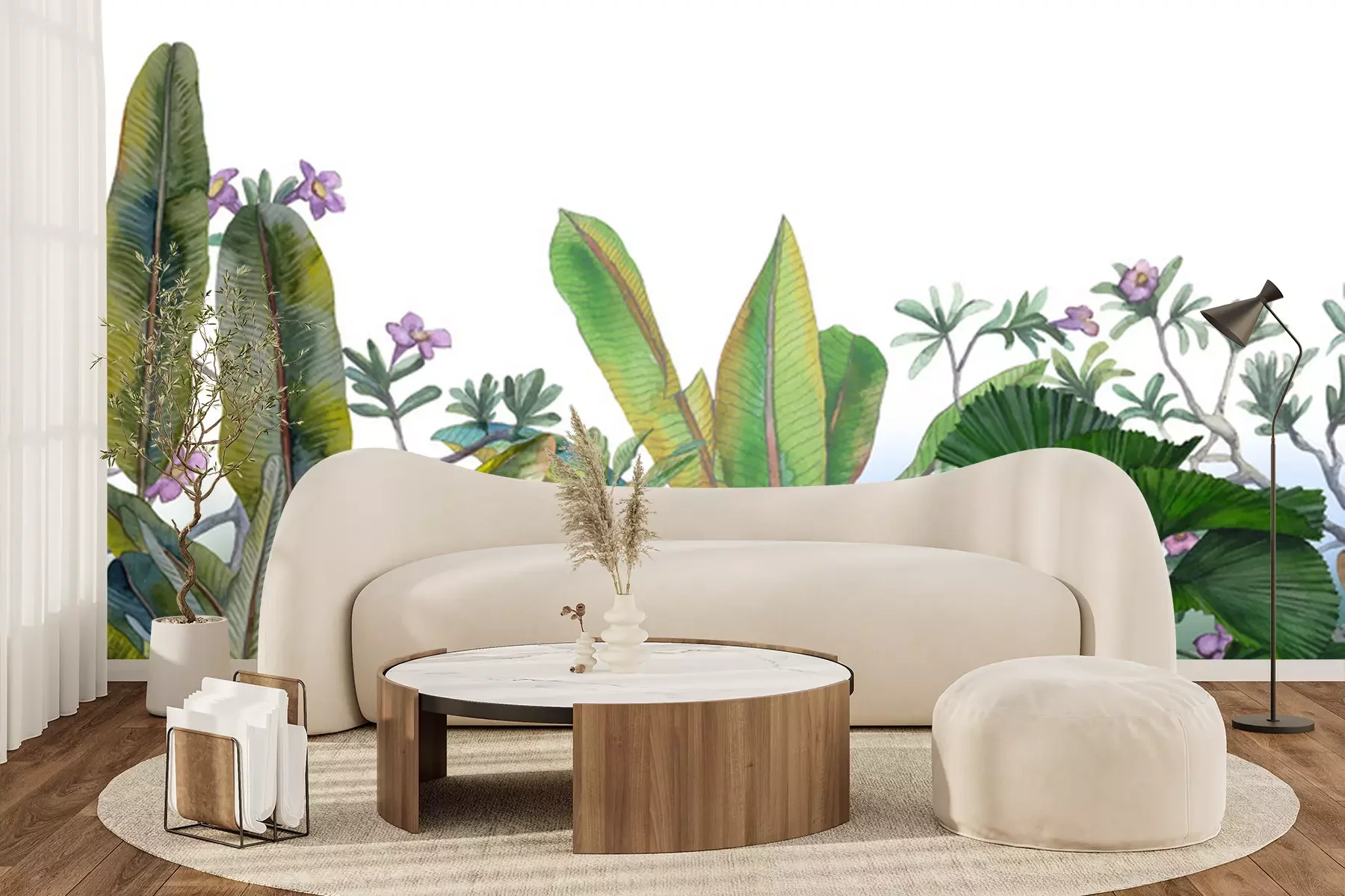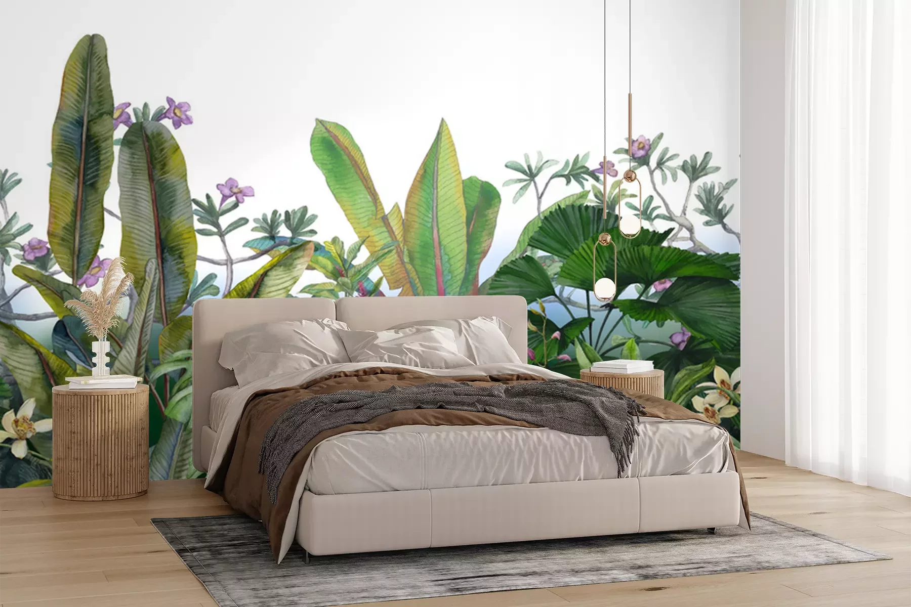 Fotobehang  tropical leaves and flowers hand-drawn by watercolor. Seamless tropical pattern. Stock illustration
