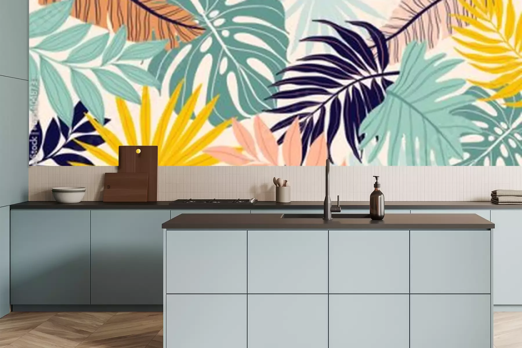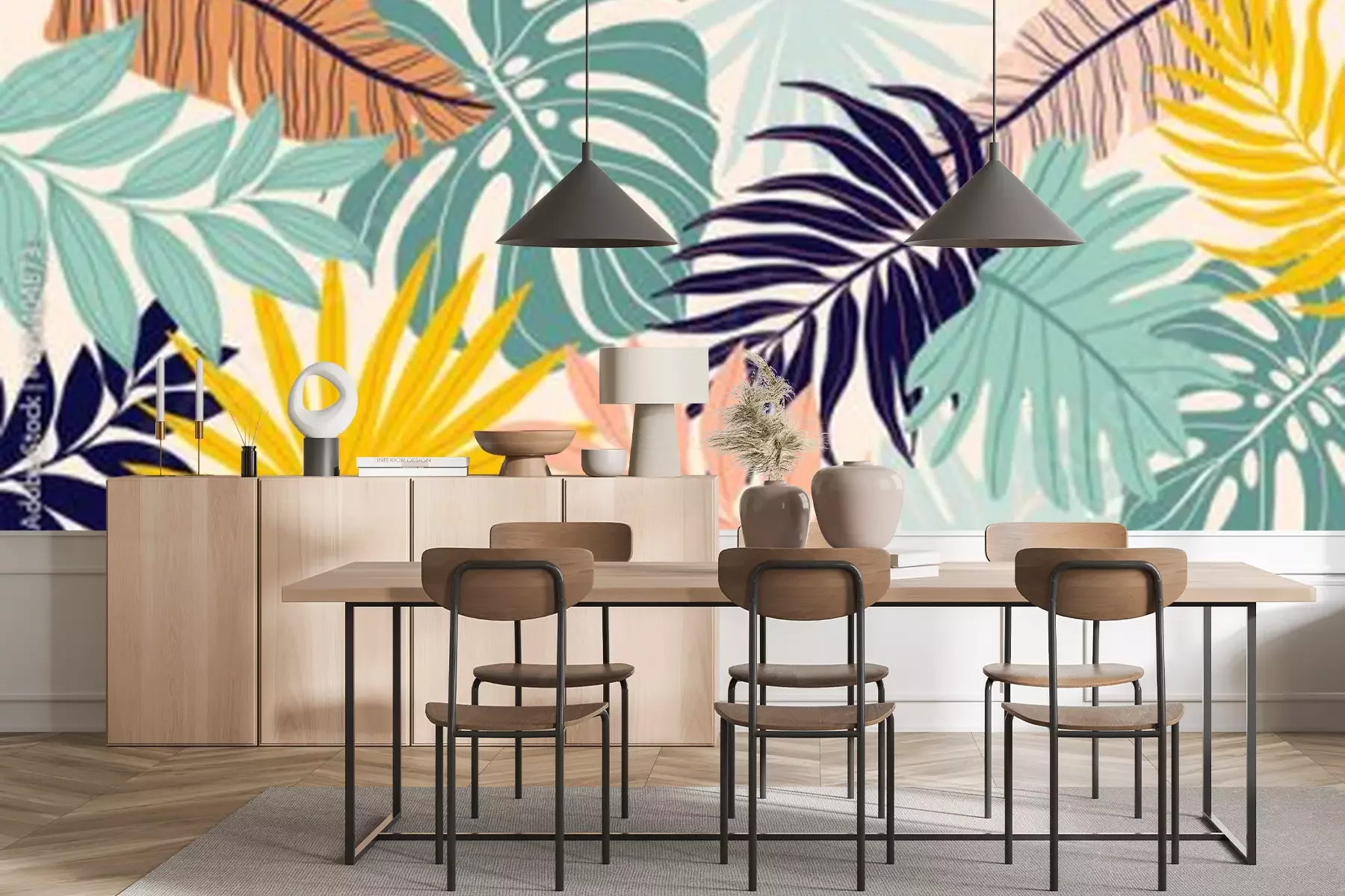 Fotobehang Tropical leaves background vector. Botanical foliage banner design hand drawn colorful palm leaf, monstera leaves line art. Design for wallpaper, cover, cards, packaging, flyer, fabric.