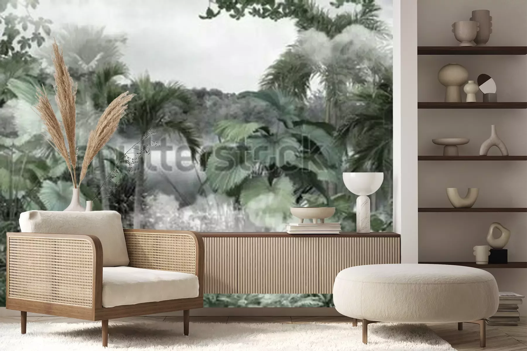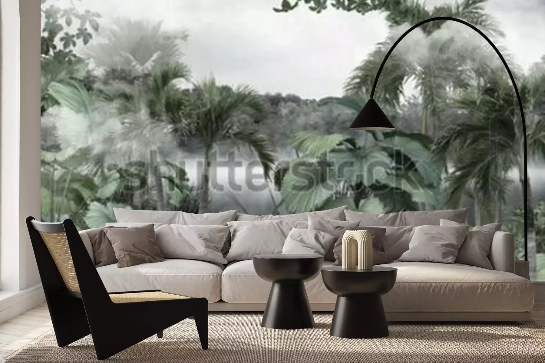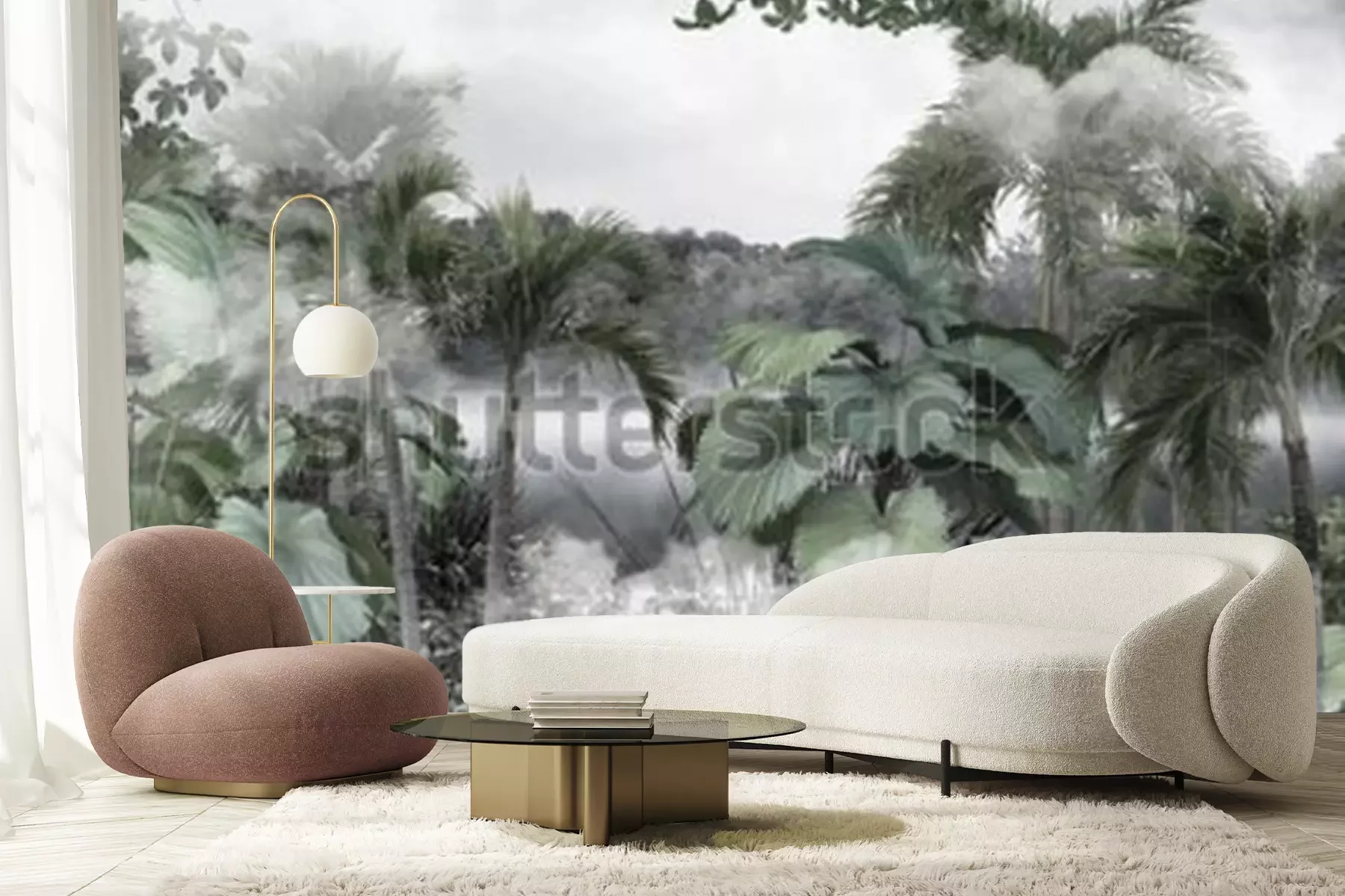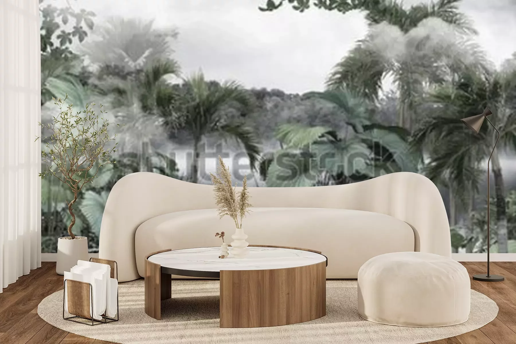 Fotobehang Tropical trees and leaves wallpaper design in foggy forest - 3D illustration