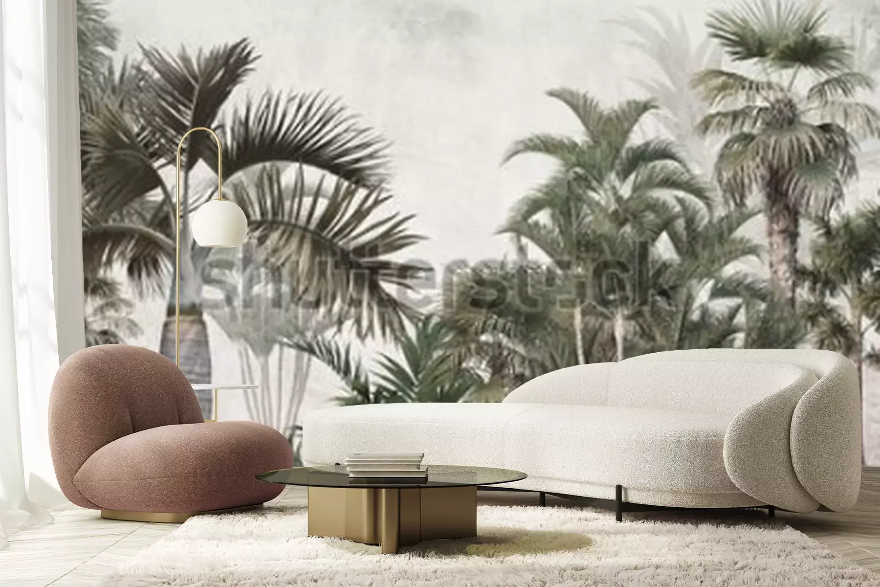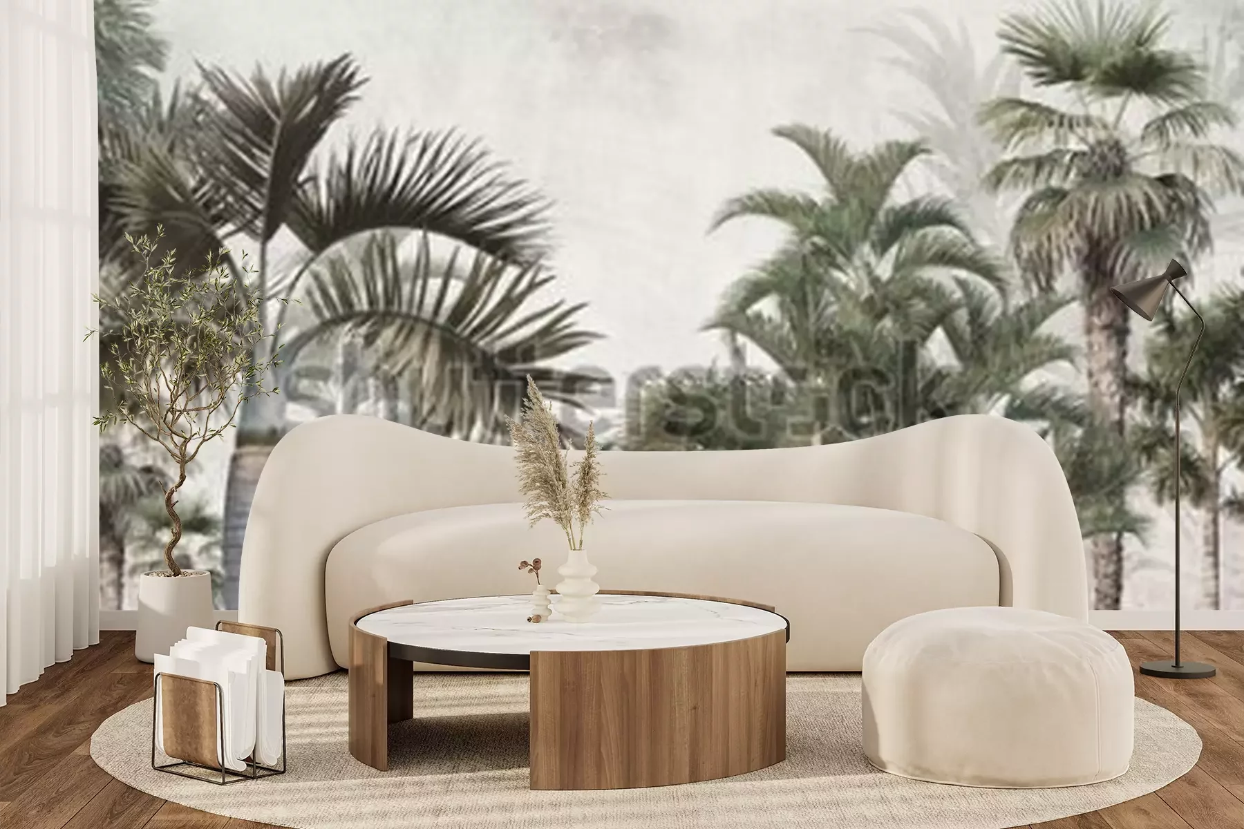 Fotobehang Tropical trees and leaves wallpaper design in foggy forest - 3D illustration