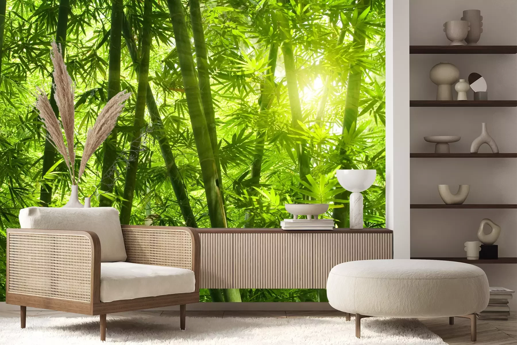 Het materiaal Premium+ is een gestructureerd vinyl op vlies met een gewicht van 255 g/m², dat kleine oneffenheden in de muur effectief camoufleert. De subtiele structuur van fijn zand geeft het oppervlak een exclusieve uitstraling, terwijl de halfmatte afwerking de diepte van de kleuren benadrukt. Het materiaal is dampdoorlatend, waardoor het ook in de keuken en badkamer kan worden gebruikt. De maximale breedte van één baan bedraagt 100 cm – bij grotere afmetingen wordt het fotobehang in meerdere gelijke banen verdeeld. De lijm wordt direct op de muur aangebracht en het behang wordt rand-aan-rand geplakt, wat zorgt voor een esthetisch resultaat zonder zichtbare naden. Het oppervlak kan gemakkelijk worden schoongemaakt door het voorzichtig af te nemen met een vochtige doek.
