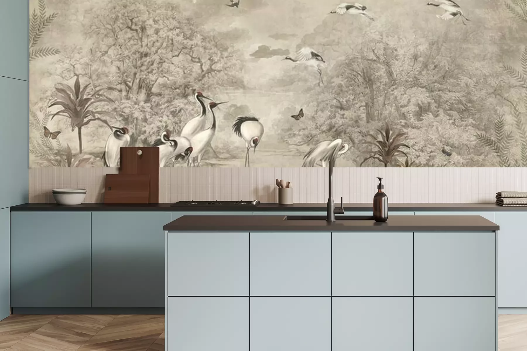 Het materiaal Premium is een glad vinyl op vlies, dat bestand is tegen uitrekken en vervorming. Het is dampdoorlatend – de muren kunnen vrij ademen – waardoor het geschikt is voor gebruik in de keuken en badkamer. Bij vervuiling kan het materiaal worden afgenomen met een vochtige doek. De maximale breedte van één baan bedraagt 95 of 105 cm, afhankelijk van de beschikbaarheid. Montage vindt plaats met de rand-aan-rand methode, wat een esthetisch resultaat zonder zichtbare naden oplevert. Omdat de lijm rechtstreeks op de muur wordt aangebracht, verloopt de installatie van het fotobehang snel en eenvoudig.
