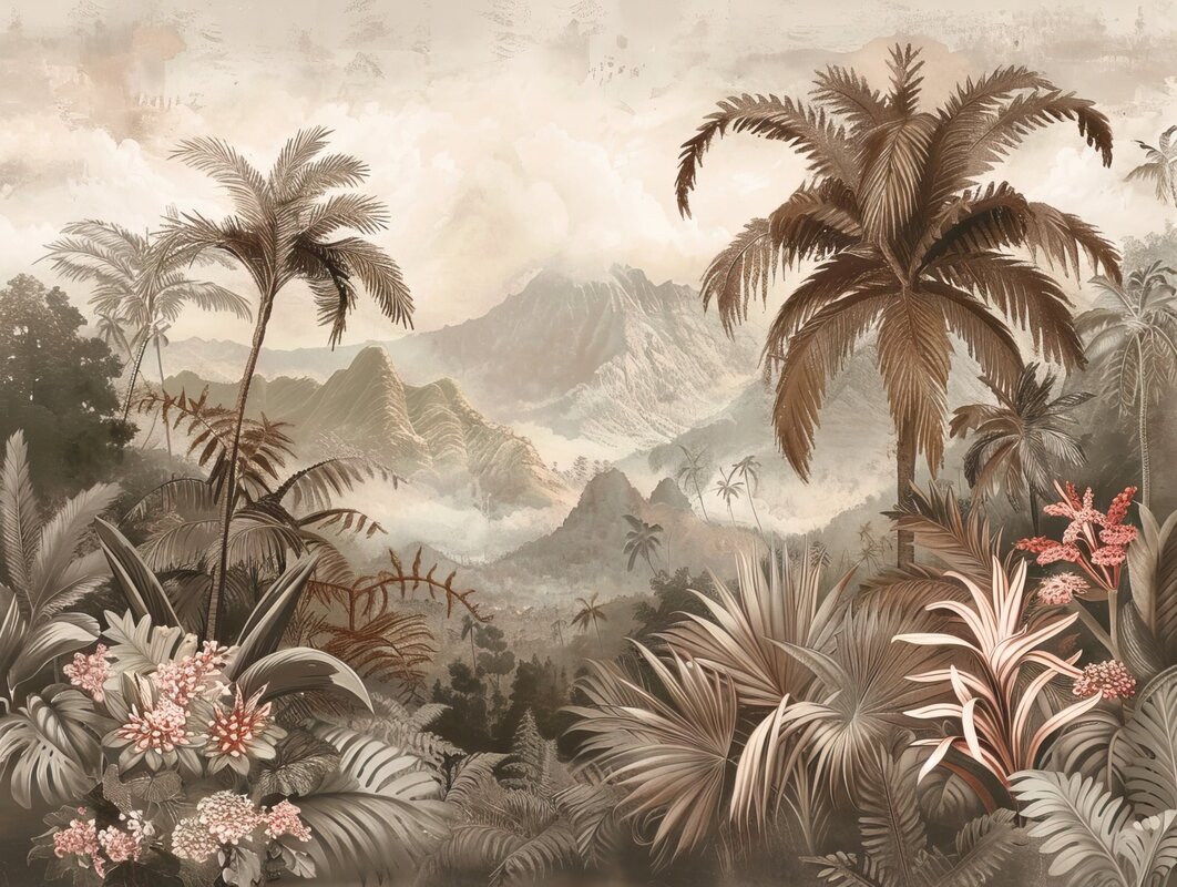 Fotobehang: Tropisch landschap met palmbomen en heuvels