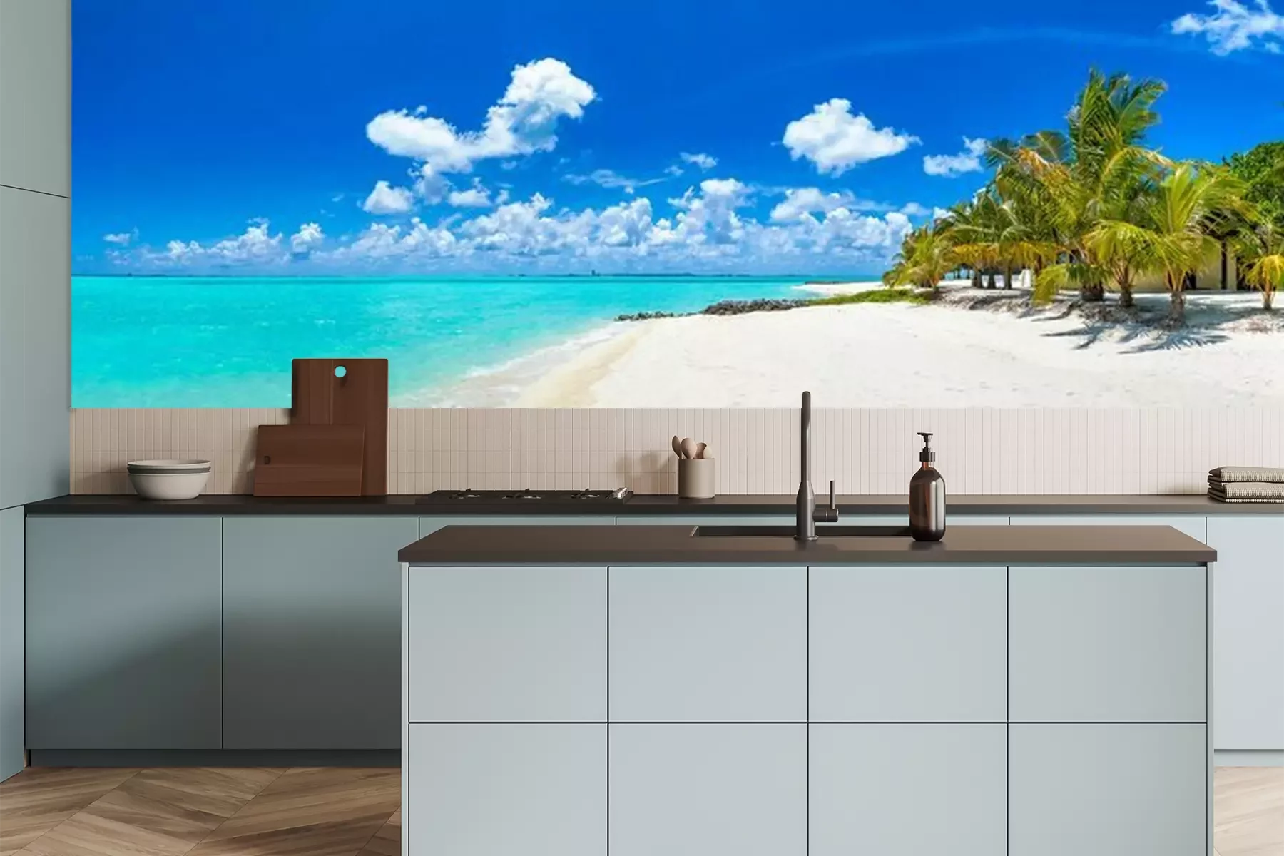 Het materiaal Premium is een glad vinyl op vlies, dat bestand is tegen uitrekken en vervorming. Het is dampdoorlatend – de muren kunnen vrij ademen – waardoor het geschikt is voor gebruik in de keuken en badkamer. Bij vervuiling kan het materiaal worden afgenomen met een vochtige doek. De maximale breedte van één baan bedraagt 95 of 105 cm, afhankelijk van de beschikbaarheid. Montage vindt plaats met de rand-aan-rand methode, wat een esthetisch resultaat zonder zichtbare naden oplevert. Omdat de lijm rechtstreeks op de muur wordt aangebracht, verloopt de installatie van het fotobehang snel en eenvoudig.