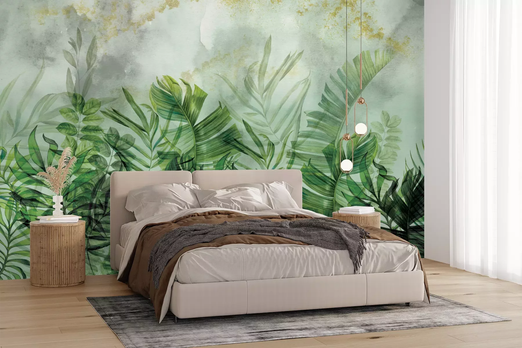 Wanddecoraties geïnspireerd door de natuur zijn een universele en tijdloze keuze – een perfect voorbeeld daarvan is dit fotobehang. Tropische bladeren brengen een gevoel van verbondenheid met de natuur in de ruimte, zelfs in het hart van de stad, en creëren een rustgevende, ontspannende sfeer. Plantaardige motieven raken nooit uit de mode, wat dit een beproefde manier maakt om een interieur in te richten dat jarenlang mooi blijft. Dit is bovendien een bijzonder praktisch fotobehang. Tropische bladeren passen perfect in allerlei stijlen – van eco en boho tot moderne en zelfs industriële interieurs, waar ze de strakke uitstraling verzachten en voor warmte zorgen. Een fotobehang urban jungle is een uitstekende keuze, niet alleen voor loftwoningen, maar ook voor kantoren of commerciële ruimtes, waar groen het interieur tot leven brengt en de concentratie bevordert. Het motief van tropische bladeren komt niet alleen goed tot zijn recht in de woonkamer of slaapkamer, maar ook in de hal, keuken of zelfs in de badkamer. Dankzij de hoogwaardige materialen waarvan onze fotobehangen worden gemaakt, zijn de banen bestand tegen krassen en mechanische beschadigingen. Daarnaast bieden wij ook gelamineerd fotobehang aan. Tropische bladeren gedrukt op een ondergrond met beschermfolie kunnen zonder probleem muren in vochtige ruimtes sieren, bijvoorbeeld naast het bad of de wastafel, en blijven jarenlang in perfecte staat. Een bijzonder kenmerk van dit ontwerp is het schilderachtige karakter van het fotobehang. Aquarel, gedrukt op groot formaat, geeft de indruk van een echte muurschildering met waterverf. Daardoor krijgt de decoratie een artistieke uitstraling, terwijl ze praktisch en duurzaam blijft, zonder dat er speciale omstandigheden nodig zijn voor de presentatie – in tegenstelling tot echte schilderingen. Het is een populaire keuze voor zowel woon- als commerciële interieurs. In slechts enkele momenten transformeert het de ruimte, brengt het rust en een vleugje groen die een positief effect hebben op het welzijn.