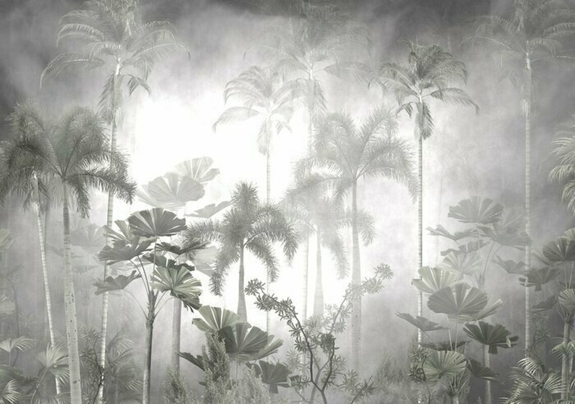 Fotobehang: Tropische bomen en bladeren in mistig bosbehangontwerp - 3D