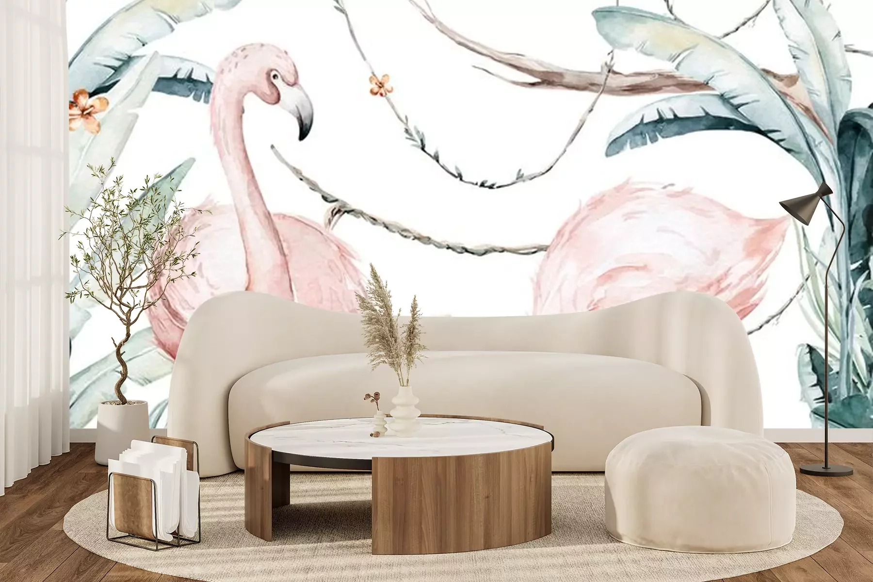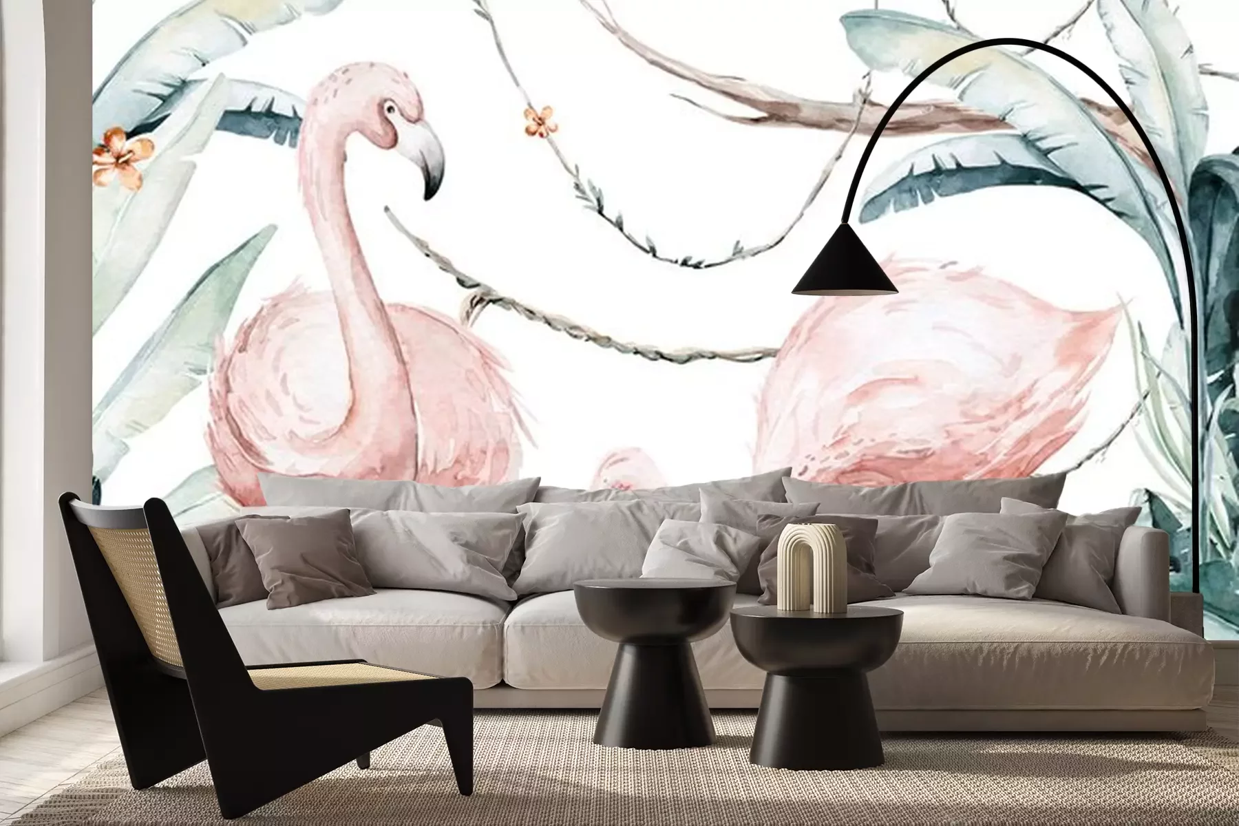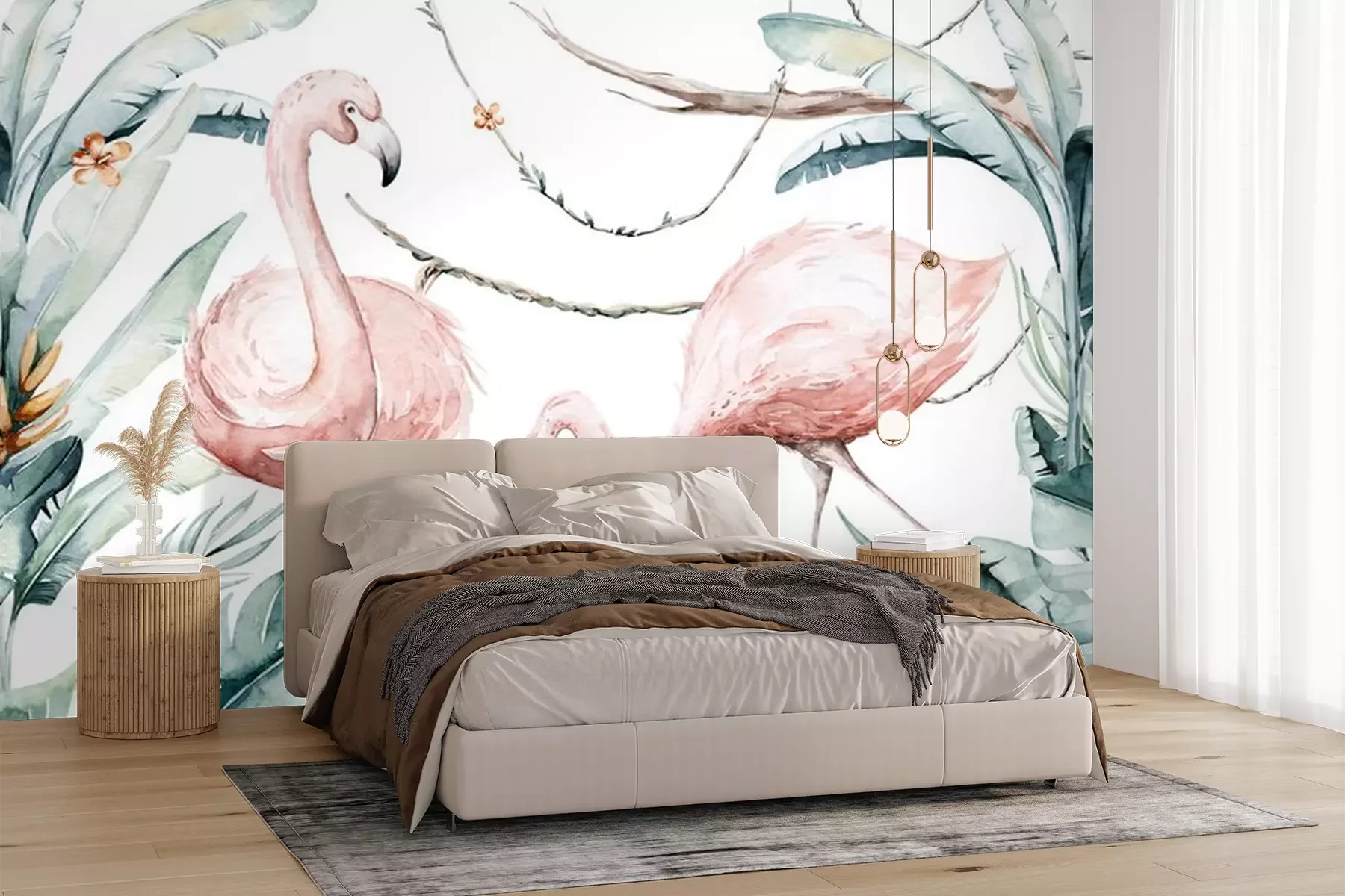 Fotobehang Tropische flamingo vogels tussen bladeren geschilderd in aquarel