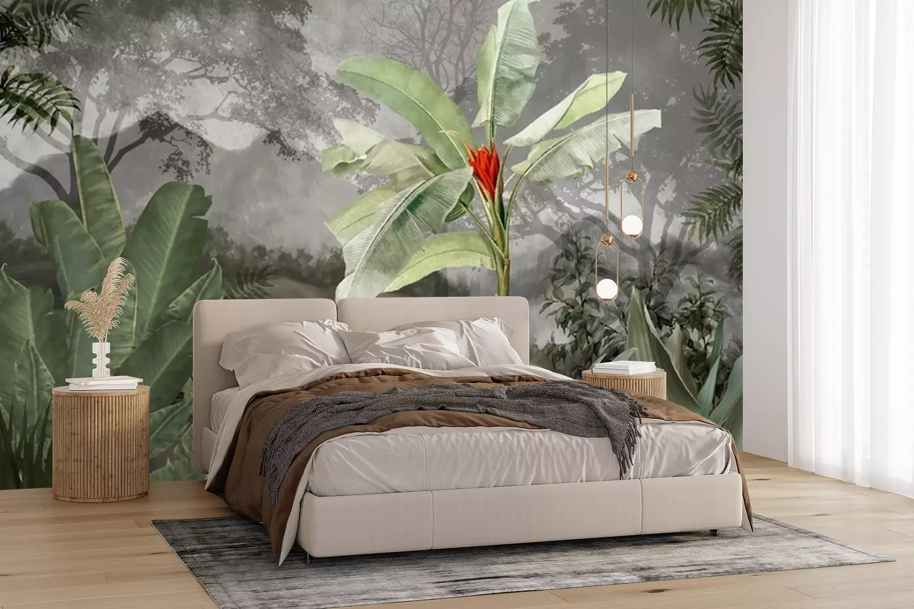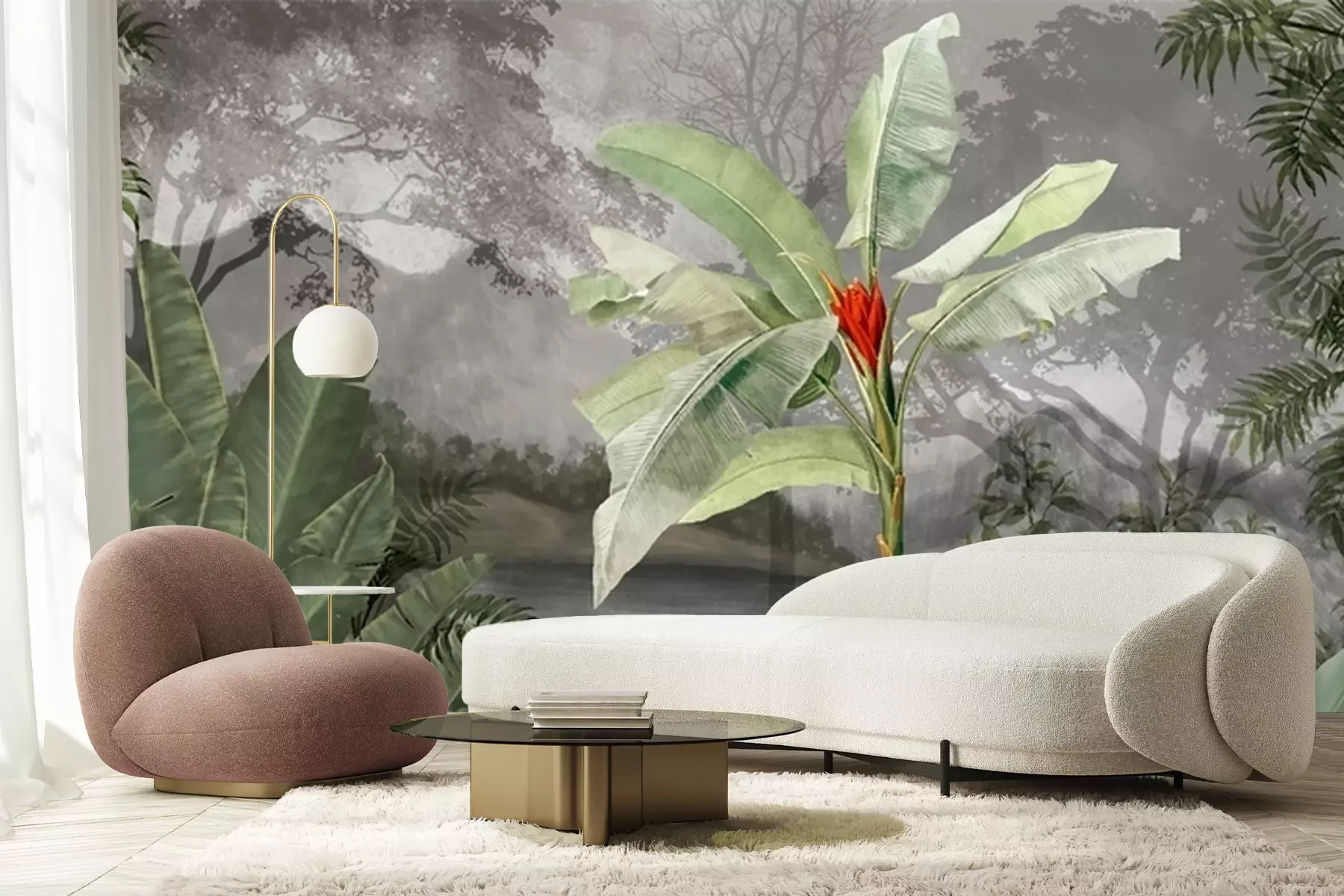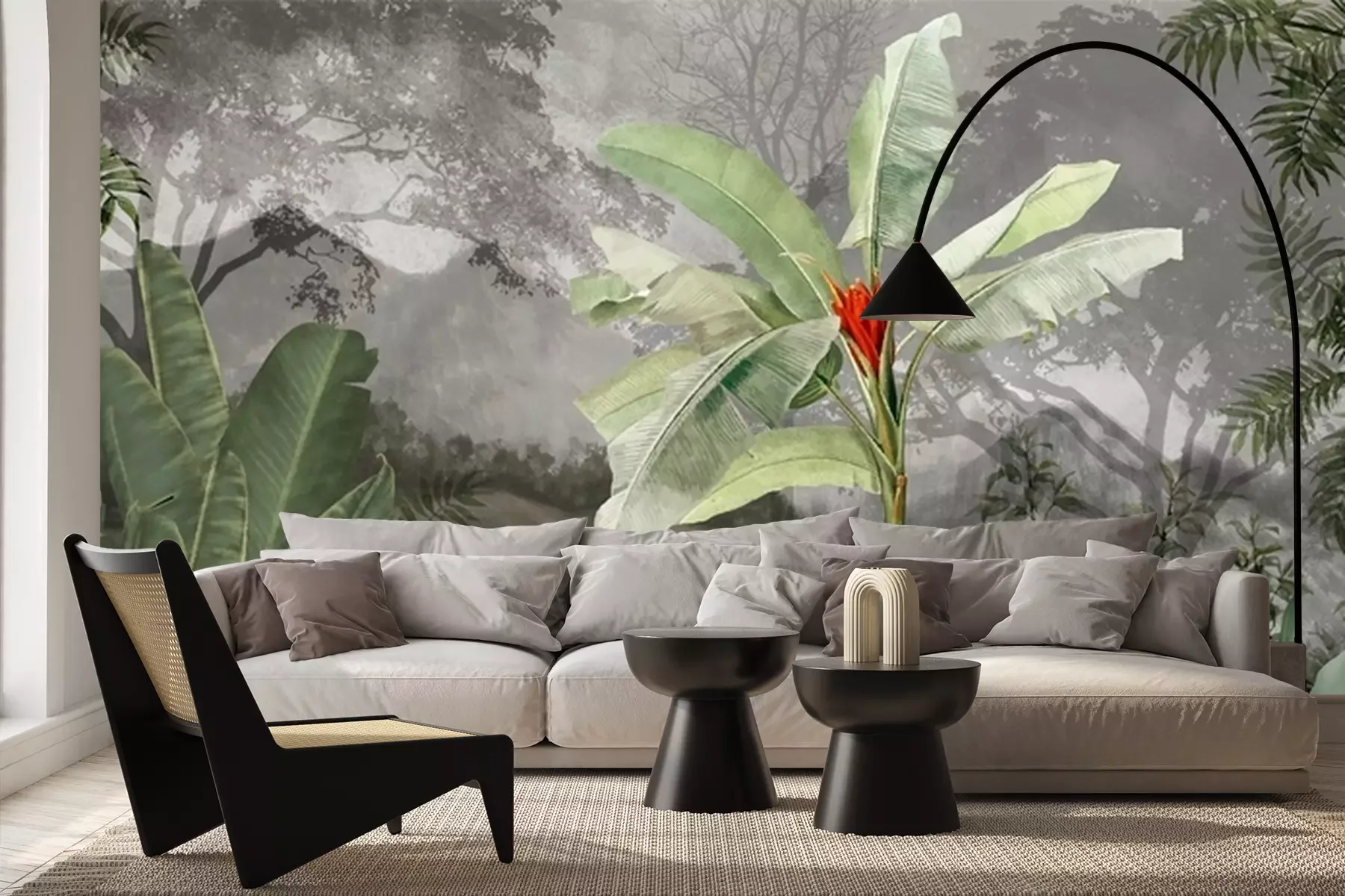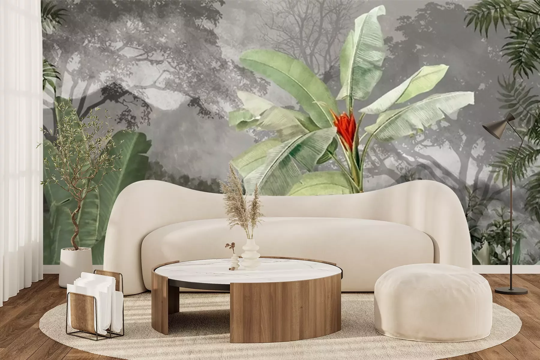 Fotobehang Tropische groene vegetatie op een grijze achtergrond