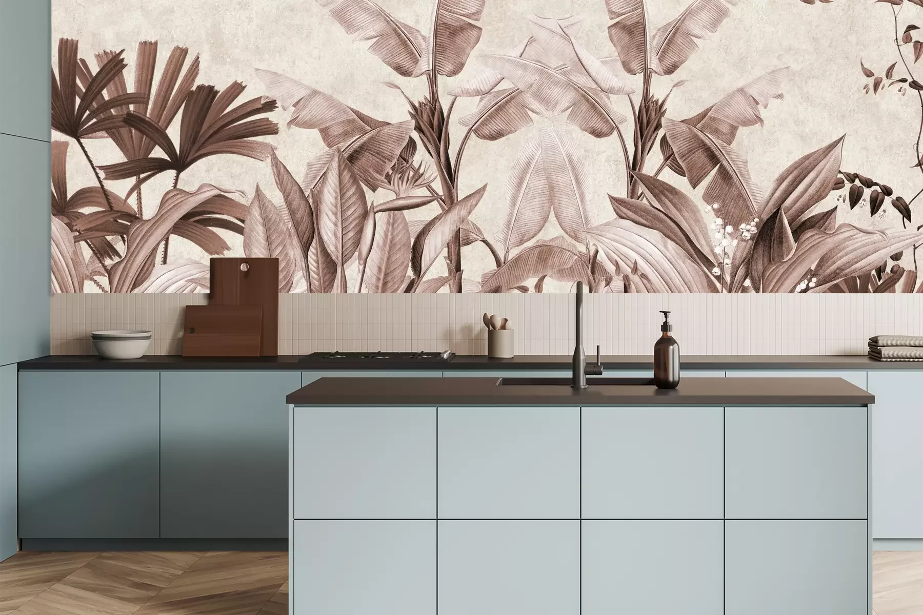 Het materiaal Premium is een glad vinyl op vlies, dat bestand is tegen uitrekken en vervorming. Het is dampdoorlatend – de muren kunnen vrij ademen – waardoor het geschikt is voor gebruik in de keuken en badkamer. Bij vervuiling kan het materiaal worden afgenomen met een vochtige doek. De maximale breedte van één baan bedraagt 95 of 105 cm, afhankelijk van de beschikbaarheid. Montage vindt plaats met de rand-aan-rand methode, wat een esthetisch resultaat zonder zichtbare naden oplevert. Omdat de lijm rechtstreeks op de muur wordt aangebracht, verloopt de installatie van het fotobehang snel en eenvoudig.