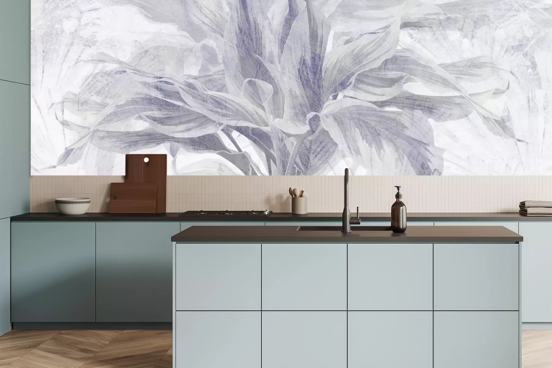 Het materiaal Premium is een glad vinyl op vlies, dat bestand is tegen uitrekken en vervorming. Het is dampdoorlatend – de muren kunnen vrij ademen – waardoor het geschikt is voor gebruik in de keuken en badkamer. Bij vervuiling kan het materiaal worden afgenomen met een vochtige doek. De maximale breedte van één baan bedraagt 95 of 105 cm, afhankelijk van de beschikbaarheid. Montage vindt plaats met de rand-aan-rand methode, wat een esthetisch resultaat zonder zichtbare naden oplevert. Omdat de lijm rechtstreeks op de muur wordt aangebracht, verloopt de installatie van het fotobehang snel en eenvoudig.