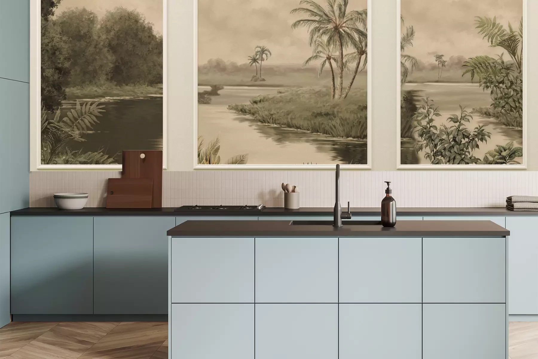 Het materiaal Premium is een glad vinyl op vlies, dat bestand is tegen uitrekken en vervorming. Het is dampdoorlatend – de muren kunnen vrij ademen – waardoor het geschikt is voor gebruik in de keuken en badkamer. Bij vervuiling kan het materiaal worden afgenomen met een vochtige doek. De maximale breedte van één baan bedraagt 95 of 105 cm, afhankelijk van de beschikbaarheid. Montage vindt plaats met de rand-aan-rand methode, wat een esthetisch resultaat zonder zichtbare naden oplevert. Omdat de lijm rechtstreeks op de muur wordt aangebracht, verloopt de installatie van het fotobehang snel en eenvoudig.