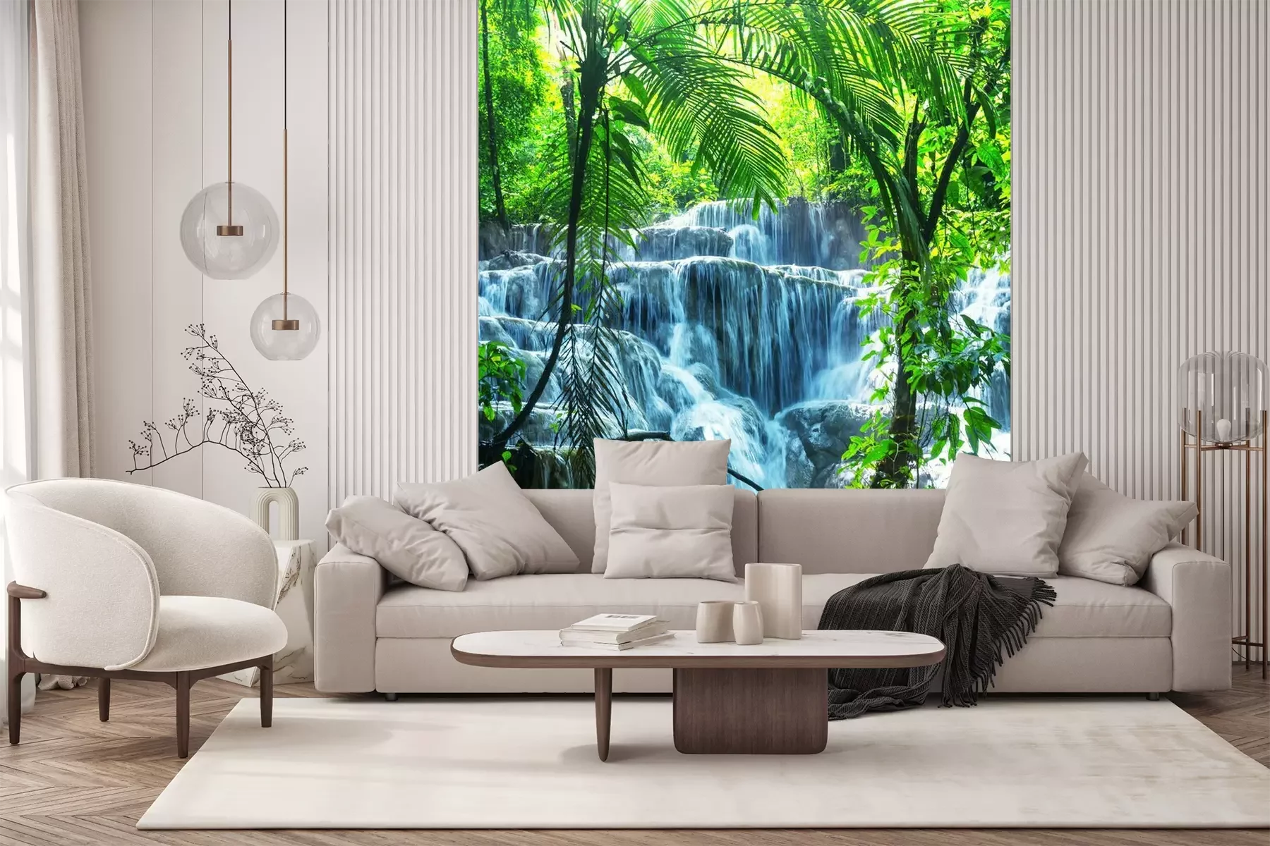 Het materiaal Premium+ is een gestructureerd vinyl op vlies met een gewicht van 255 g/m², dat kleine oneffenheden in de muur effectief camoufleert. De subtiele structuur van fijn zand geeft het oppervlak een exclusieve uitstraling, terwijl de halfmatte afwerking de diepte van de kleuren benadrukt. Het materiaal is dampdoorlatend, waardoor het ook in de keuken en badkamer kan worden gebruikt. De maximale breedte van één baan bedraagt 100 cm – bij grotere afmetingen wordt het fotobehang in meerdere gelijke banen verdeeld. De lijm wordt direct op de muur aangebracht en het behang wordt rand-aan-rand geplakt, wat zorgt voor een esthetisch resultaat zonder zichtbare naden. Het oppervlak kan gemakkelijk worden schoongemaakt door het voorzichtig af te nemen met een vochtige doek.