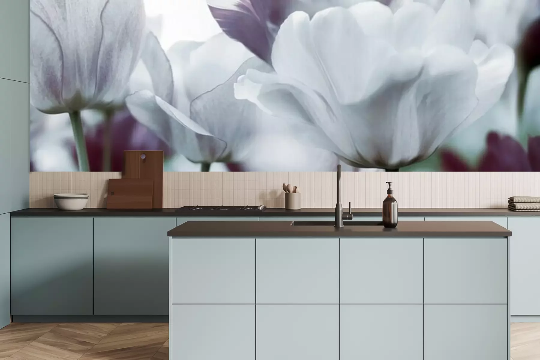 Het materiaal Premium is een glad vinyl op vlies, dat bestand is tegen uitrekken en vervorming. Het is dampdoorlatend – de muren kunnen vrij ademen – waardoor het geschikt is voor gebruik in de keuken en badkamer. Bij vervuiling kan het materiaal worden afgenomen met een vochtige doek. De maximale breedte van één baan bedraagt 95 of 105 cm, afhankelijk van de beschikbaarheid. Montage vindt plaats met de rand-aan-rand methode, wat een esthetisch resultaat zonder zichtbare naden oplevert. Omdat de lijm rechtstreeks op de muur wordt aangebracht, verloopt de installatie van het fotobehang snel en eenvoudig.