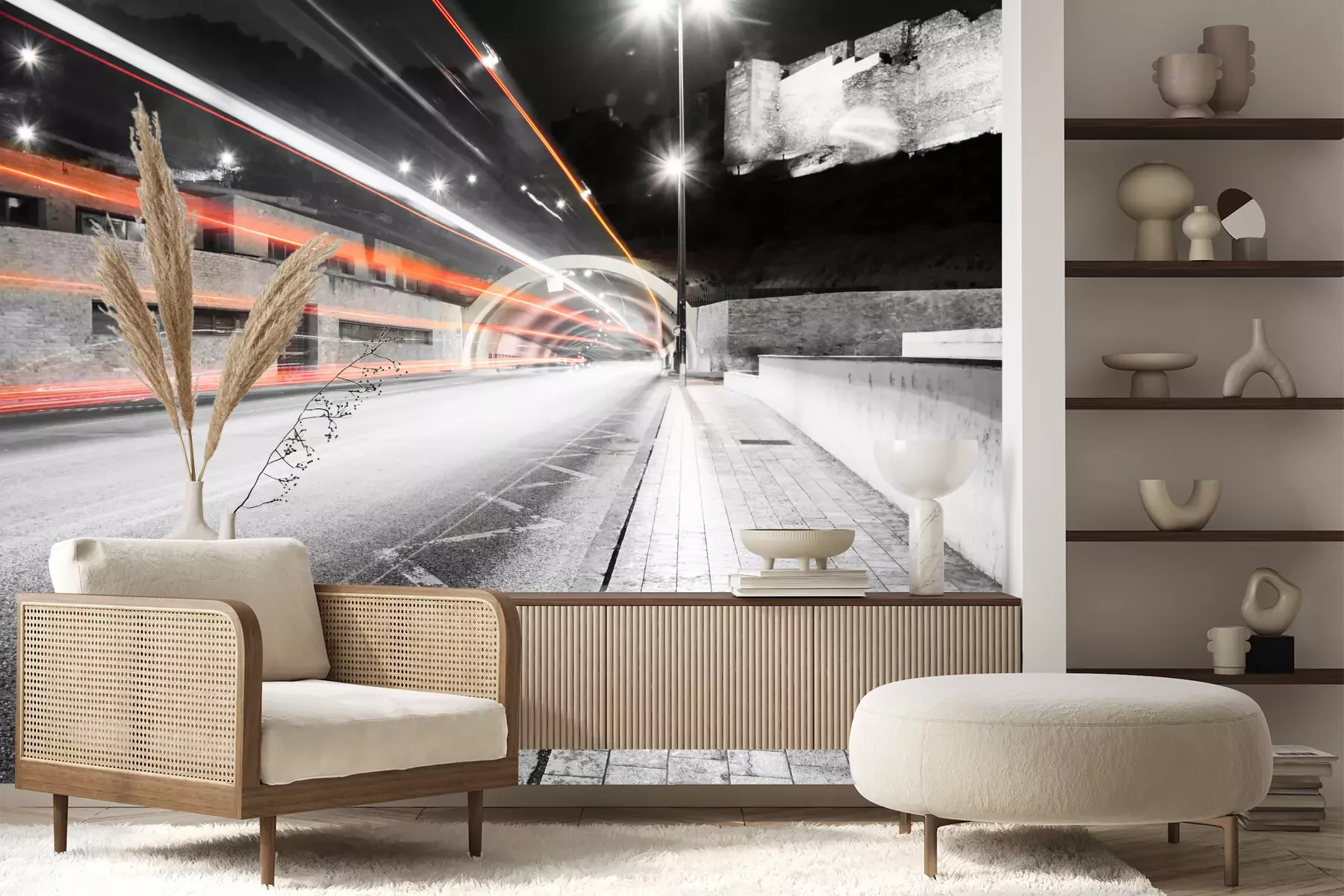 Het materiaal Premium+ is een gestructureerd vinyl op vlies met een gewicht van 255 g/m², dat kleine oneffenheden in de muur effectief camoufleert. De subtiele structuur van fijn zand geeft het oppervlak een exclusieve uitstraling, terwijl de halfmatte afwerking de diepte van de kleuren benadrukt. Het materiaal is dampdoorlatend, waardoor het ook in de keuken en badkamer kan worden gebruikt. De maximale breedte van één baan bedraagt 100 cm – bij grotere afmetingen wordt het fotobehang in meerdere gelijke banen verdeeld. De lijm wordt direct op de muur aangebracht en het behang wordt rand-aan-rand geplakt, wat zorgt voor een esthetisch resultaat zonder zichtbare naden. Het oppervlak kan gemakkelijk worden schoongemaakt door het voorzichtig af te nemen met een vochtige doek.