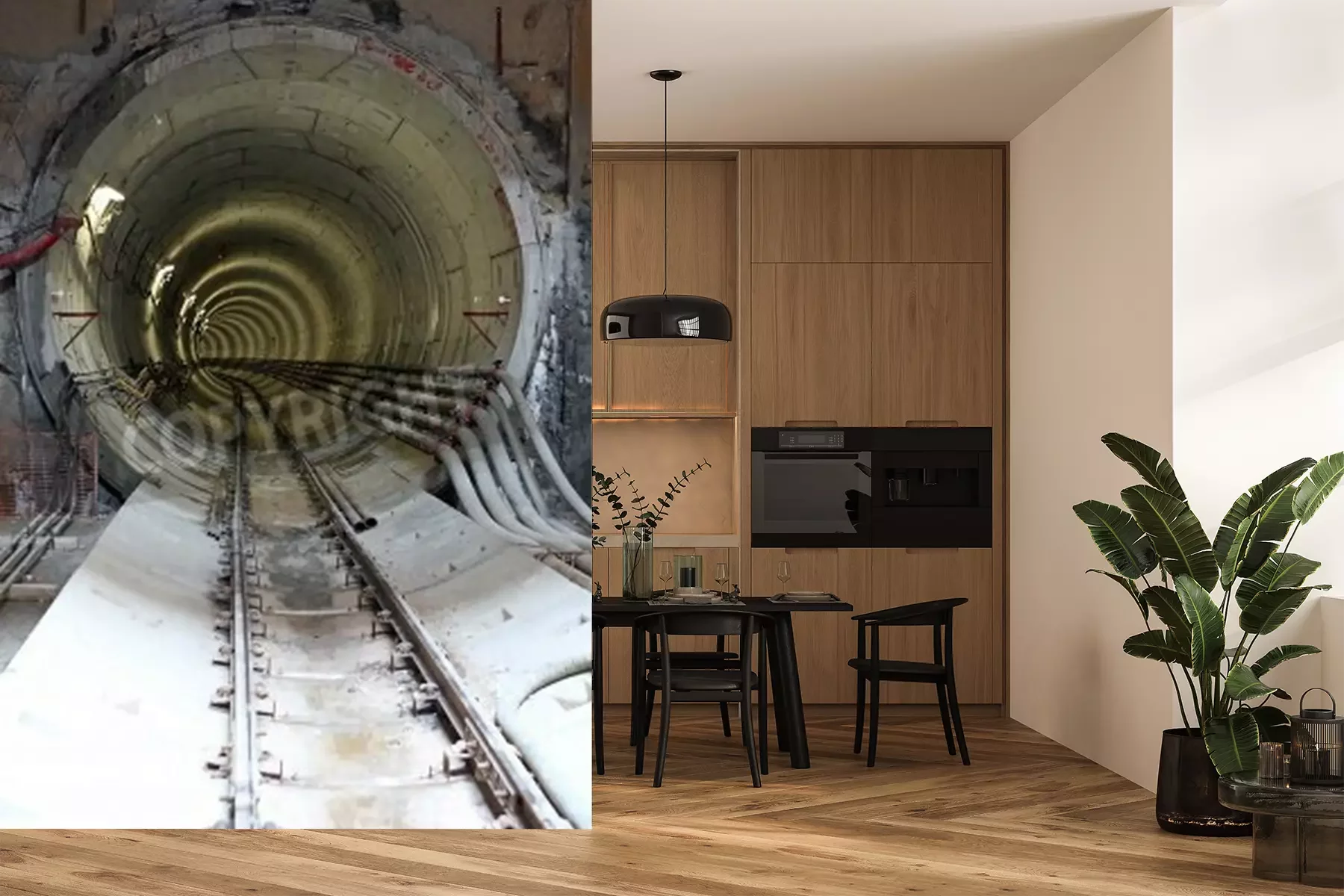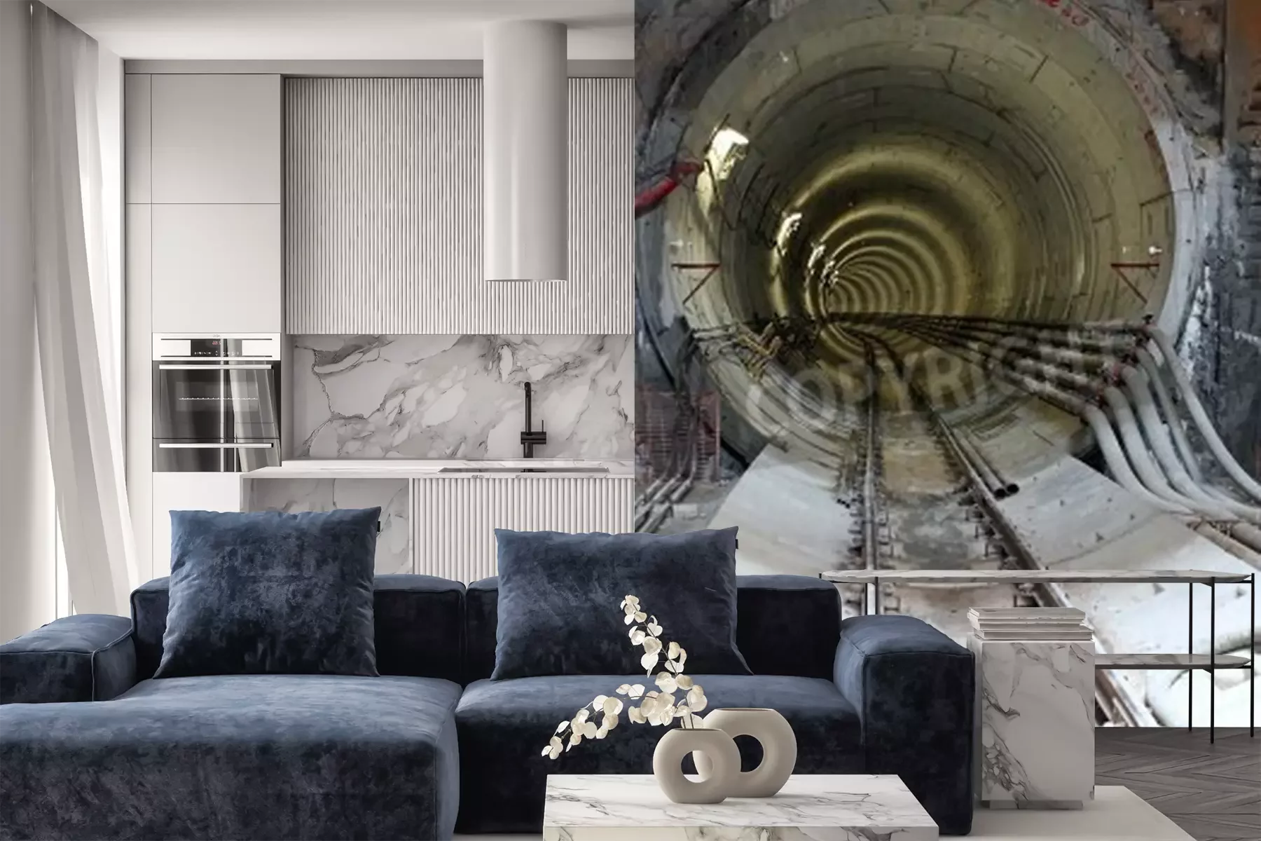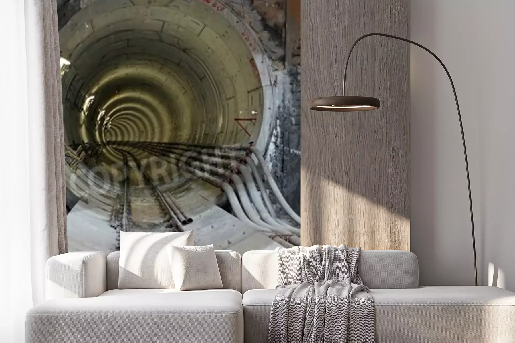 Fotobehang Tunnel met sporen en kabels
