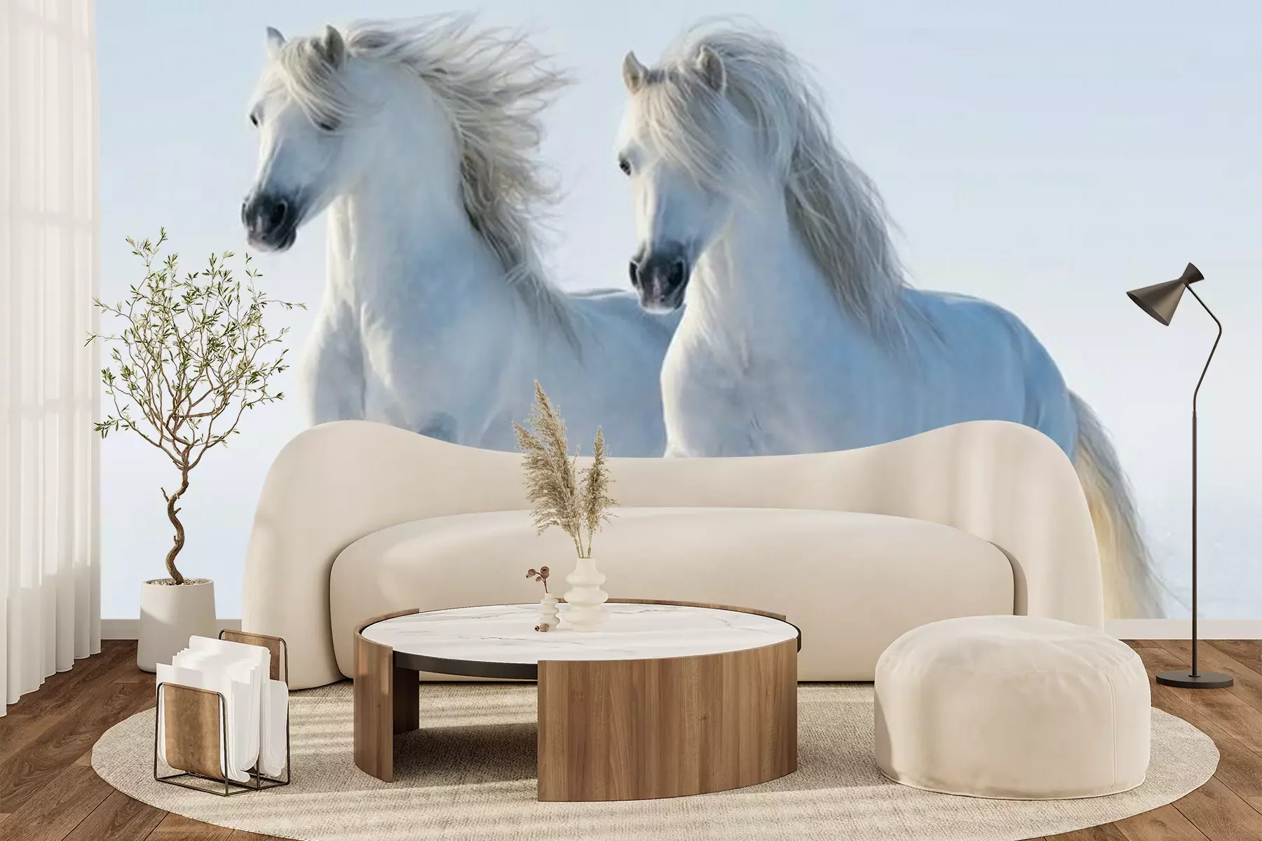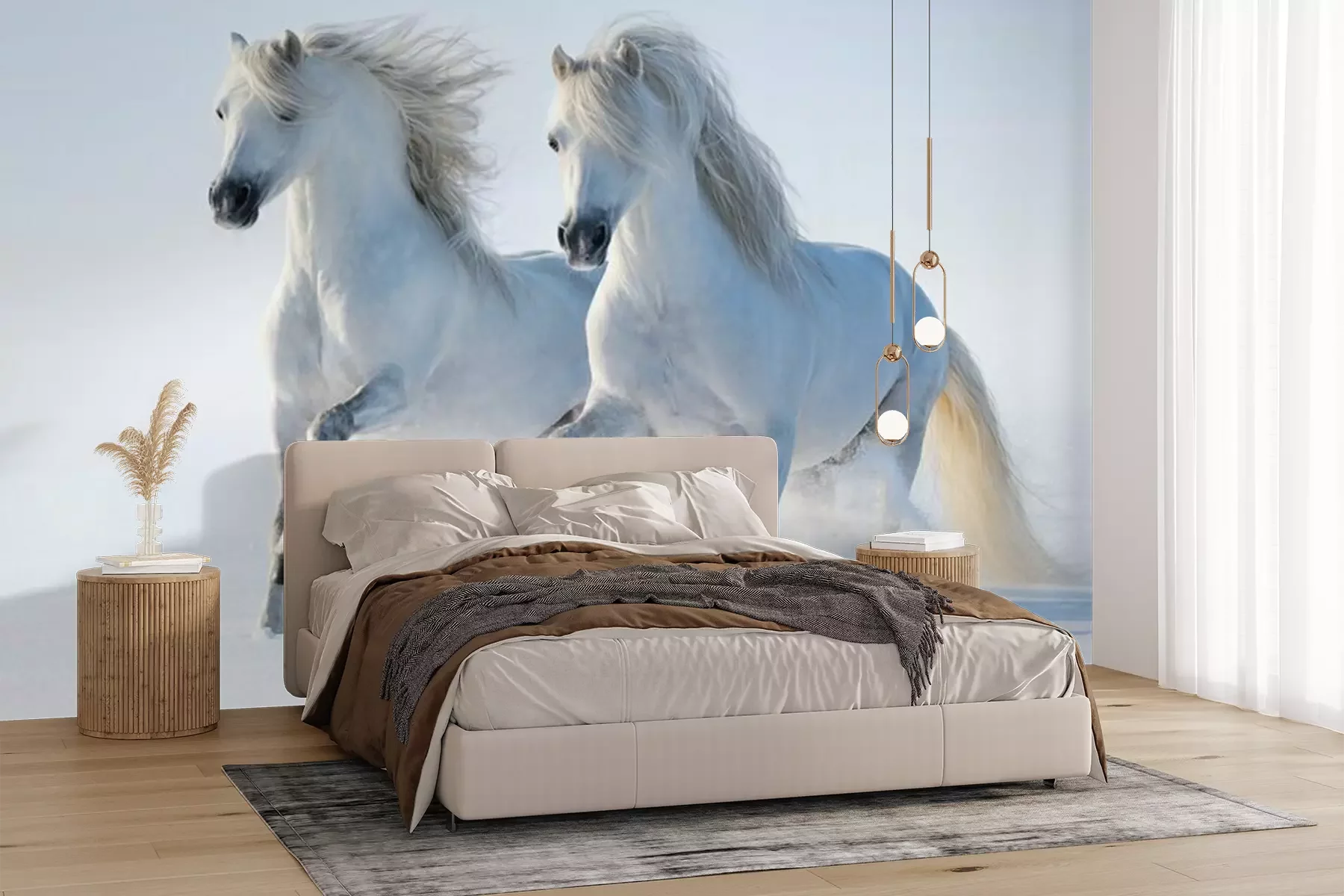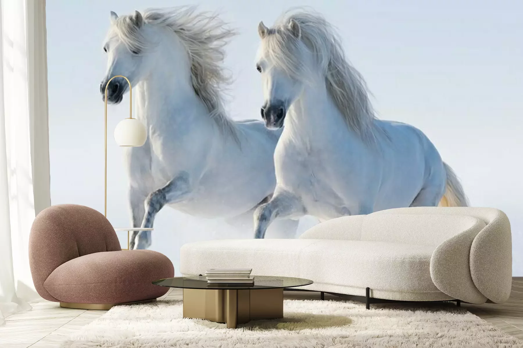 Twee paarden galopperen in de sneeuwProbleemloze bezorging verzorgd door vertrouwde vervoerders