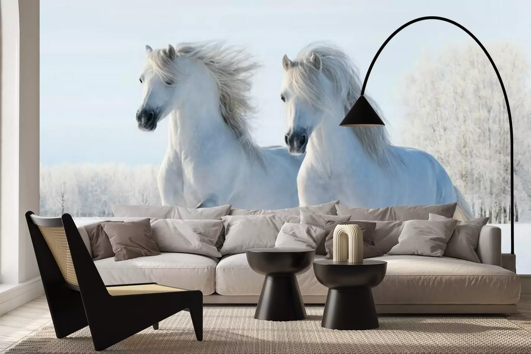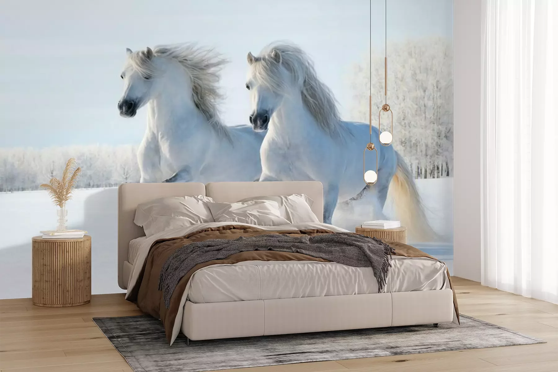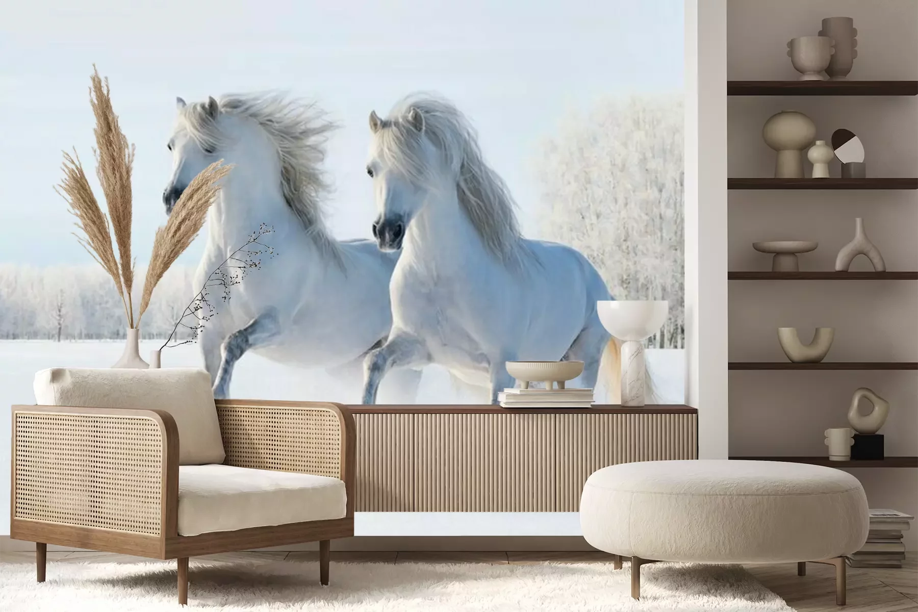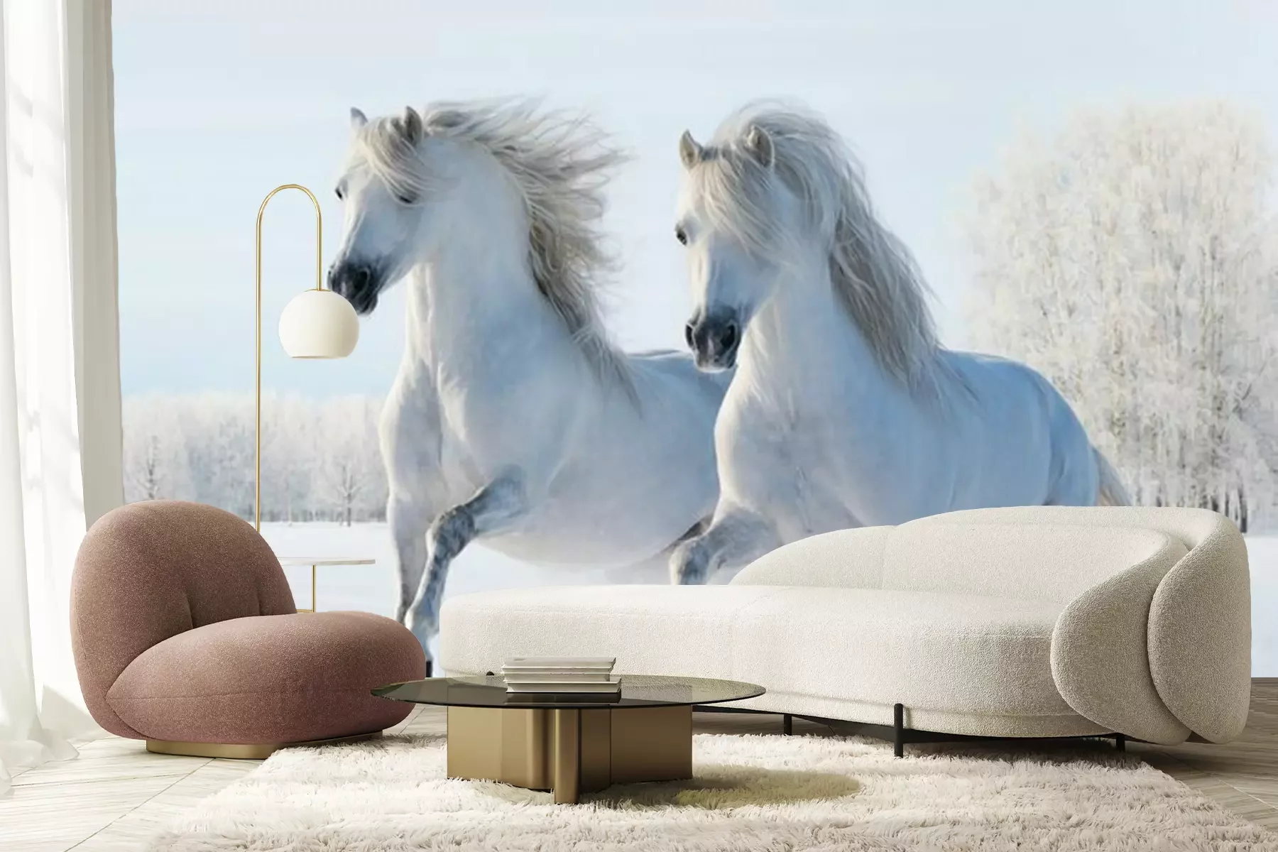 Twee paarden springen in de sneeuwFotobehang