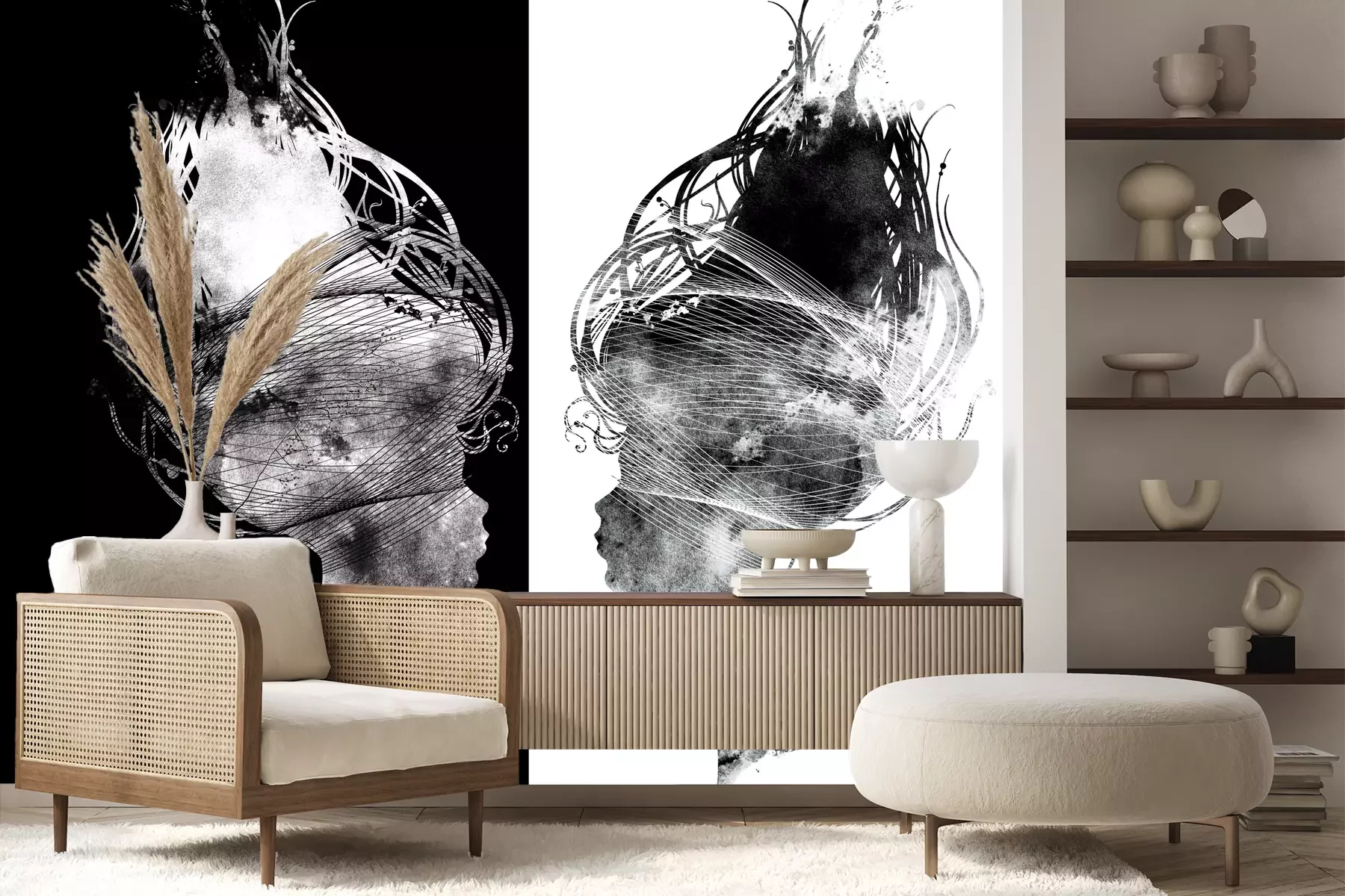 Het materiaal Premium+ is een gestructureerd vinyl op vlies met een gewicht van 255 g/m², dat kleine oneffenheden in de muur effectief camoufleert. De subtiele structuur van fijn zand geeft het oppervlak een exclusieve uitstraling, terwijl de halfmatte afwerking de diepte van de kleuren benadrukt. Het materiaal is dampdoorlatend, waardoor het ook in de keuken en badkamer kan worden gebruikt. De maximale breedte van één baan bedraagt 100 cm – bij grotere afmetingen wordt het fotobehang in meerdere gelijke banen verdeeld. De lijm wordt direct op de muur aangebracht en het behang wordt rand-aan-rand geplakt, wat zorgt voor een esthetisch resultaat zonder zichtbare naden. Het oppervlak kan gemakkelijk worden schoongemaakt door het voorzichtig af te nemen met een vochtige doek.