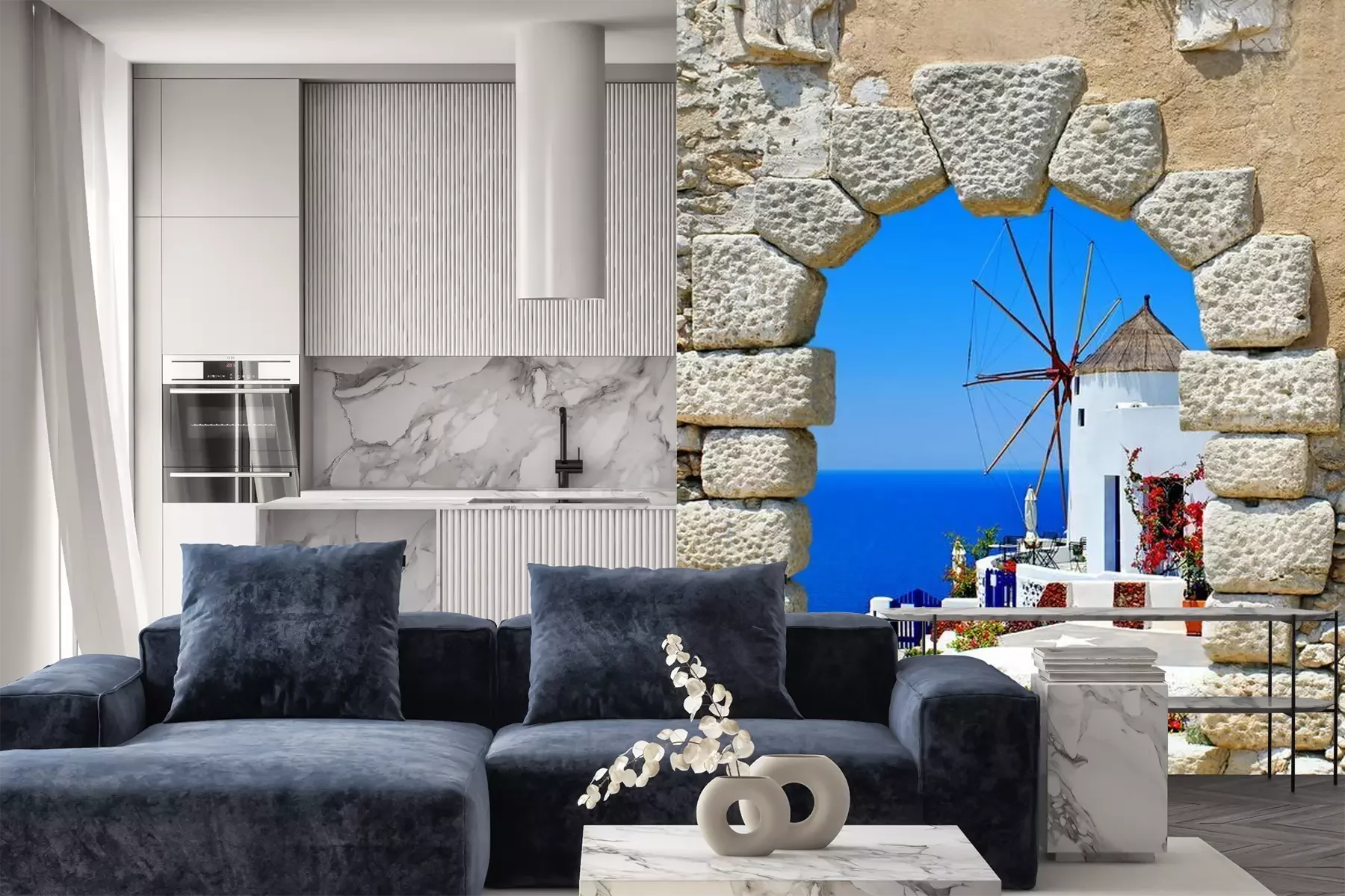 Het materiaal Premium is een glad vinyl op vlies, dat bestand is tegen uitrekken en vervorming. Het is dampdoorlatend – de muren kunnen vrij ademen – waardoor het geschikt is voor gebruik in de keuken en badkamer. Bij vervuiling kan het materiaal worden afgenomen met een vochtige doek. De maximale breedte van één baan bedraagt 95 of 105 cm, afhankelijk van de beschikbaarheid. Montage vindt plaats met de rand-aan-rand methode, wat een esthetisch resultaat zonder zichtbare naden oplevert. Omdat de lijm rechtstreeks op de muur wordt aangebracht, verloopt de installatie van het fotobehang snel en eenvoudig.