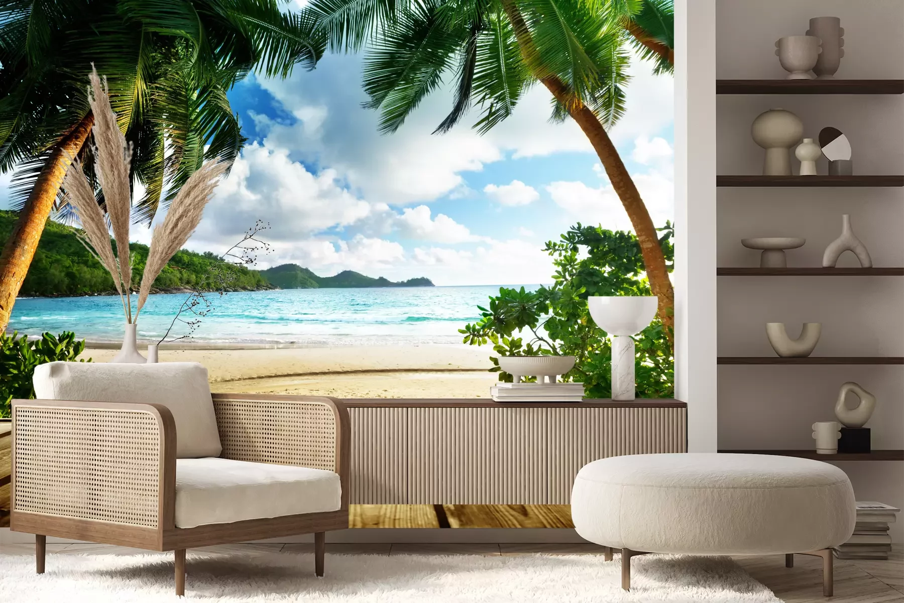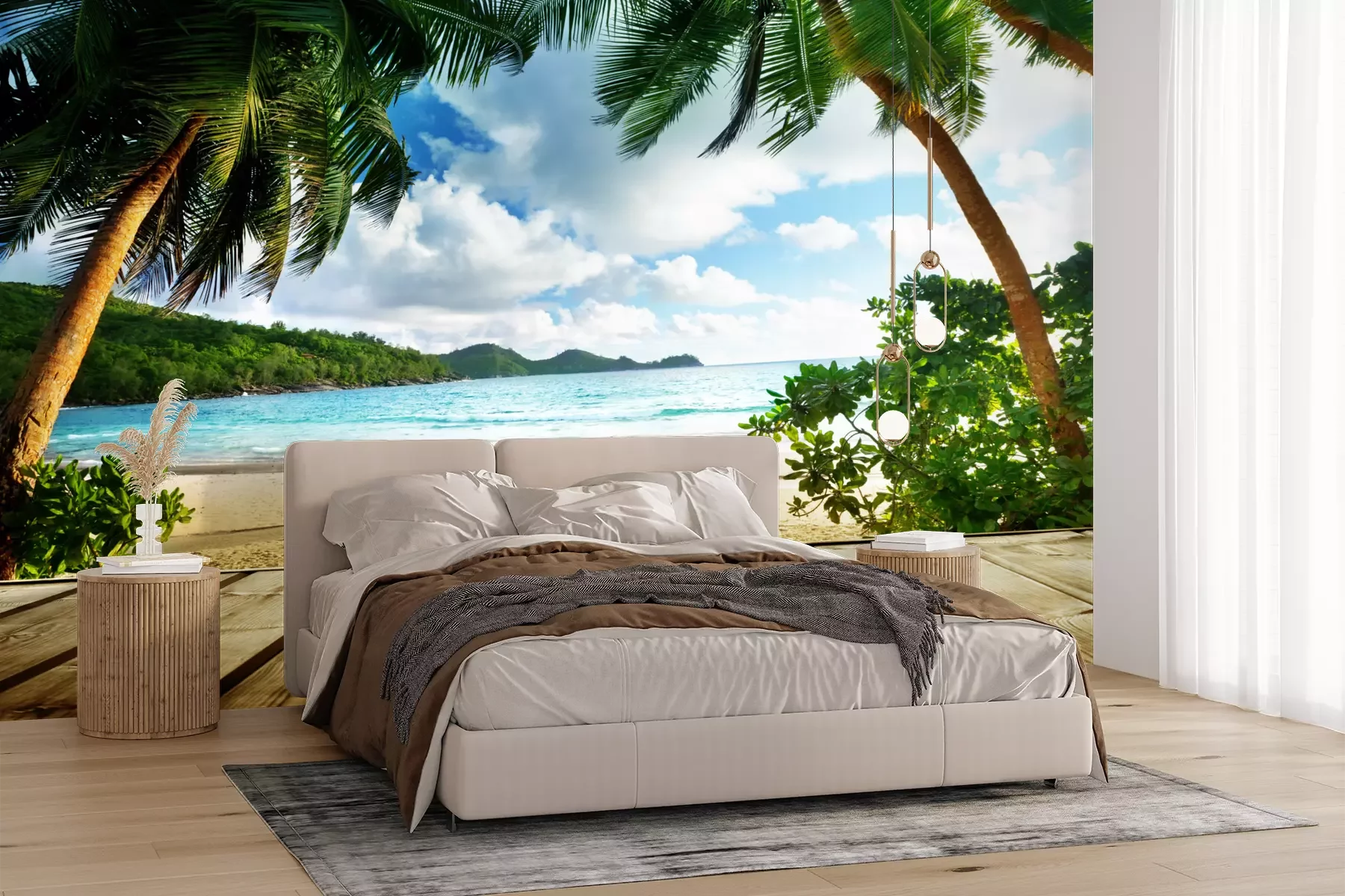 Het materiaal Premium+ is een gestructureerd vinyl op vlies met een gewicht van 255 g/m², dat kleine oneffenheden in de muur effectief camoufleert. De subtiele structuur van fijn zand geeft het oppervlak een exclusieve uitstraling, terwijl de halfmatte afwerking de diepte van de kleuren benadrukt. Het materiaal is dampdoorlatend, waardoor het ook in de keuken en badkamer kan worden gebruikt. De maximale breedte van één baan bedraagt 100 cm – bij grotere afmetingen wordt het fotobehang in meerdere gelijke banen verdeeld. De lijm wordt direct op de muur aangebracht en het behang wordt rand-aan-rand geplakt, wat zorgt voor een esthetisch resultaat zonder zichtbare naden. Het oppervlak kan gemakkelijk worden schoongemaakt door het voorzichtig af te nemen met een vochtige doek.