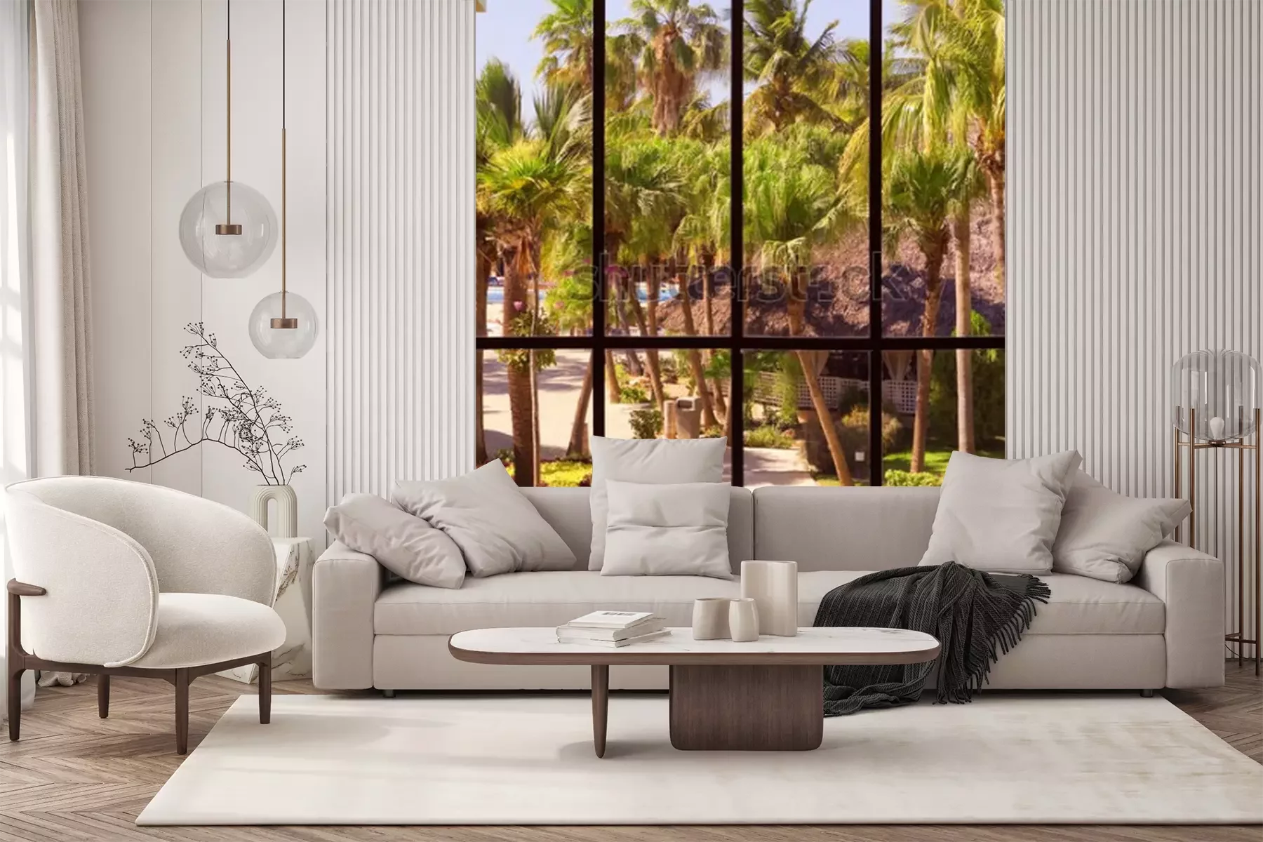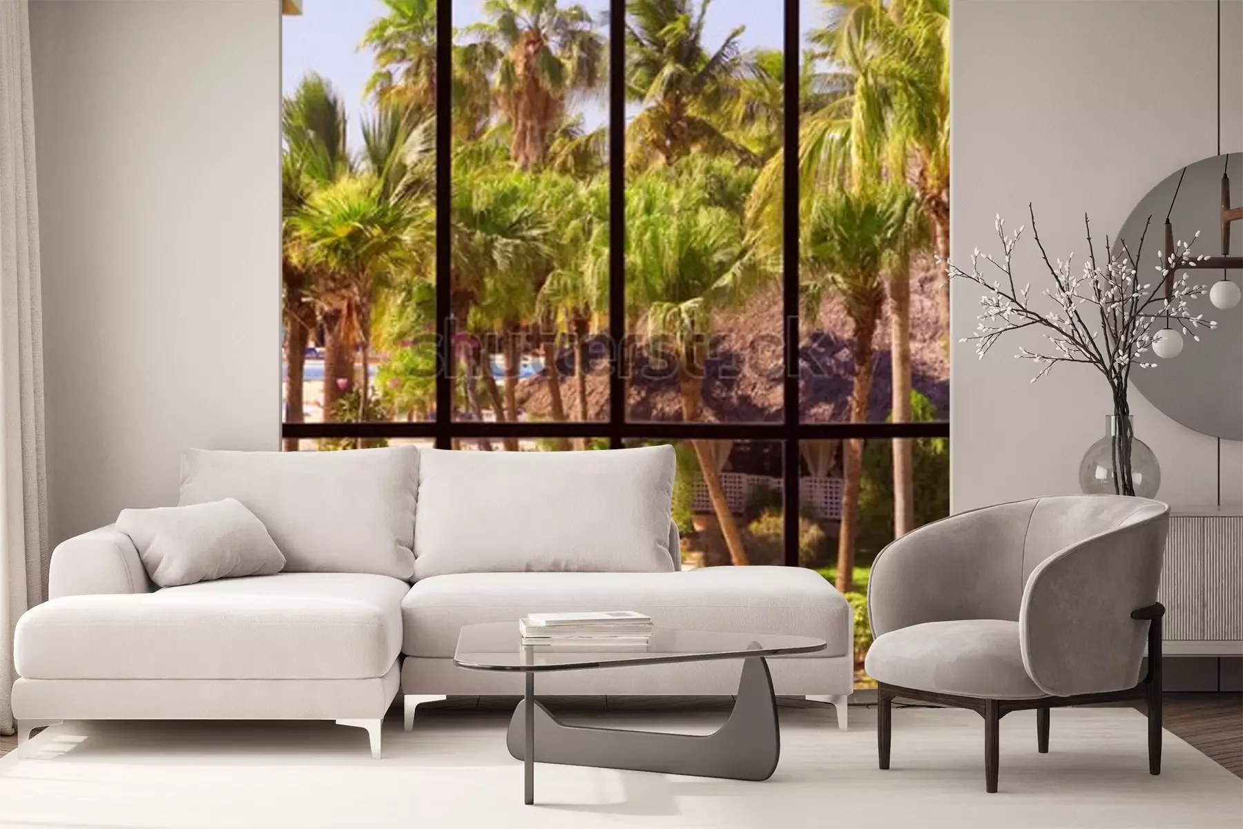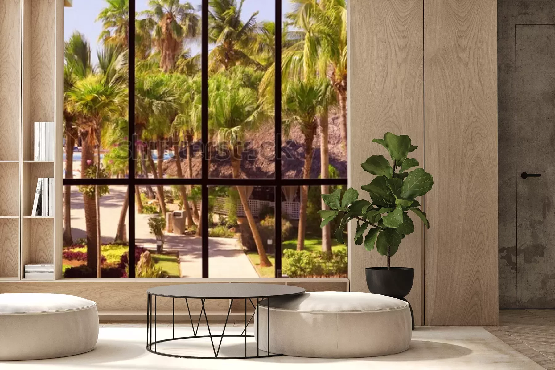 Fotobehang Uitzicht op een tropische tuin door een panoramisch raam