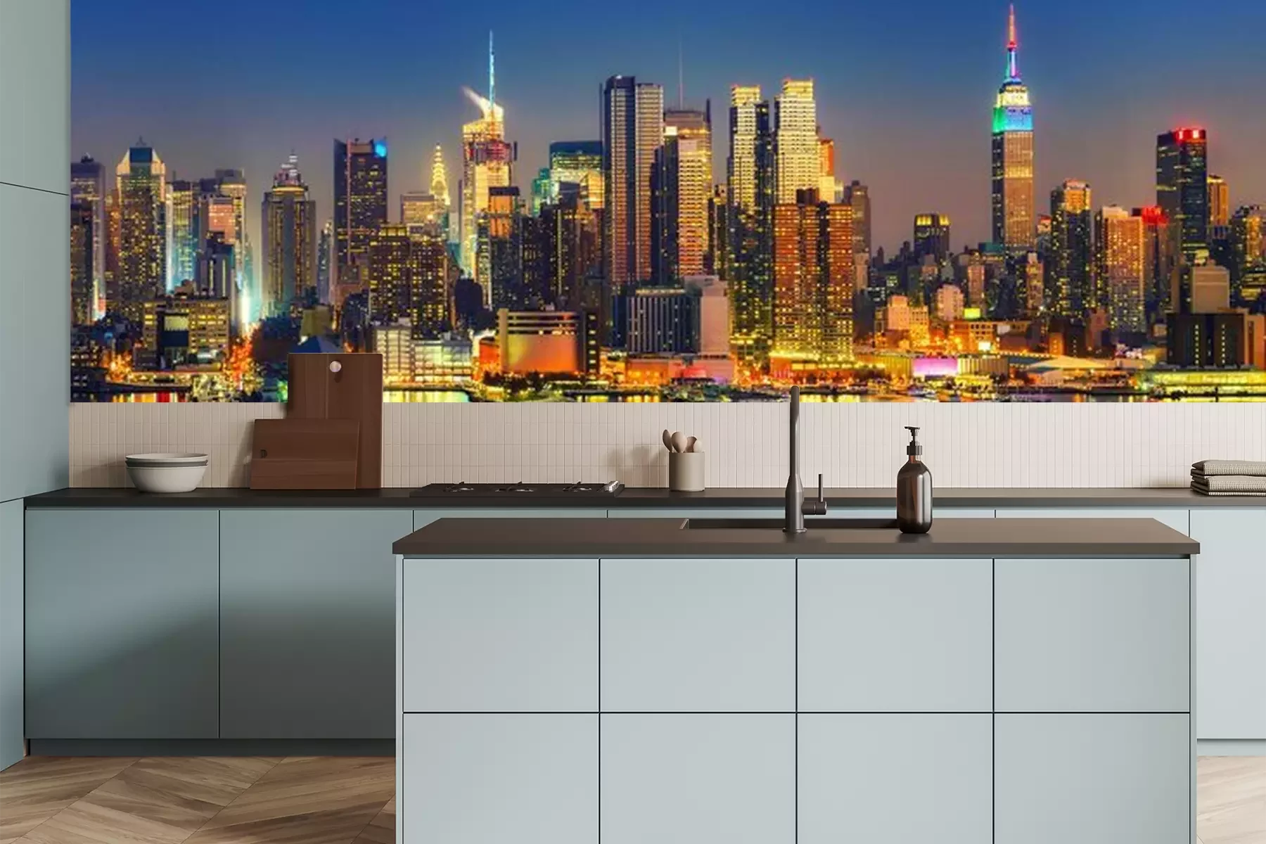 Het materiaal Premium is een glad vinyl op vlies, dat bestand is tegen uitrekken en vervorming. Het is dampdoorlatend – de muren kunnen vrij ademen – waardoor het geschikt is voor gebruik in de keuken en badkamer. Bij vervuiling kan het materiaal worden afgenomen met een vochtige doek. De maximale breedte van één baan bedraagt 95 of 105 cm, afhankelijk van de beschikbaarheid. Montage vindt plaats met de rand-aan-rand methode, wat een esthetisch resultaat zonder zichtbare naden oplevert. Omdat de lijm rechtstreeks op de muur wordt aangebracht, verloopt de installatie van het fotobehang snel en eenvoudig.