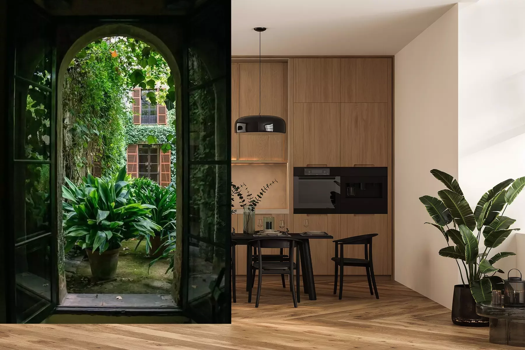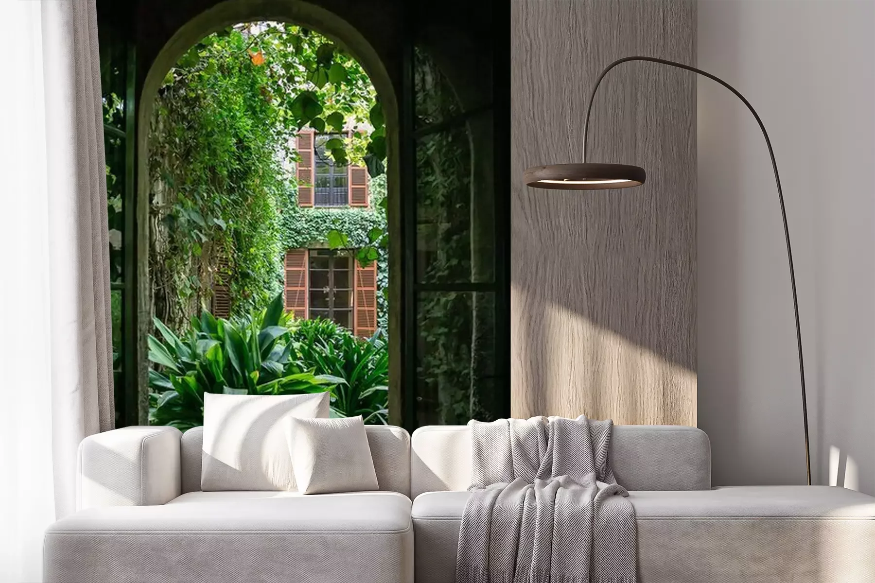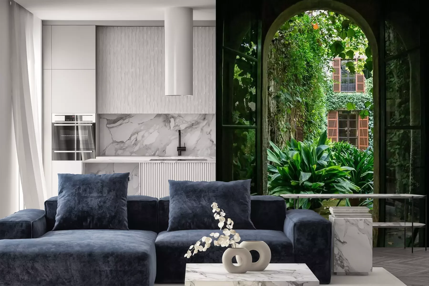 Fotobehang Uitzicht vanaf het open raam naar de tuin.