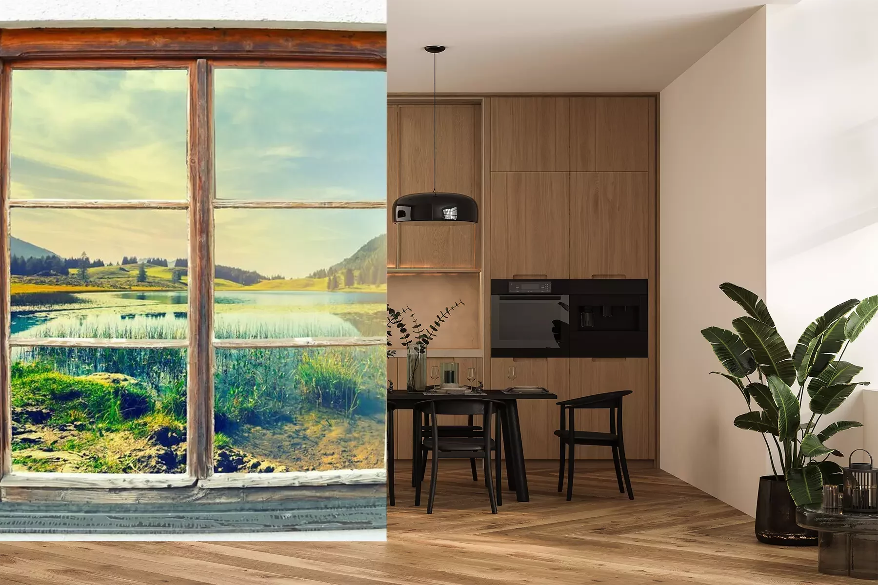 Uitzicht door het houten raam naar de bergenFotobehang