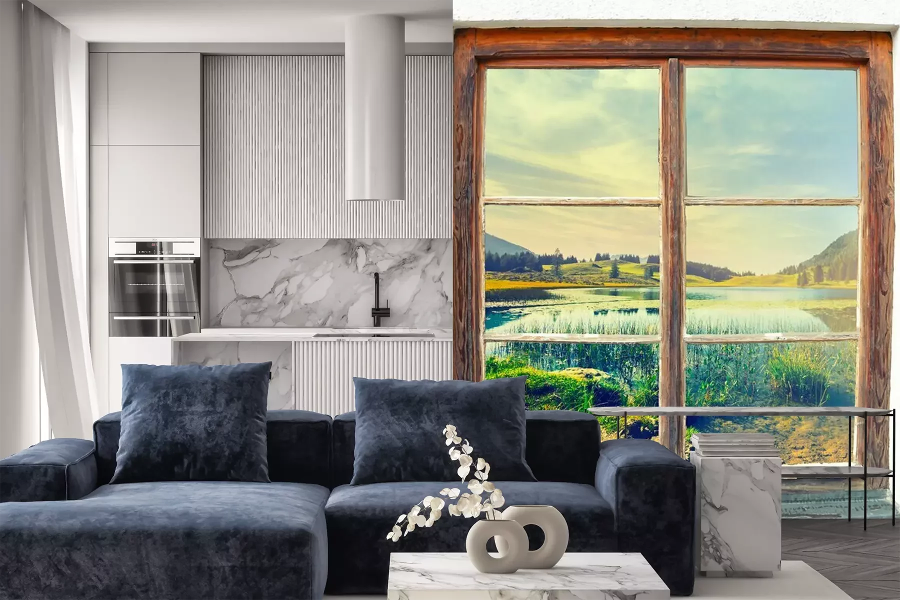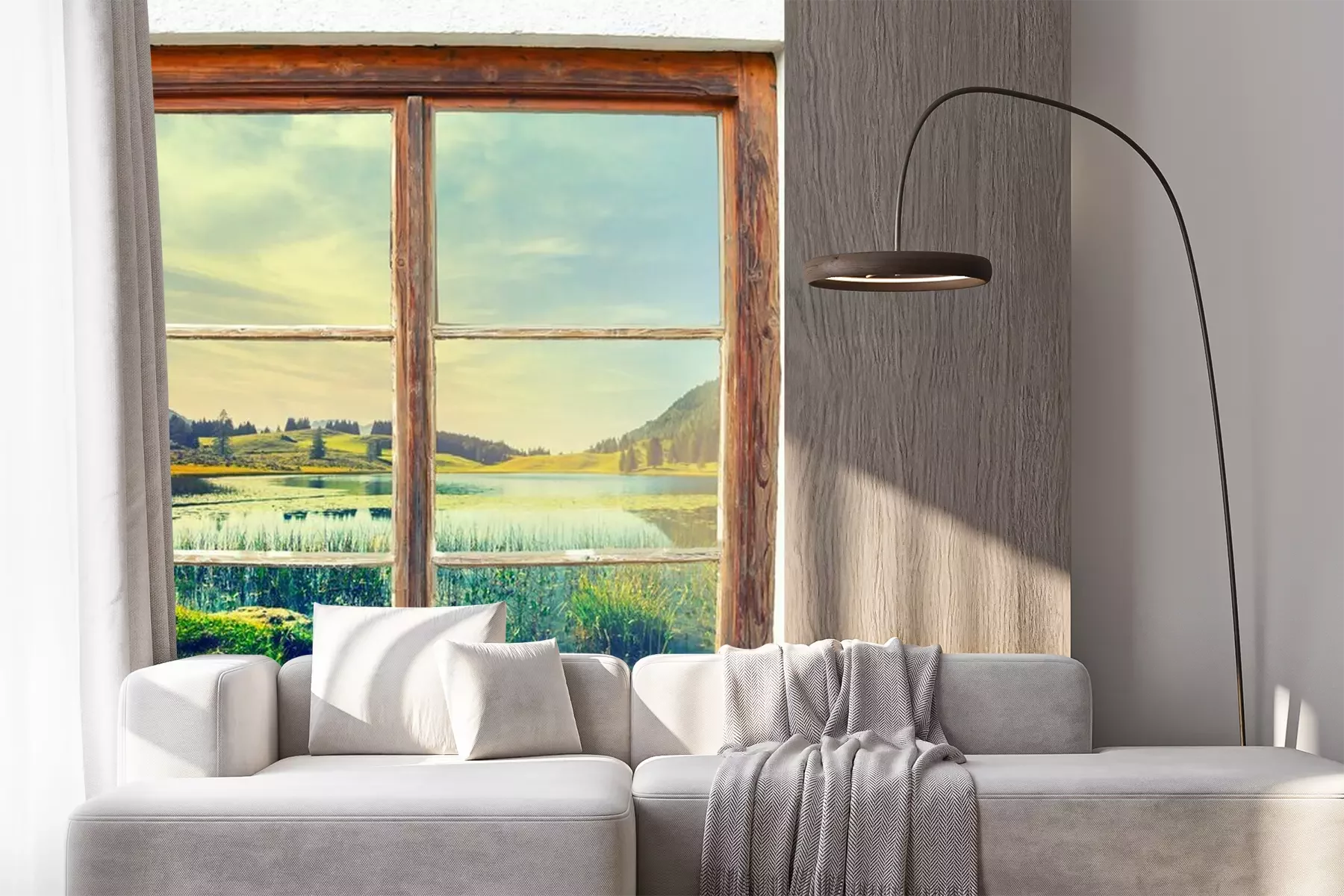 Uitzicht vanuit het raam op de bergenFotobehang