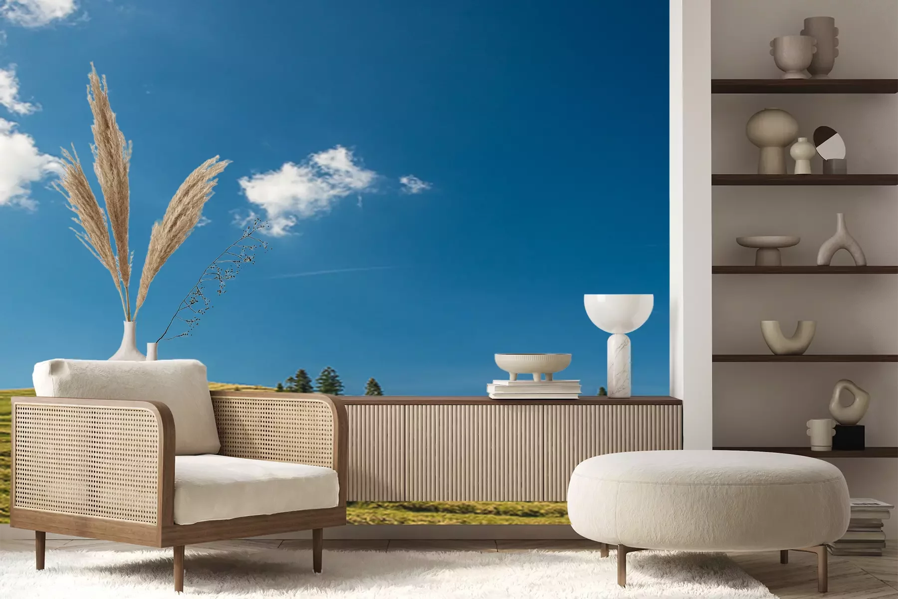 Het materiaal Premium+ is een gestructureerd vinyl op vlies met een gewicht van 255 g/m², dat kleine oneffenheden in de muur effectief camoufleert. De subtiele structuur van fijn zand geeft het oppervlak een exclusieve uitstraling, terwijl de halfmatte afwerking de diepte van de kleuren benadrukt. Het materiaal is dampdoorlatend, waardoor het ook in de keuken en badkamer kan worden gebruikt. De maximale breedte van één baan bedraagt 100 cm – bij grotere afmetingen wordt het fotobehang in meerdere gelijke banen verdeeld. De lijm wordt direct op de muur aangebracht en het behang wordt rand-aan-rand geplakt, wat zorgt voor een esthetisch resultaat zonder zichtbare naden. Het oppervlak kan gemakkelijk worden schoongemaakt door het voorzichtig af te nemen met een vochtige doek.