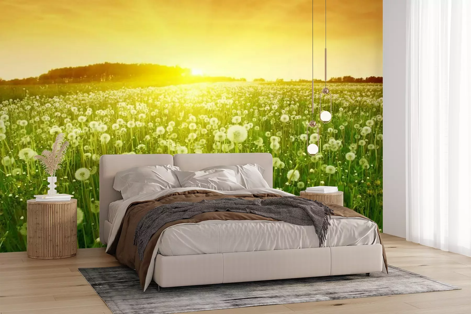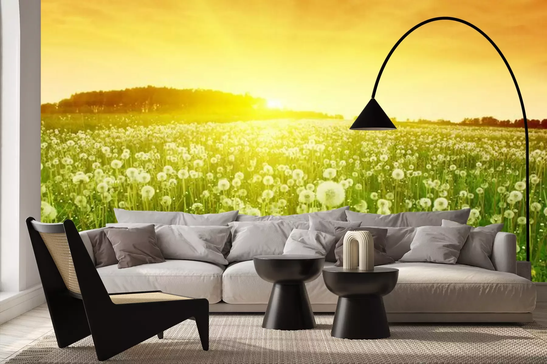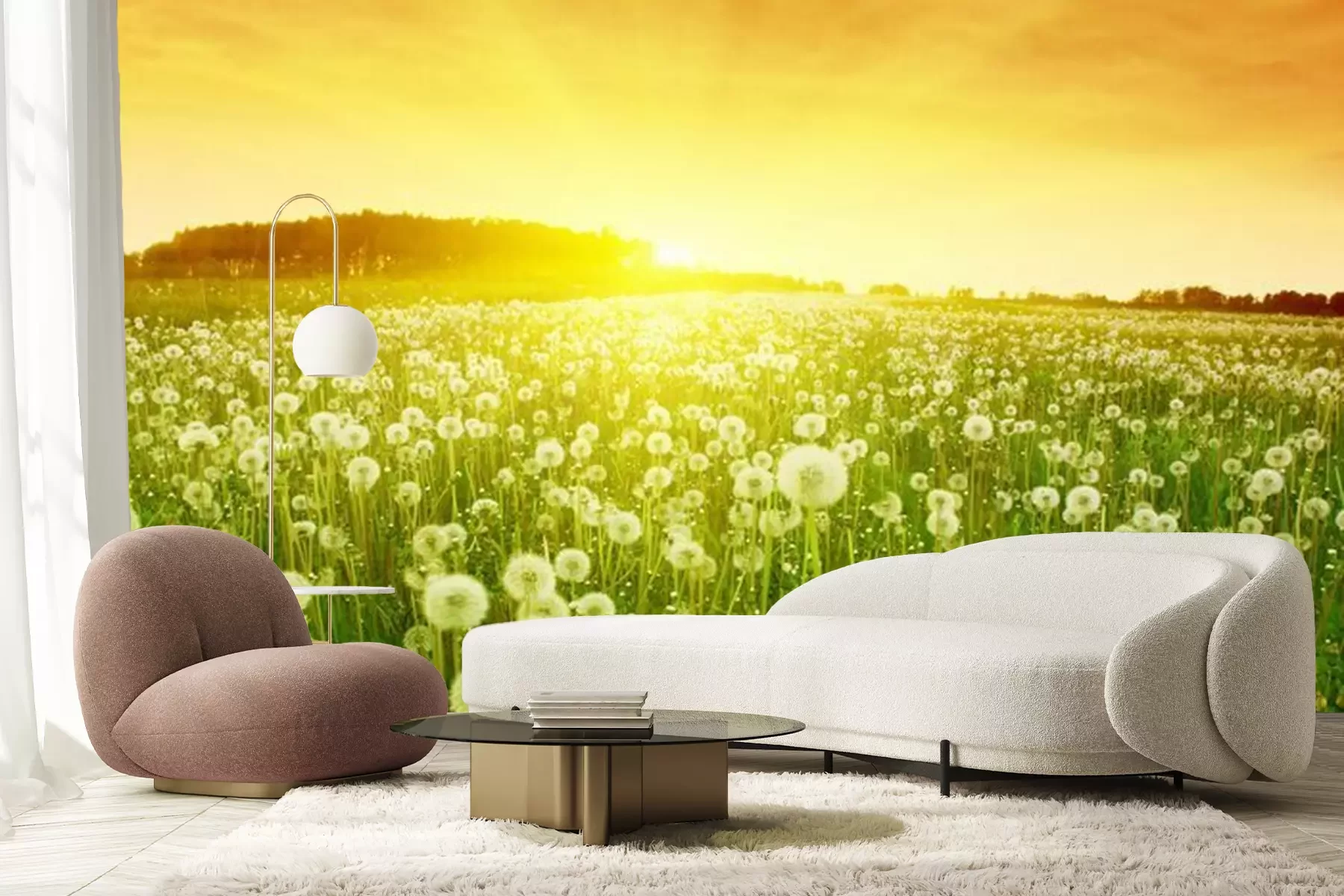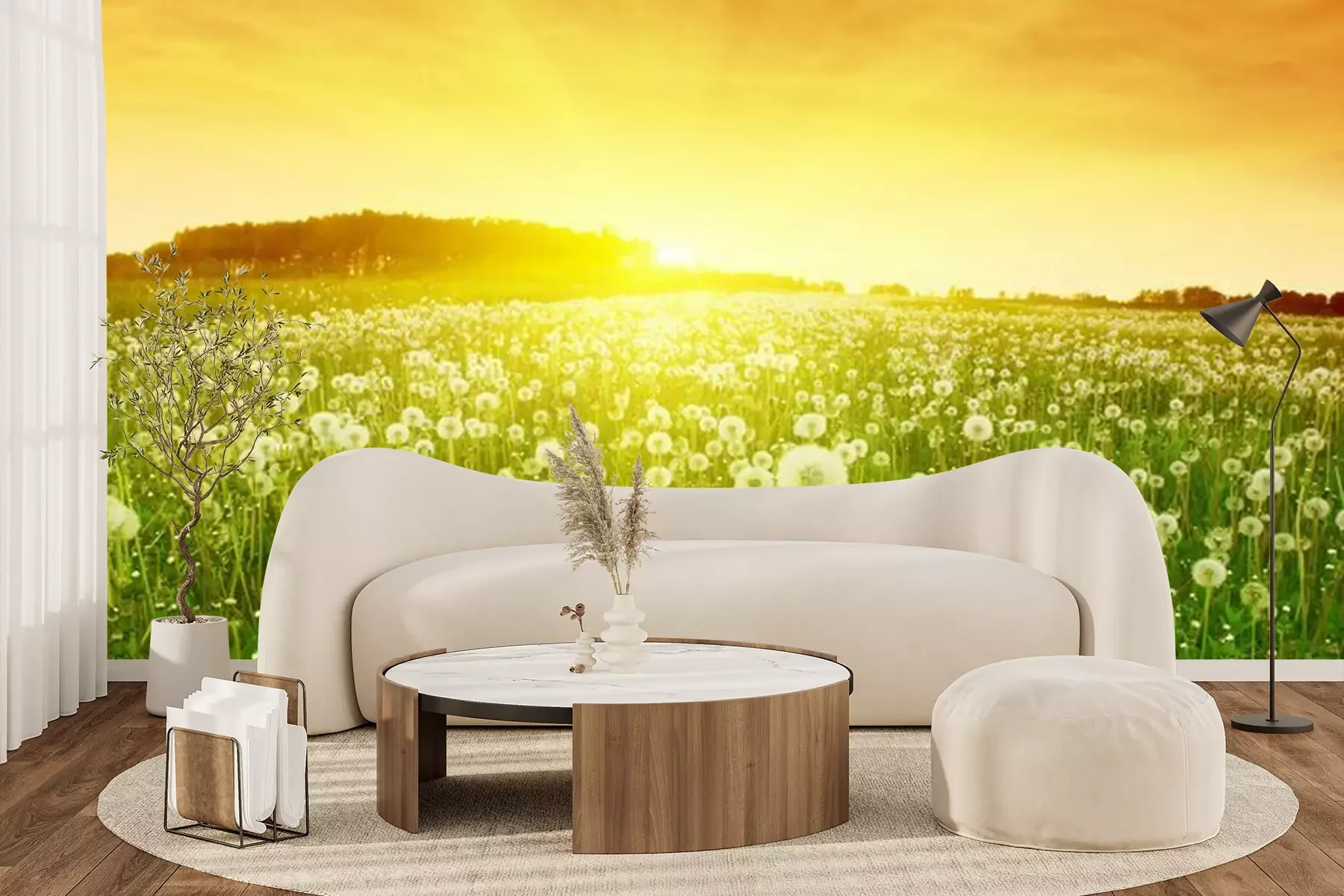 Fotobehang Veld met paardenbloemen bij zonsondergang