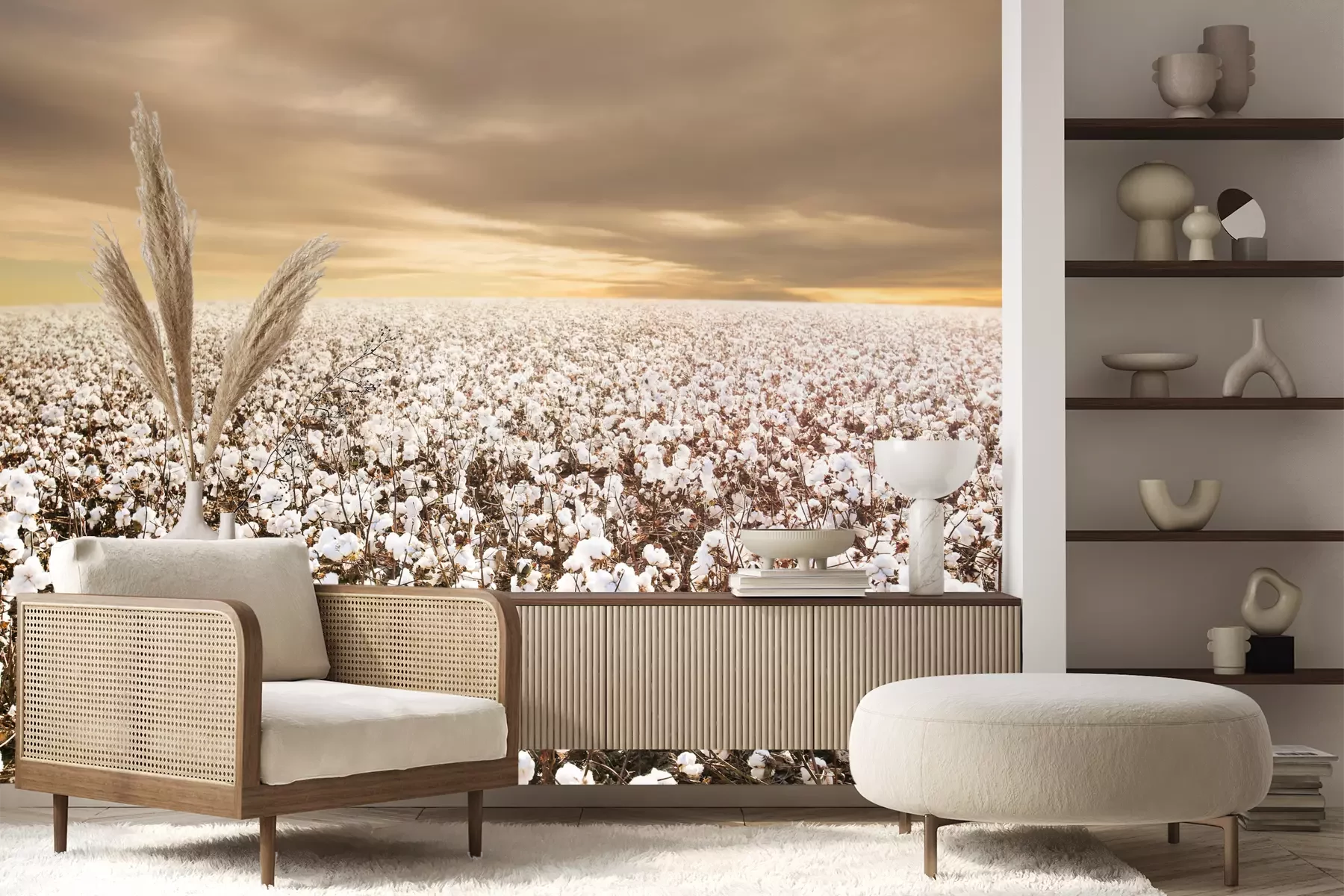 Het materiaal Premium+ is een gestructureerd vinyl op vlies met een gewicht van 255 g/m², dat kleine oneffenheden in de muur effectief camoufleert. De subtiele structuur van fijn zand geeft het oppervlak een exclusieve uitstraling, terwijl de halfmatte afwerking de diepte van de kleuren benadrukt. Het materiaal is dampdoorlatend, waardoor het ook in de keuken en badkamer kan worden gebruikt. De maximale breedte van één baan bedraagt 100 cm – bij grotere afmetingen wordt het fotobehang in meerdere gelijke banen verdeeld. De lijm wordt direct op de muur aangebracht en het behang wordt rand-aan-rand geplakt, wat zorgt voor een esthetisch resultaat zonder zichtbare naden. Het oppervlak kan gemakkelijk worden schoongemaakt door het voorzichtig af te nemen met een vochtige doek.
