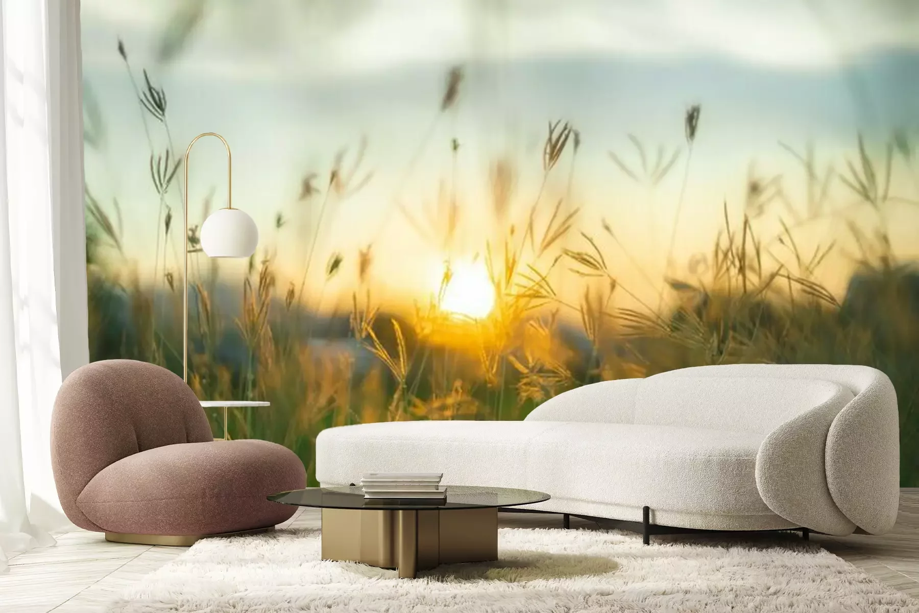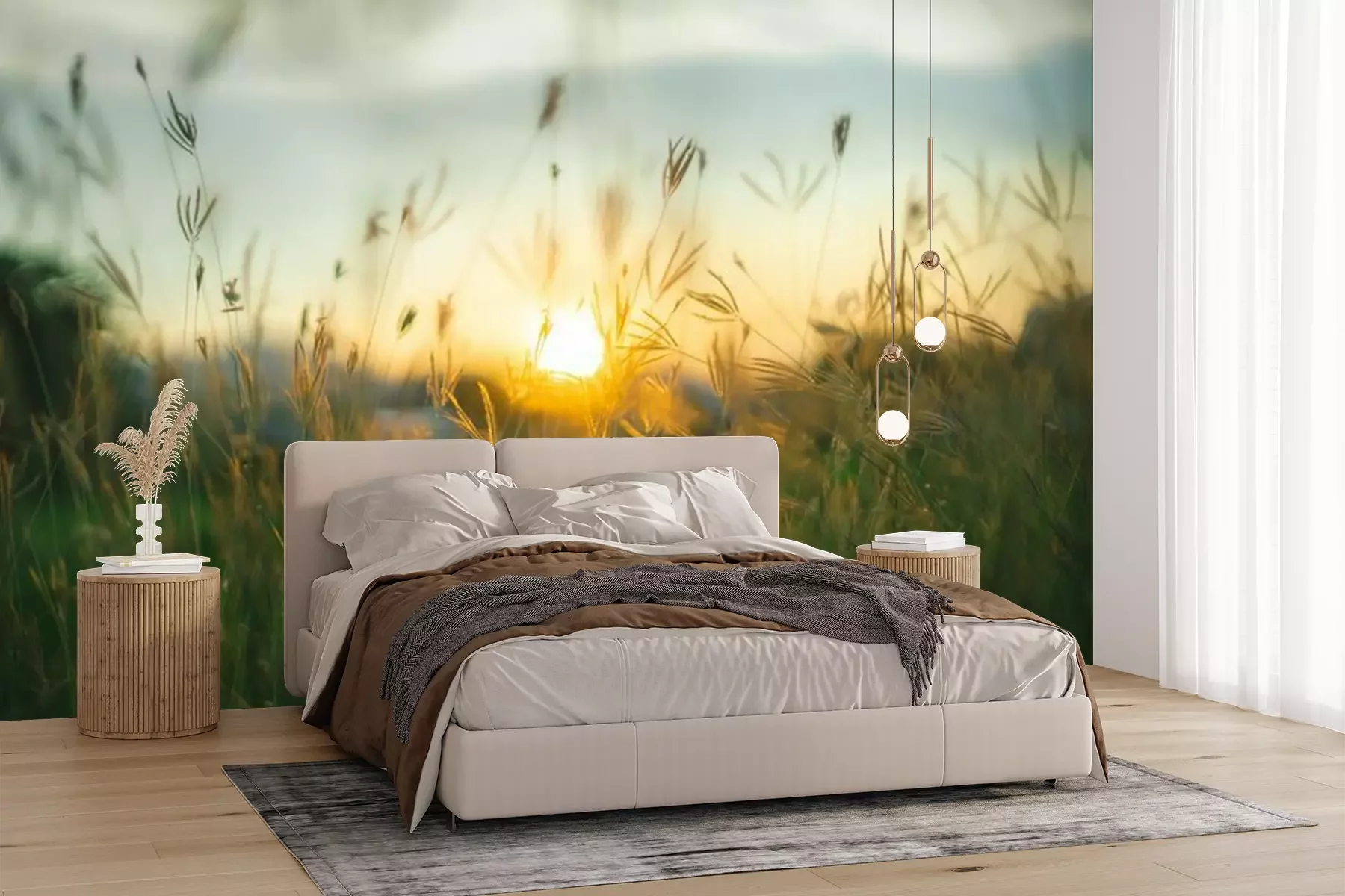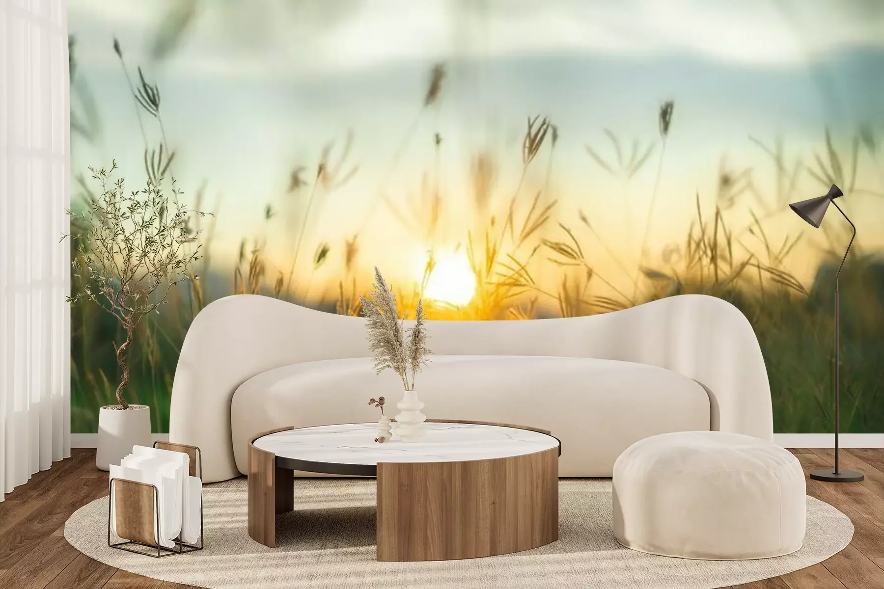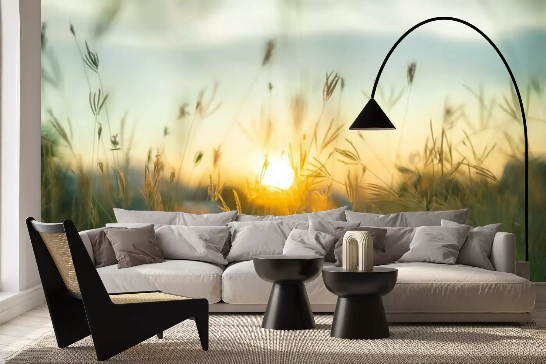 Fotobehang Veldgrassen op een achtergrond van zonsondergang