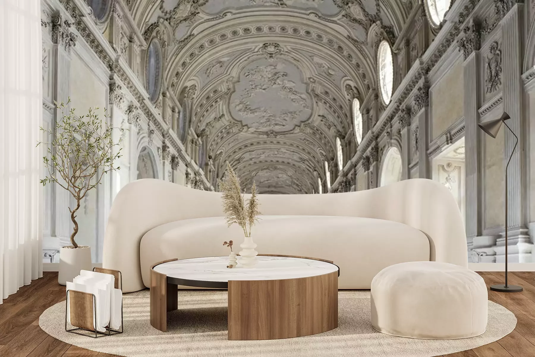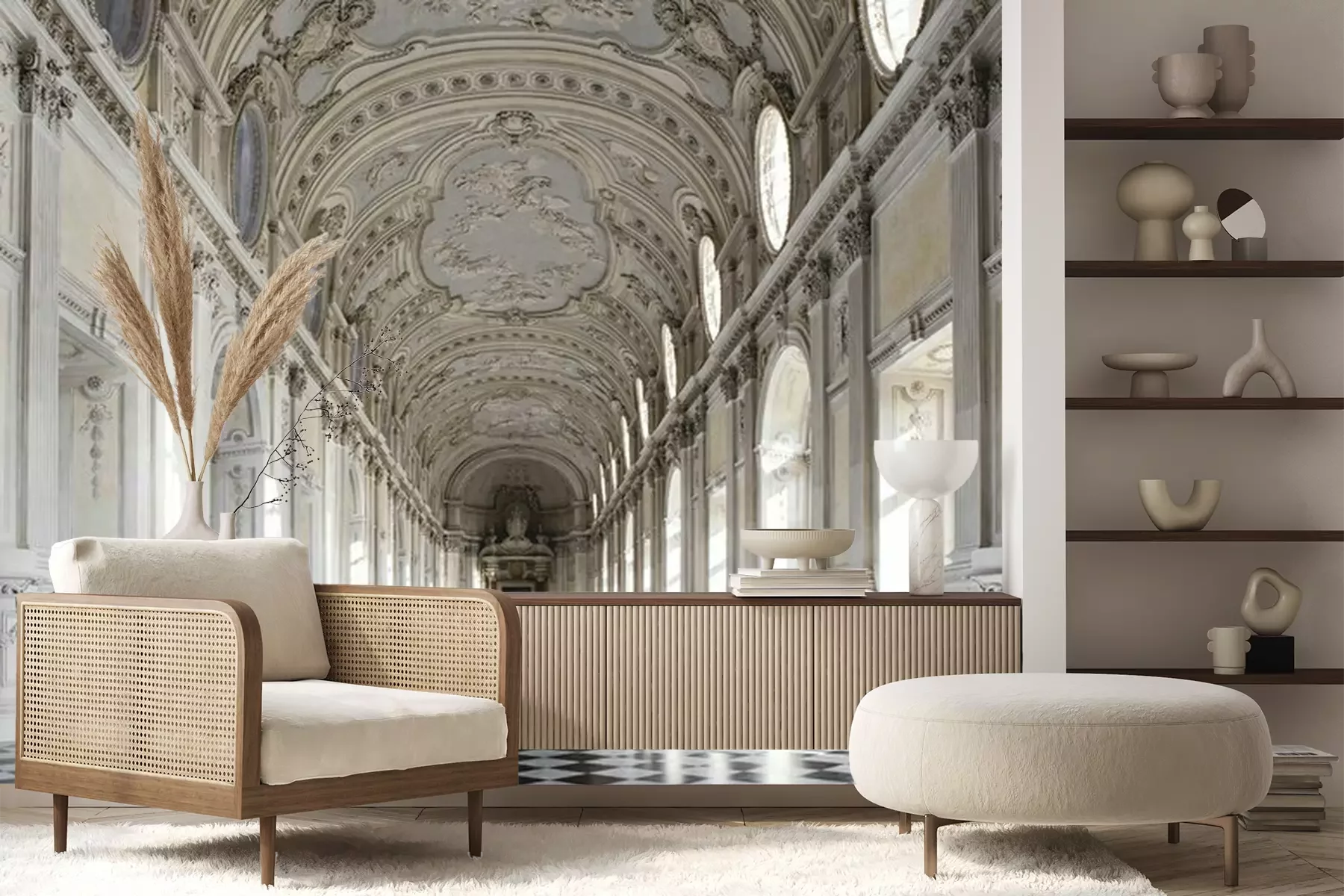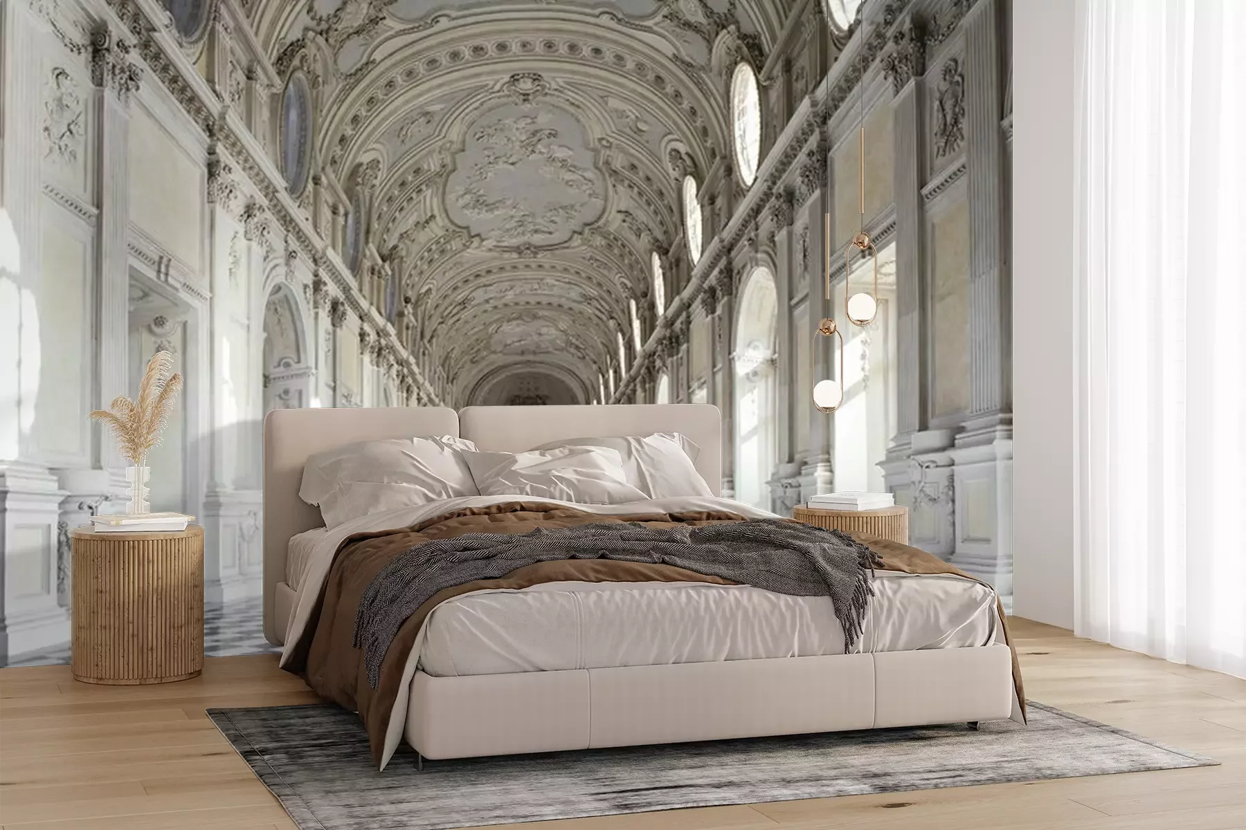 Het materiaal Premium+ is een gestructureerd vinyl op vlies met een gewicht van 255 g/m², dat kleine oneffenheden in de muur effectief camoufleert. De subtiele structuur van fijn zand geeft het oppervlak een exclusieve uitstraling, terwijl de halfmatte afwerking de diepte van de kleuren benadrukt. Het materiaal is dampdoorlatend, waardoor het ook in de keuken en badkamer kan worden gebruikt. De maximale breedte van één baan bedraagt 100 cm – bij grotere afmetingen wordt het fotobehang in meerdere gelijke banen verdeeld. De lijm wordt direct op de muur aangebracht en het behang wordt rand-aan-rand geplakt, wat zorgt voor een esthetisch resultaat zonder zichtbare naden. Het oppervlak kan gemakkelijk worden schoongemaakt door het voorzichtig af te nemen met een vochtige doek.